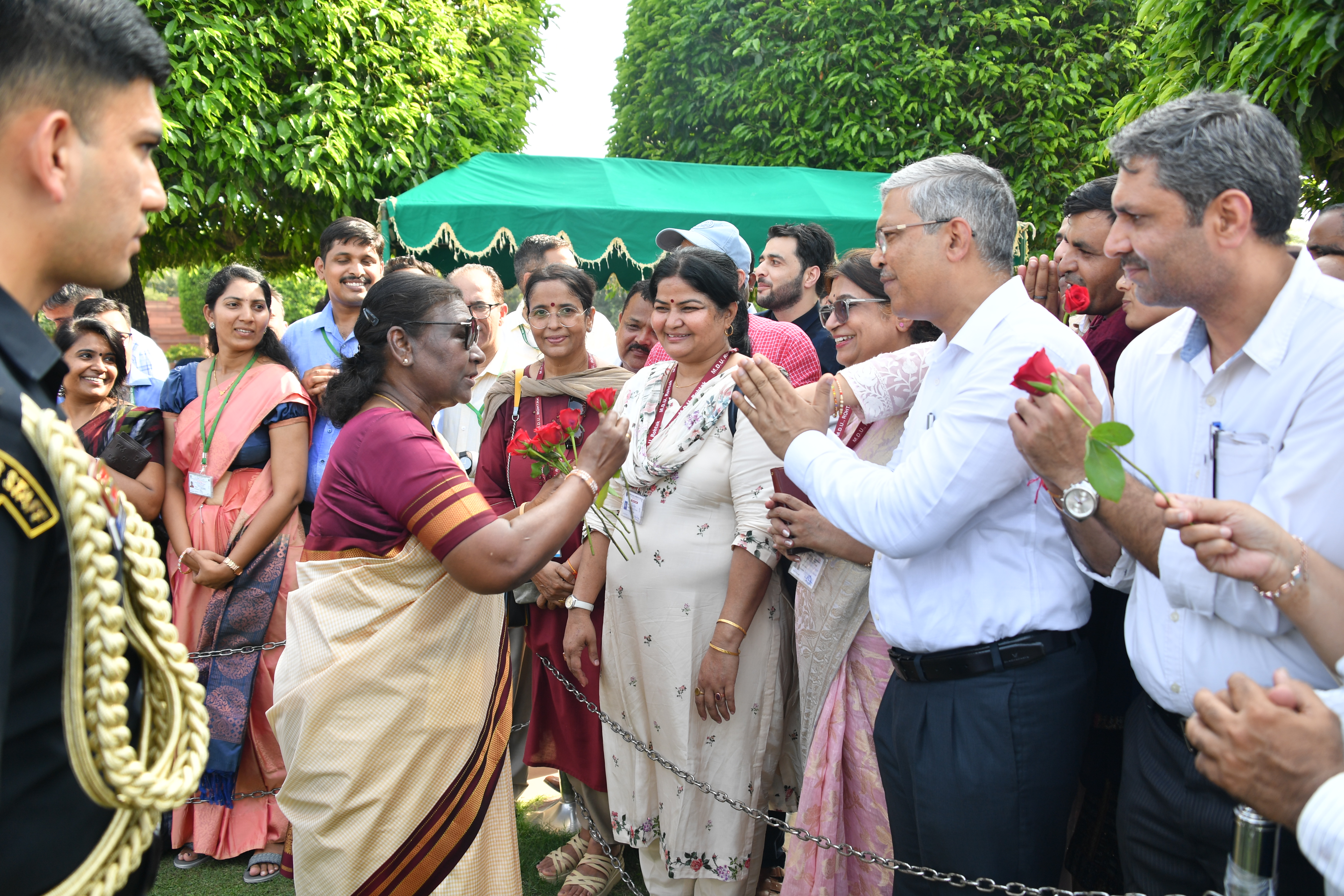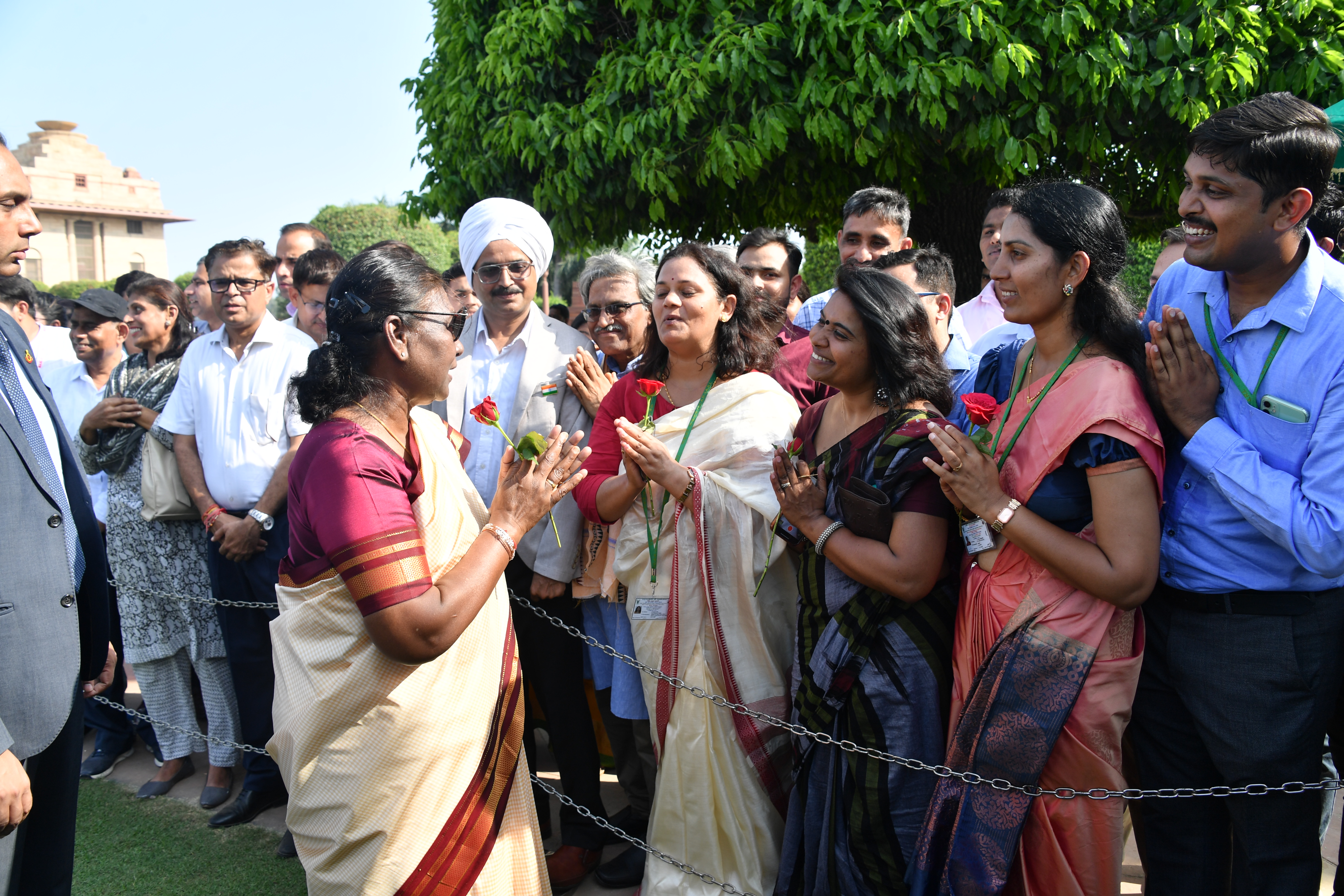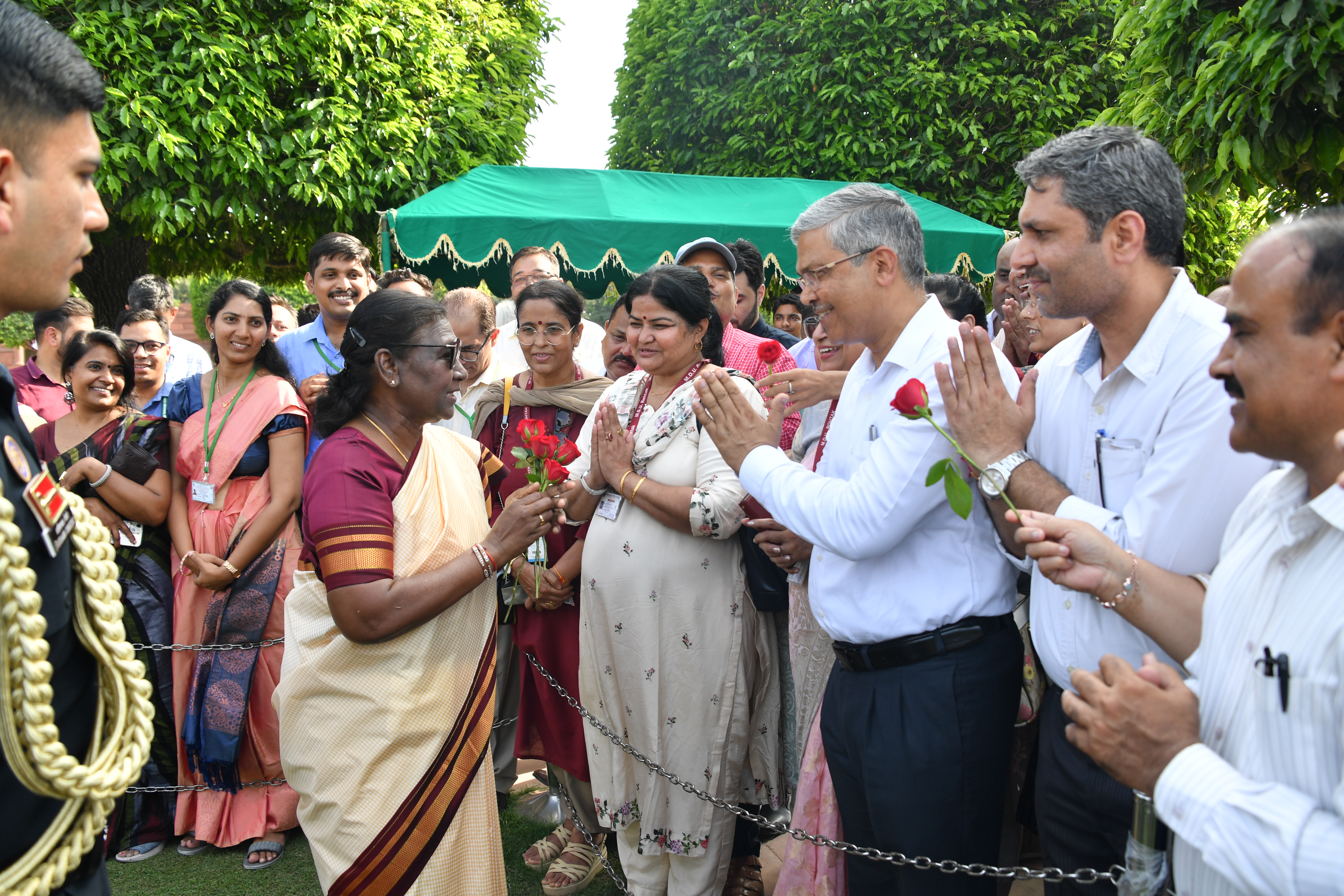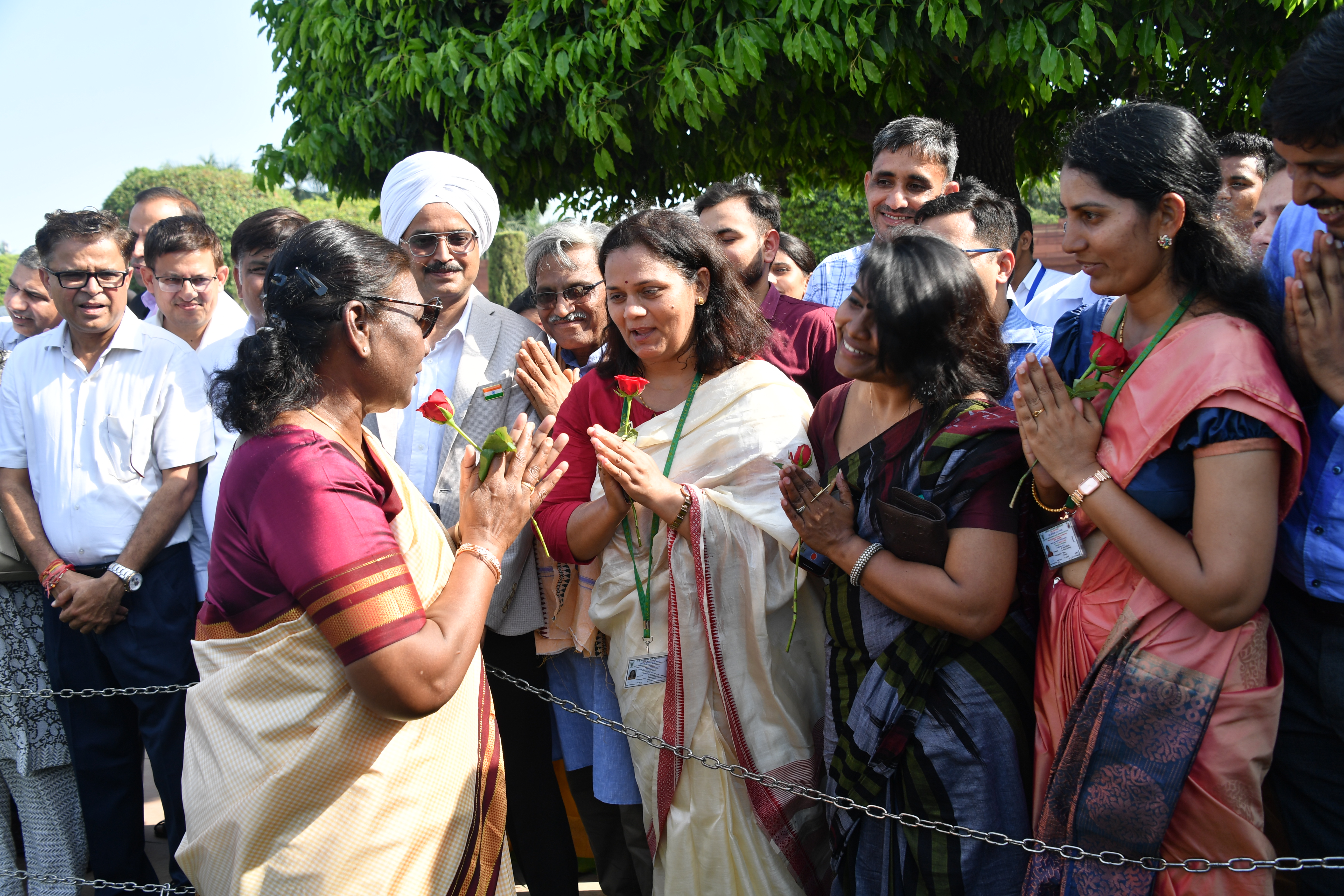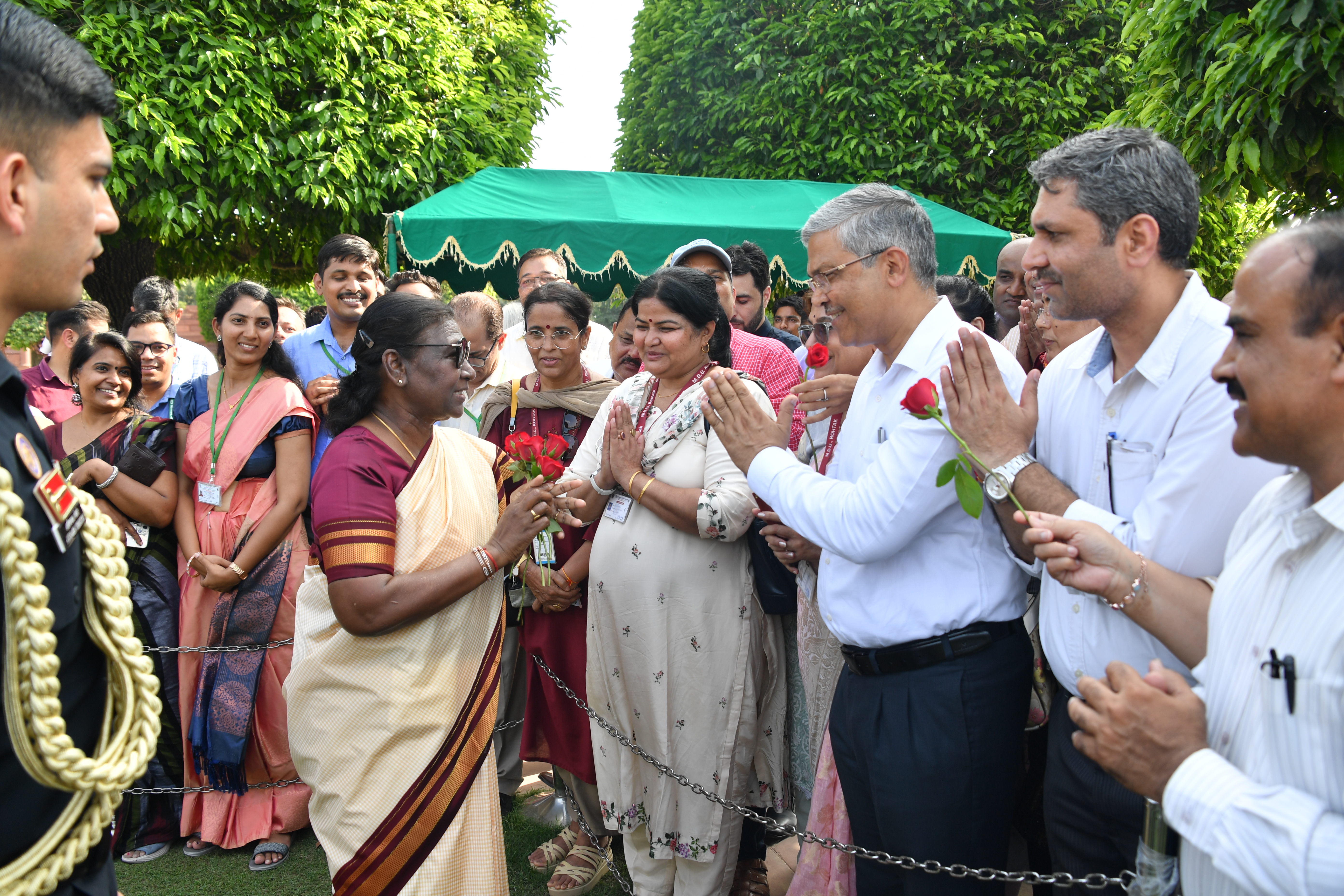 | Caption: | The President of India, Smt. Droupadi Murmu Interaction with the teachers invited to visit the Amrit Udyan as special invitees at Rashtrapati Bhavan on September 5, 2023. |