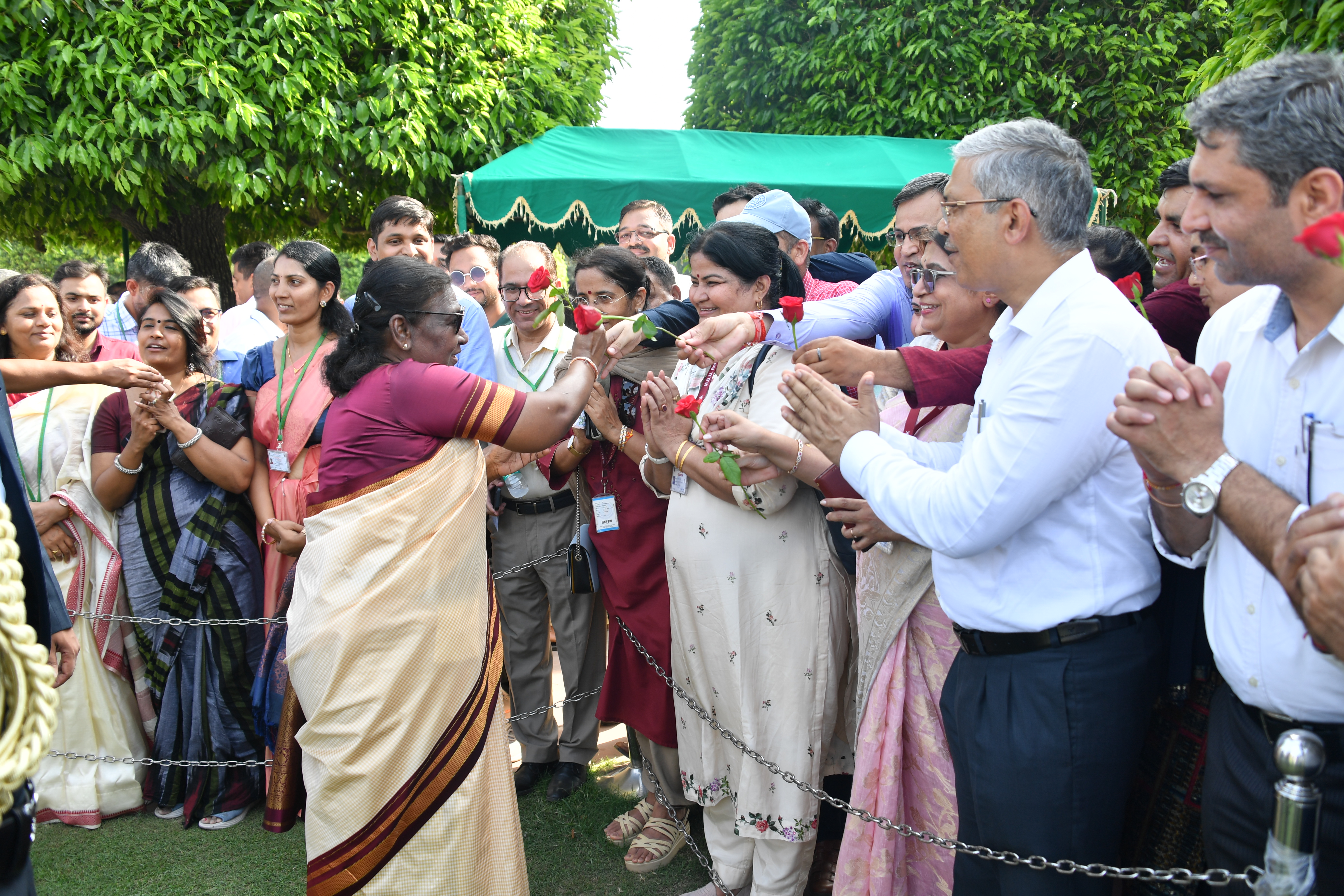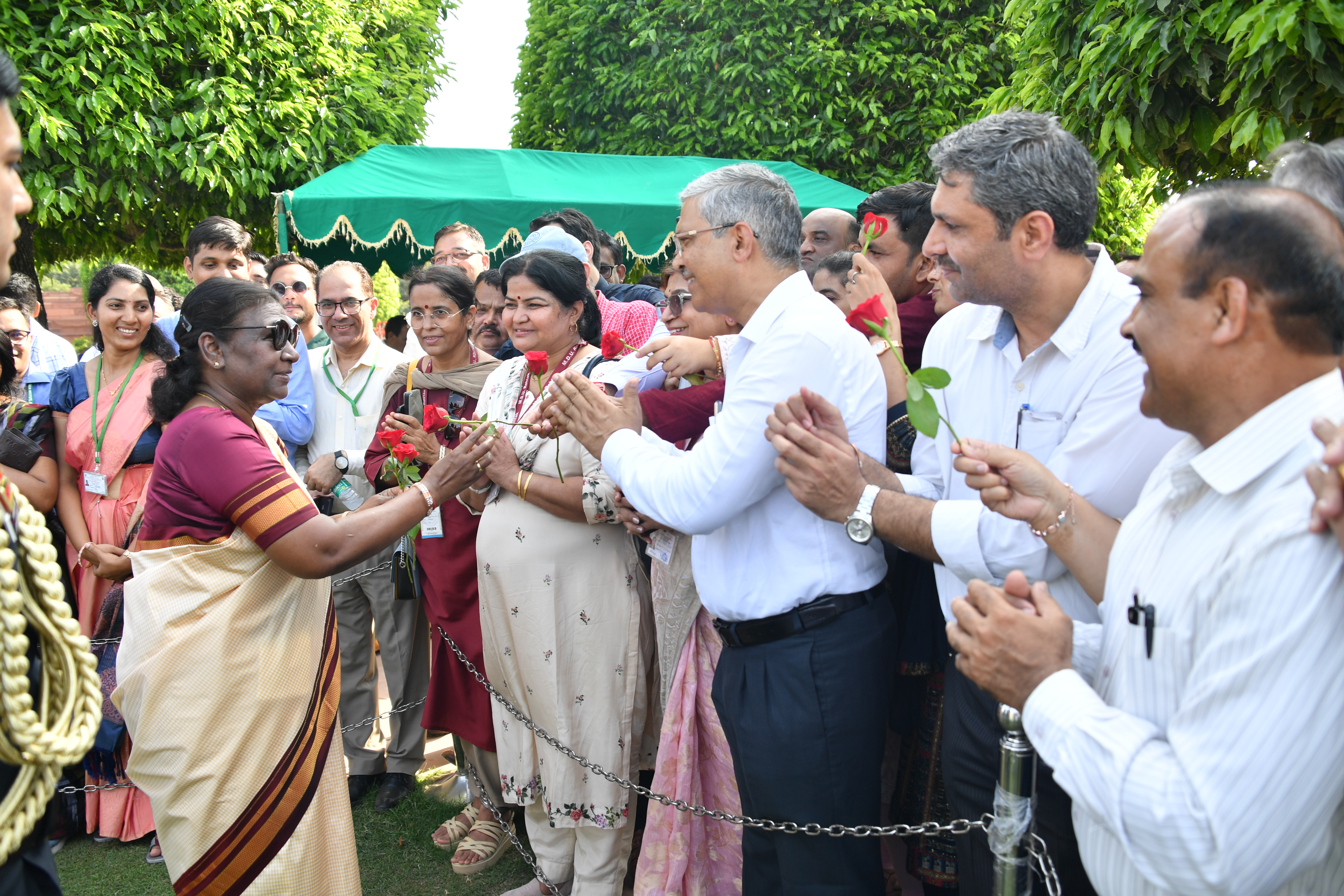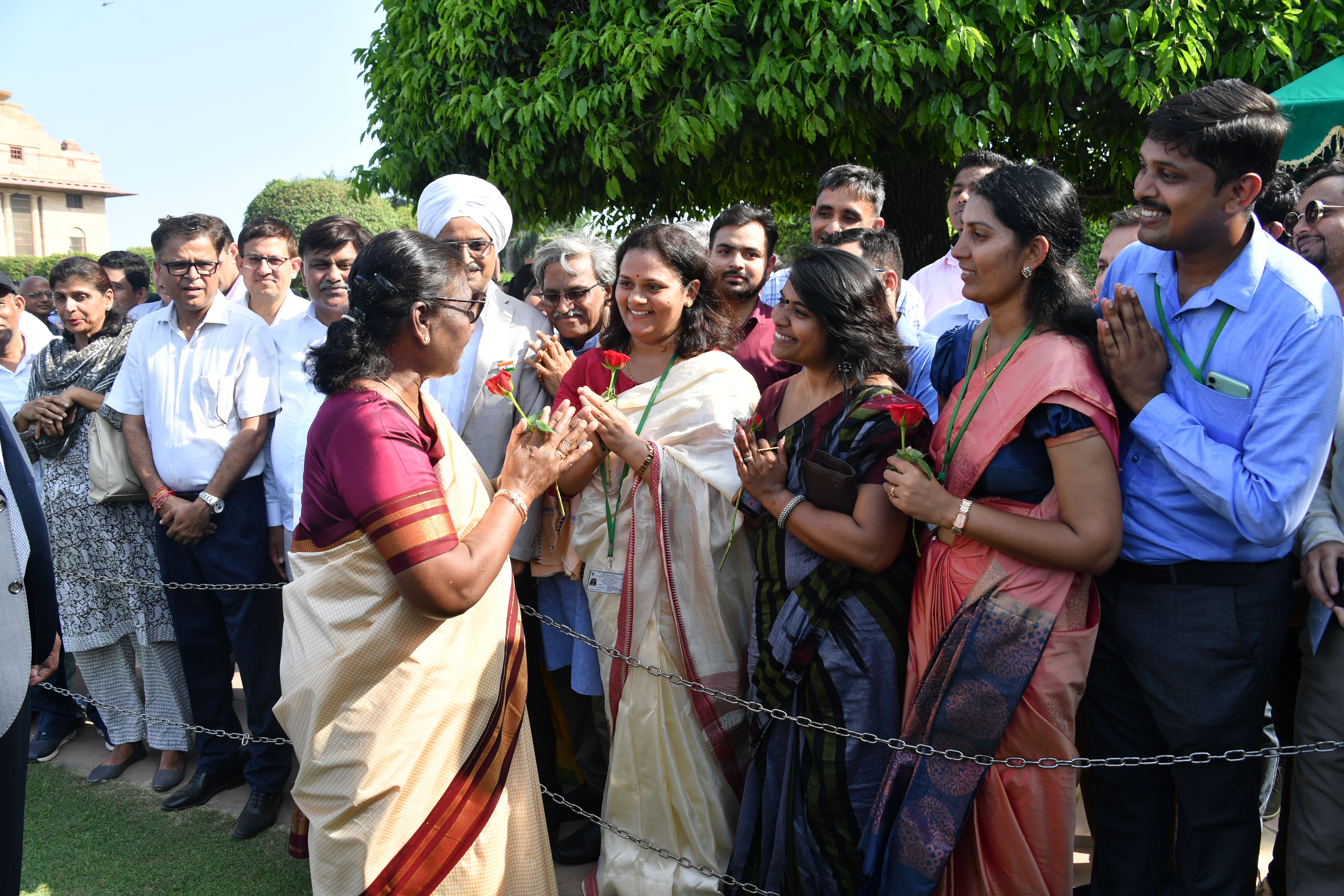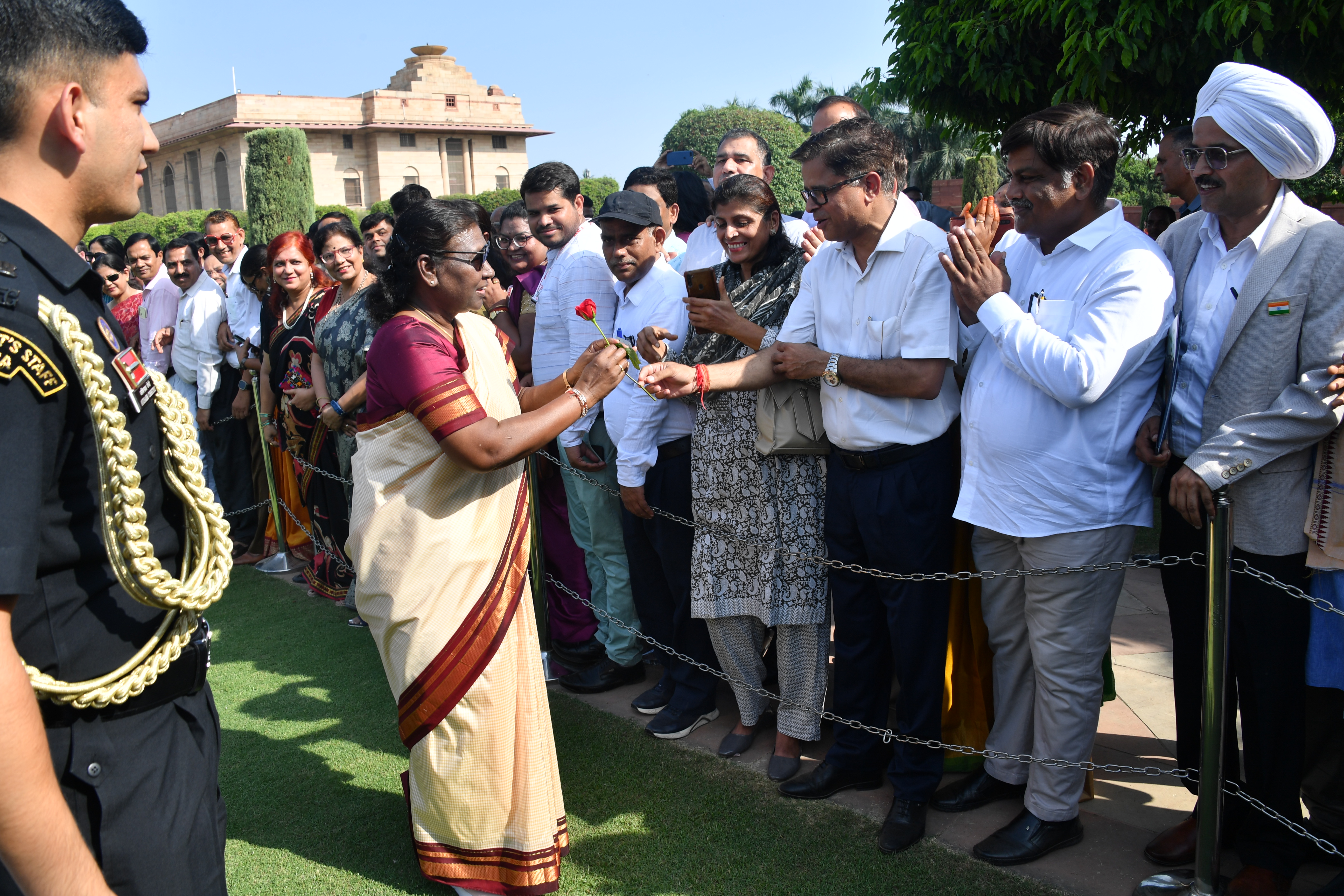 | Caption: | The President of India, Smt. Droupadi Murmu Interaction with the teachers invited to visit the Amrit Udyan as special invitees at Rashtrapati Bhavan on September 5, 2023. |