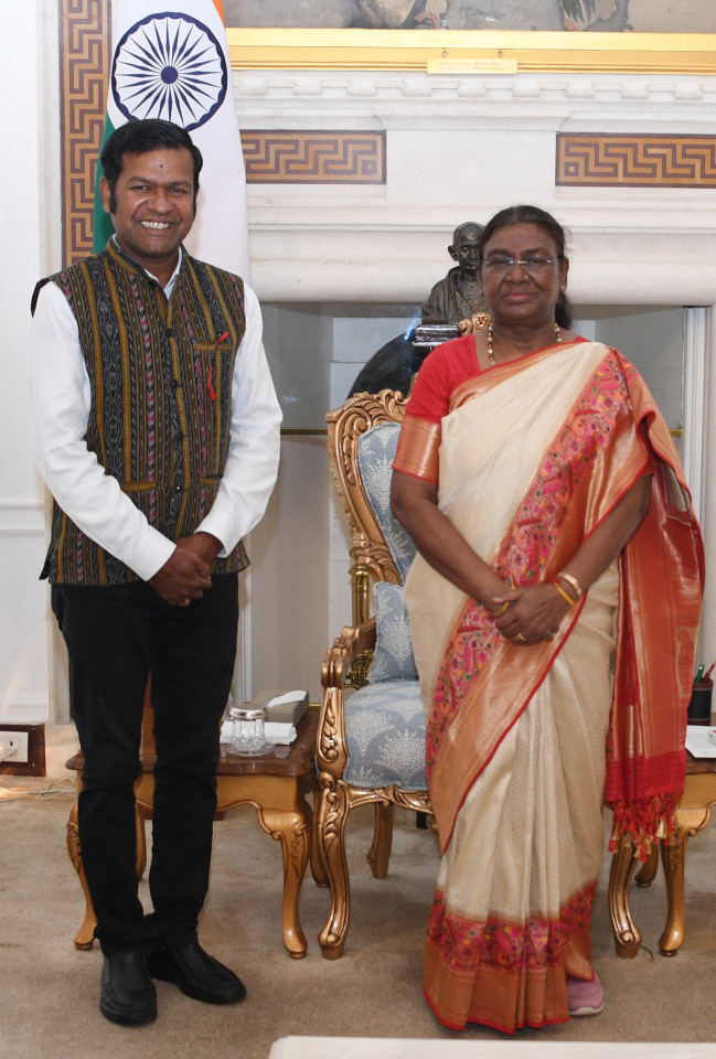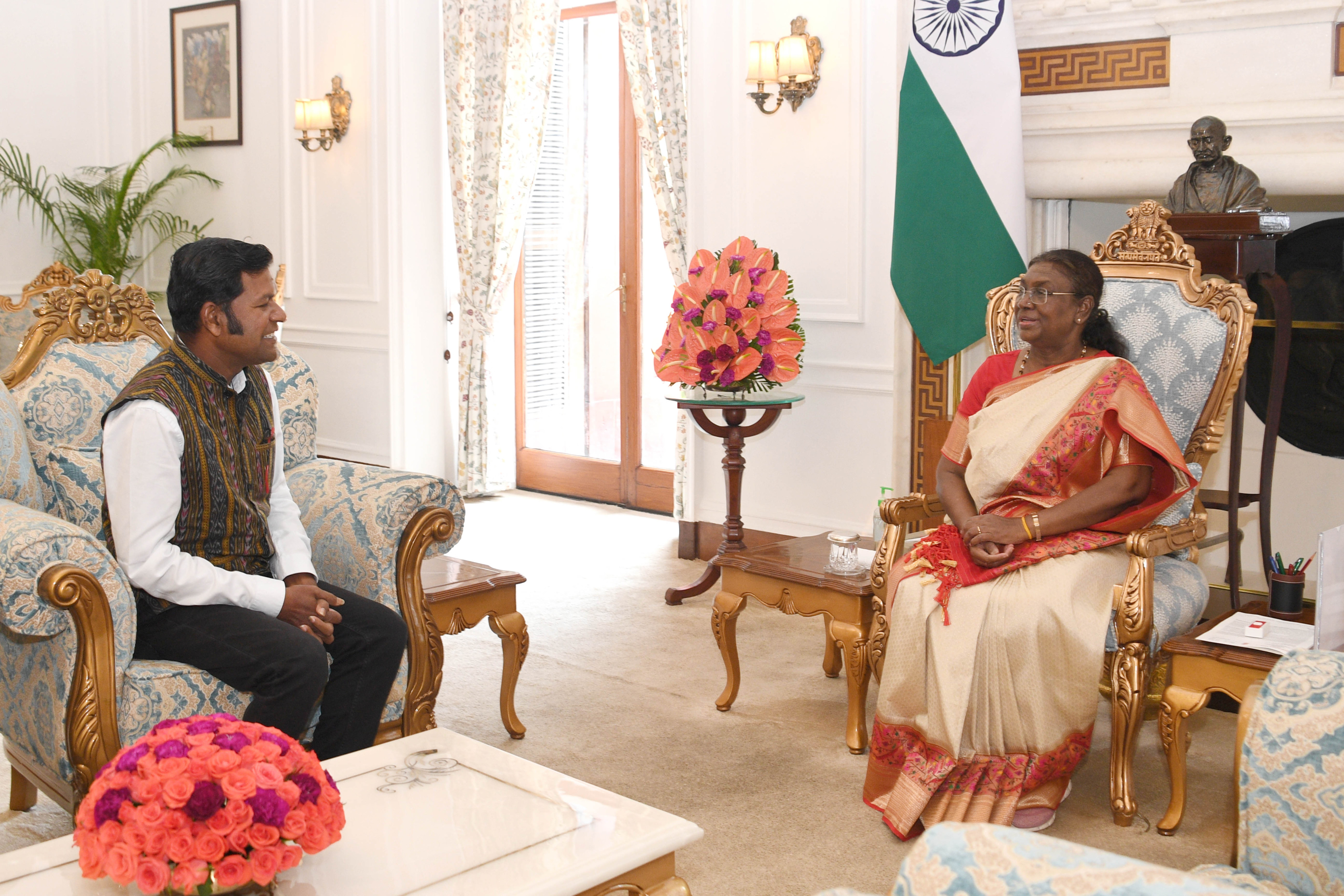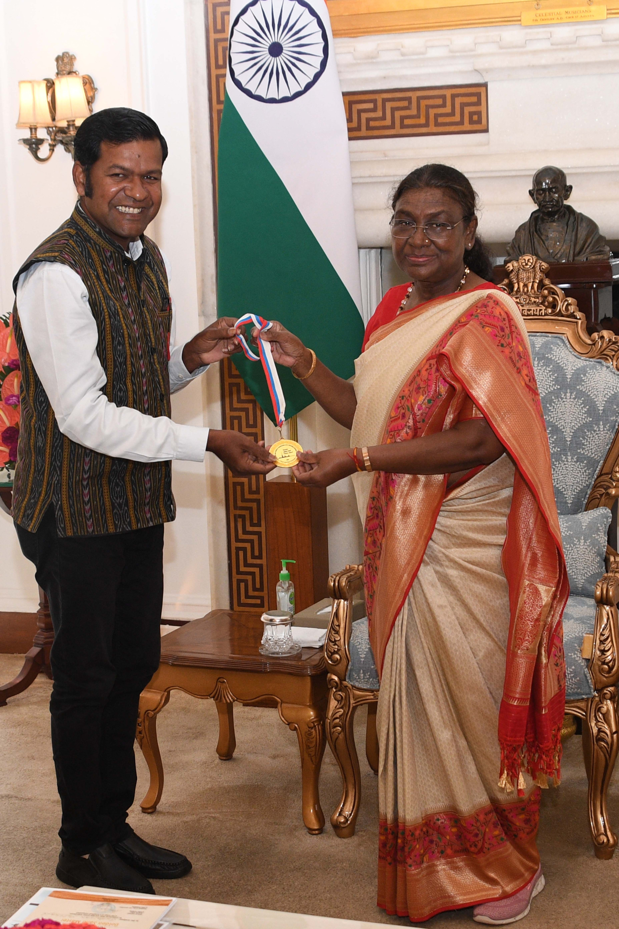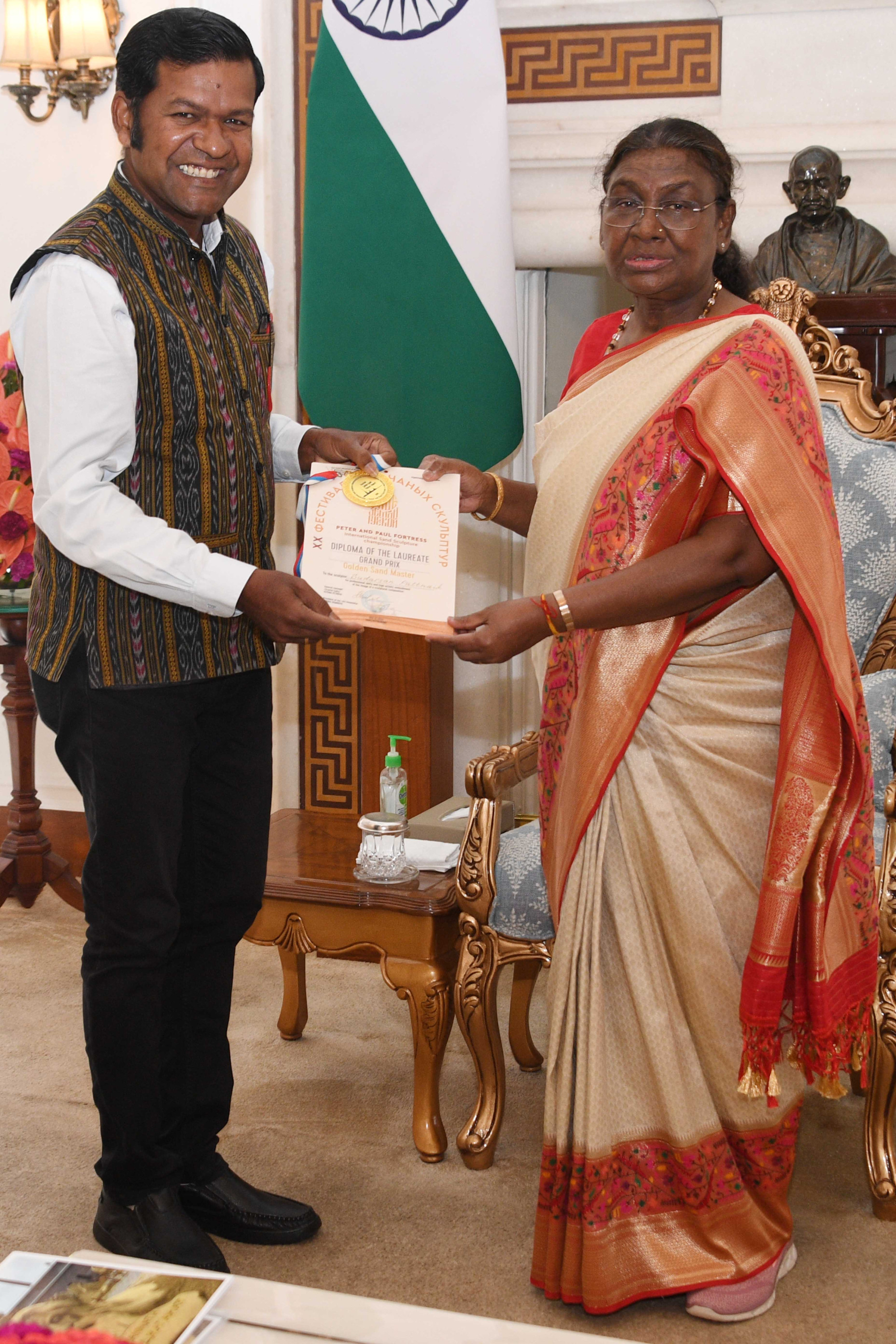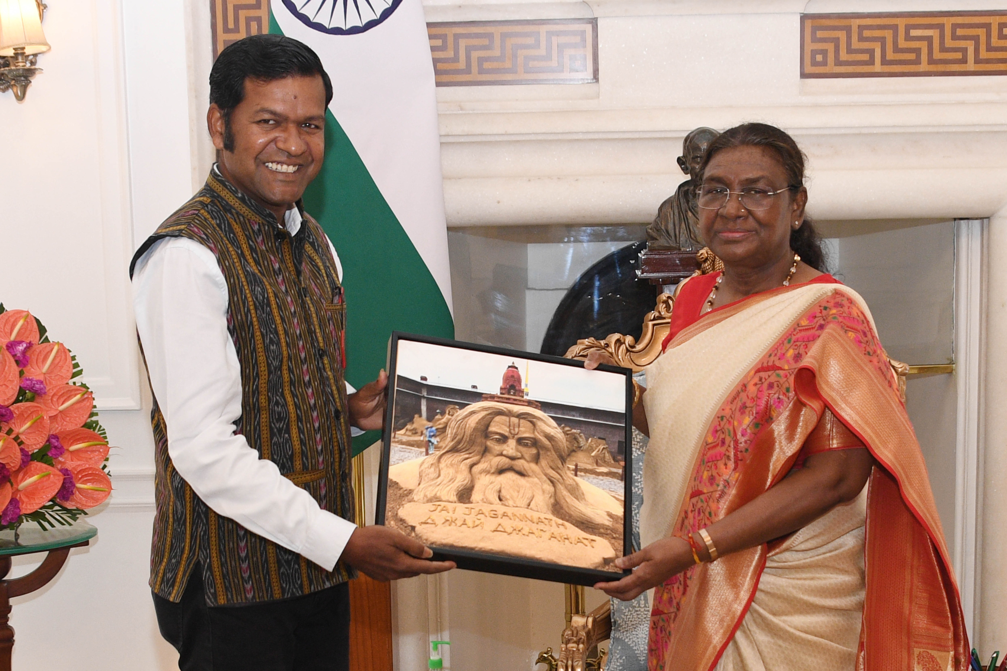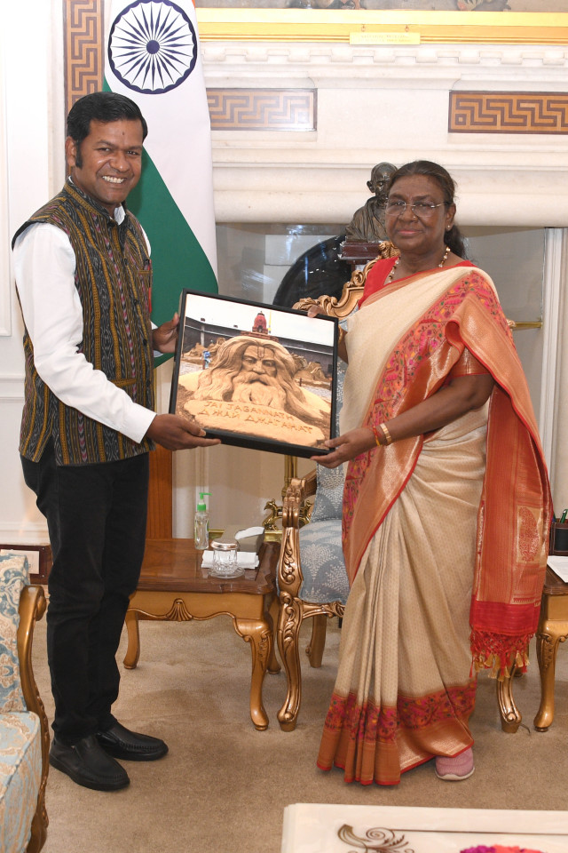 | Caption: | Shri Sudarshan Pattnaik, International Sand Artist meeting with the President of India, Smt Droupadi Murmu at Rashtrapati Bhavan on July 25, 2024 |
