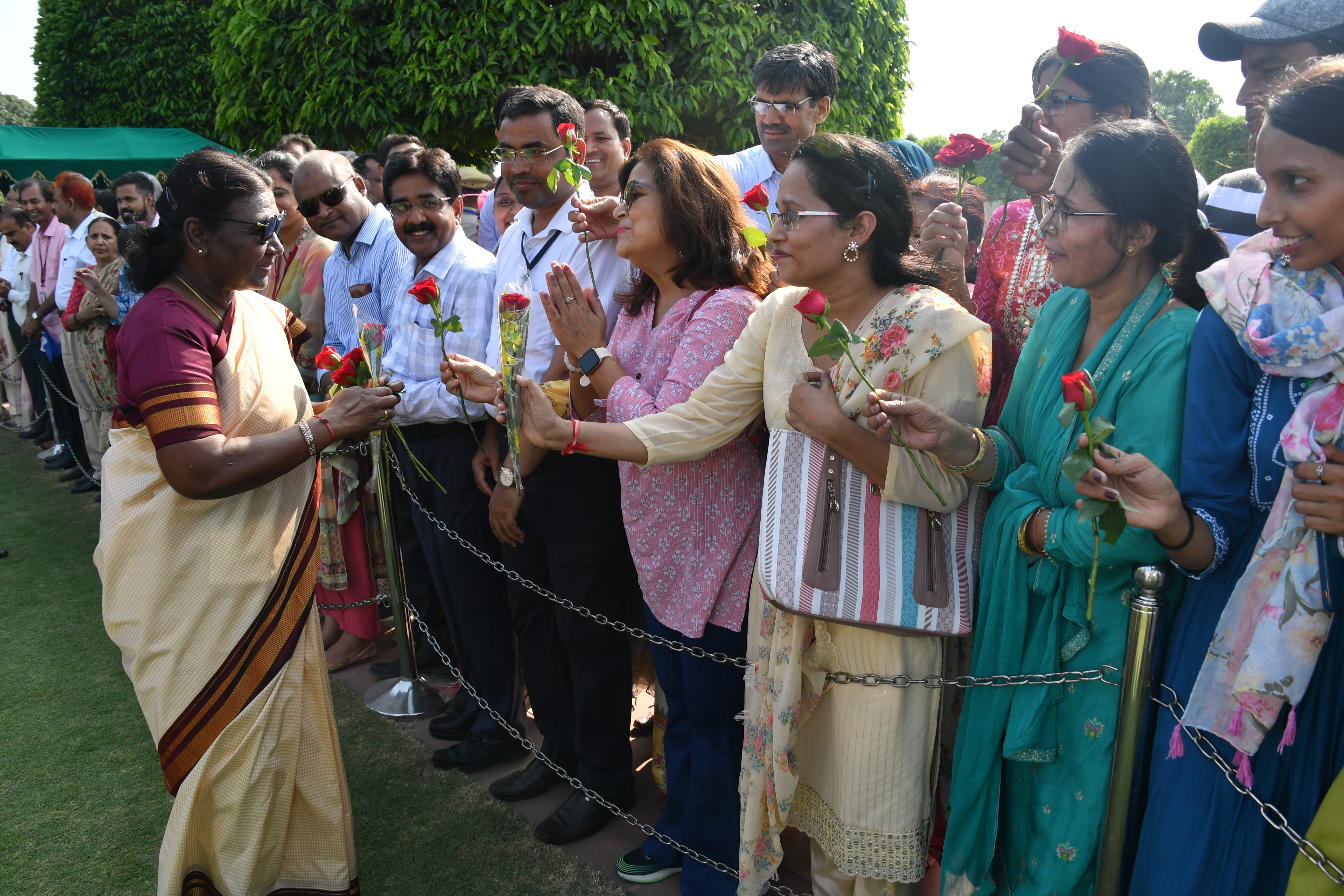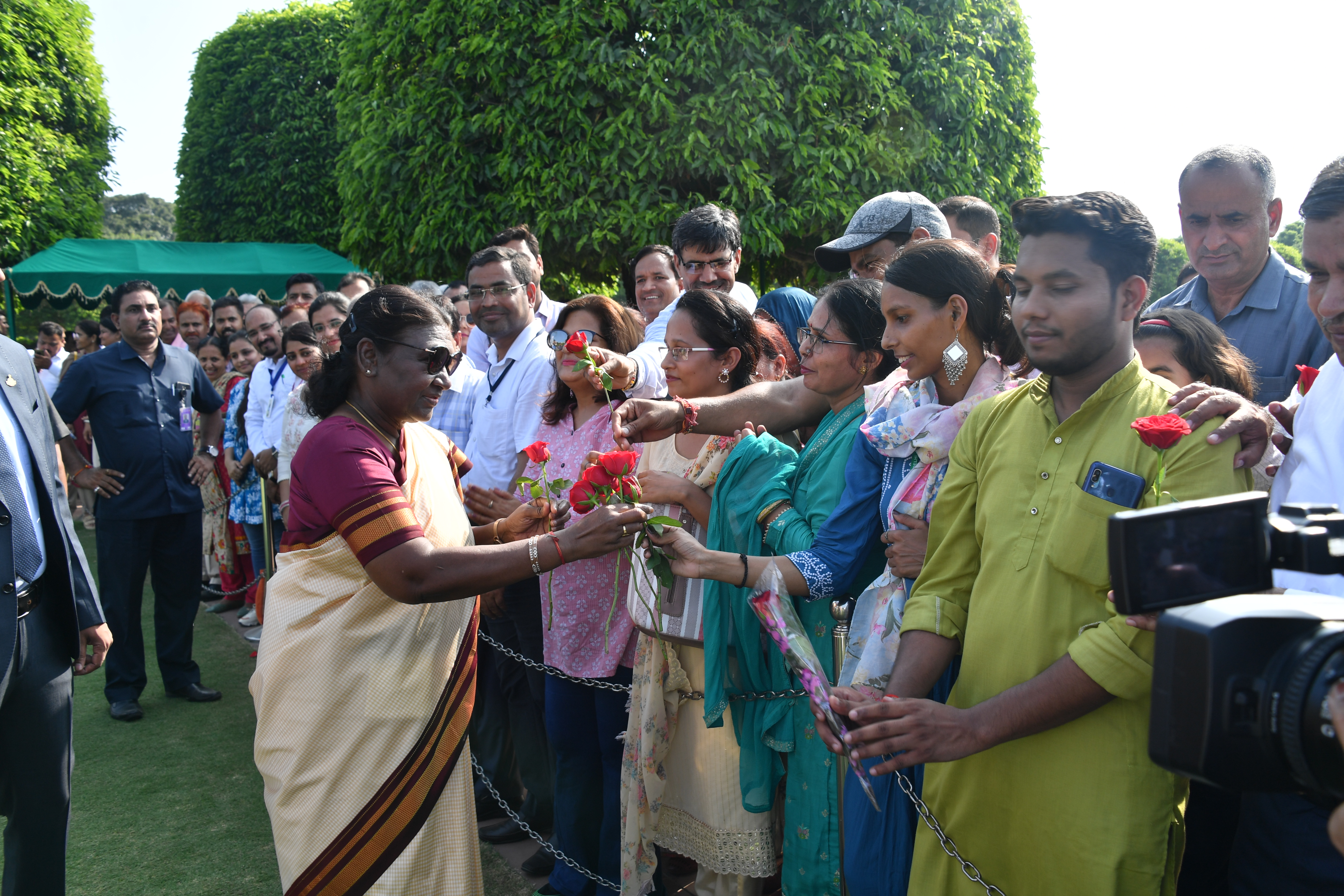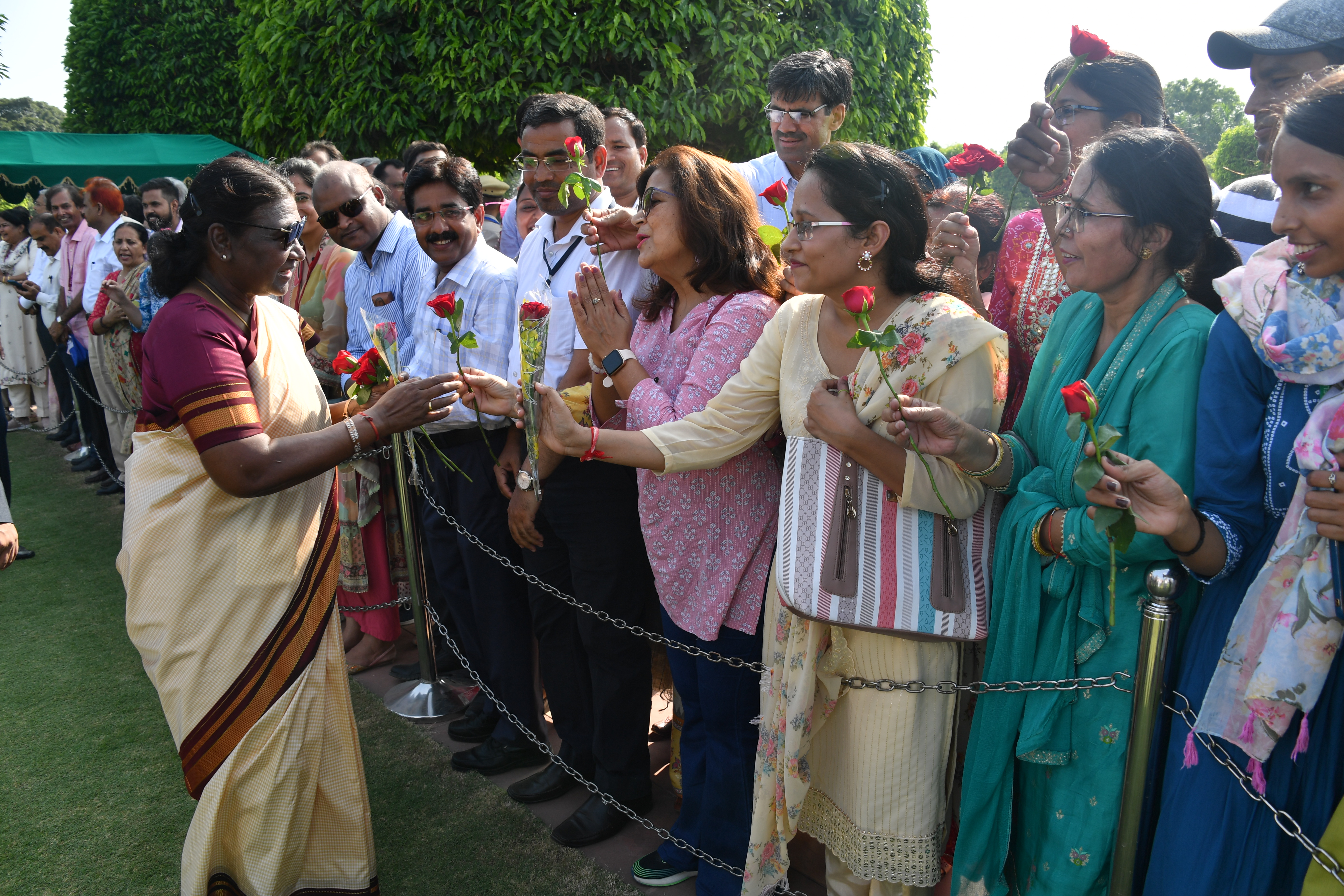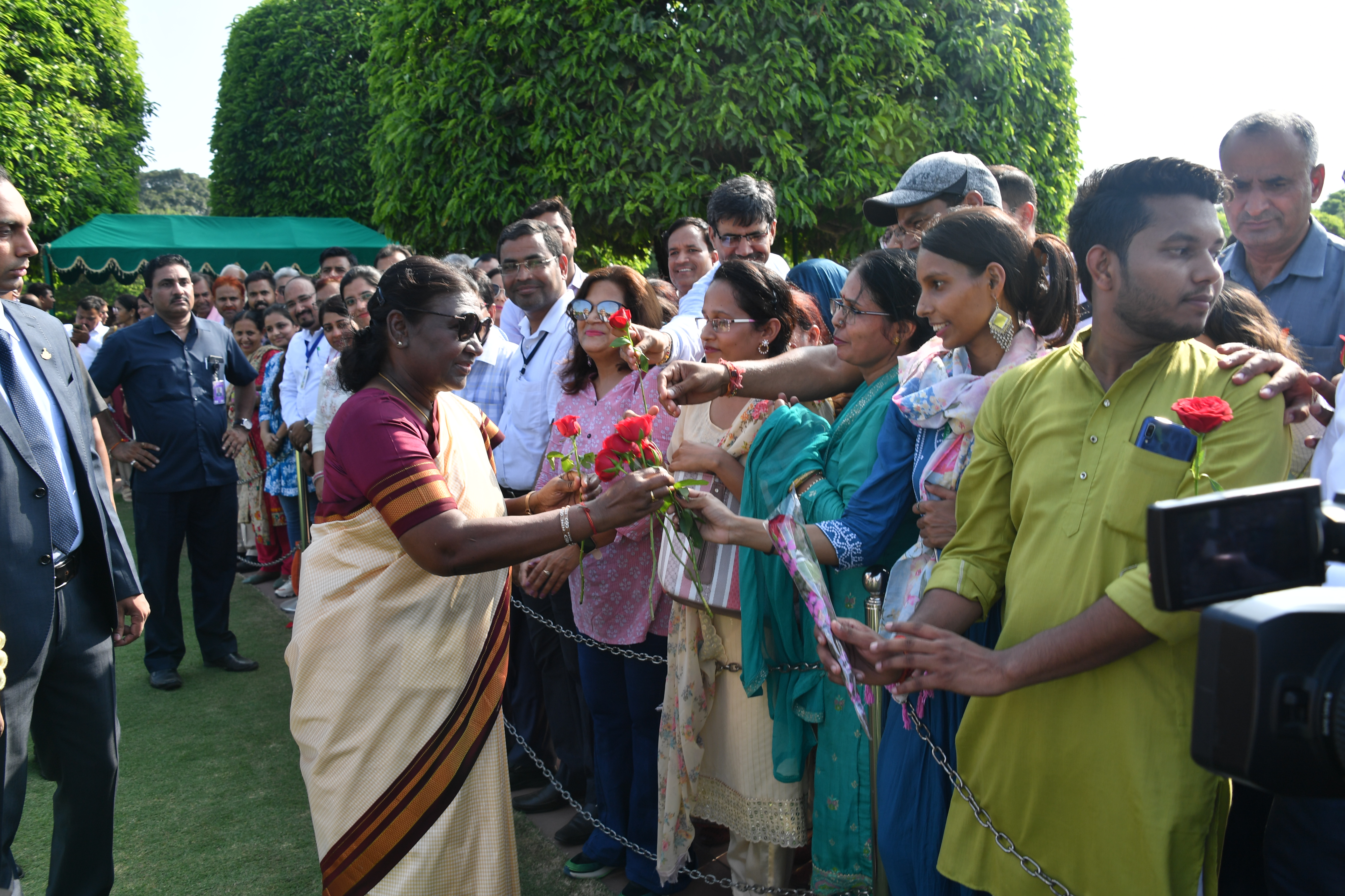| Caption: | The President of India, Smt. Droupadi Murmu Interaction with the teachers invited to visit the Amrit Udyan as special invitees at Rashtrapati Bhavan on September 5, 2023. |