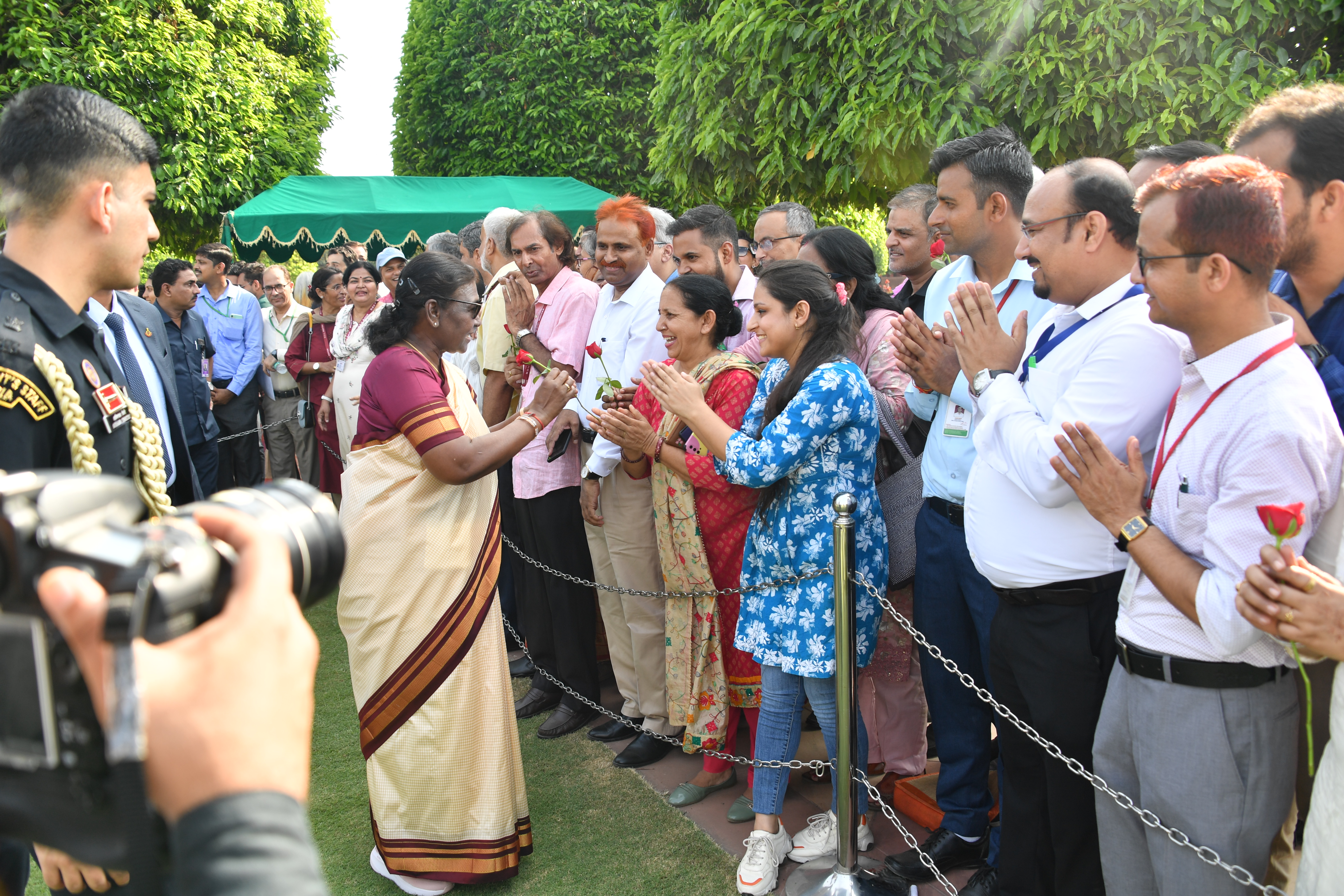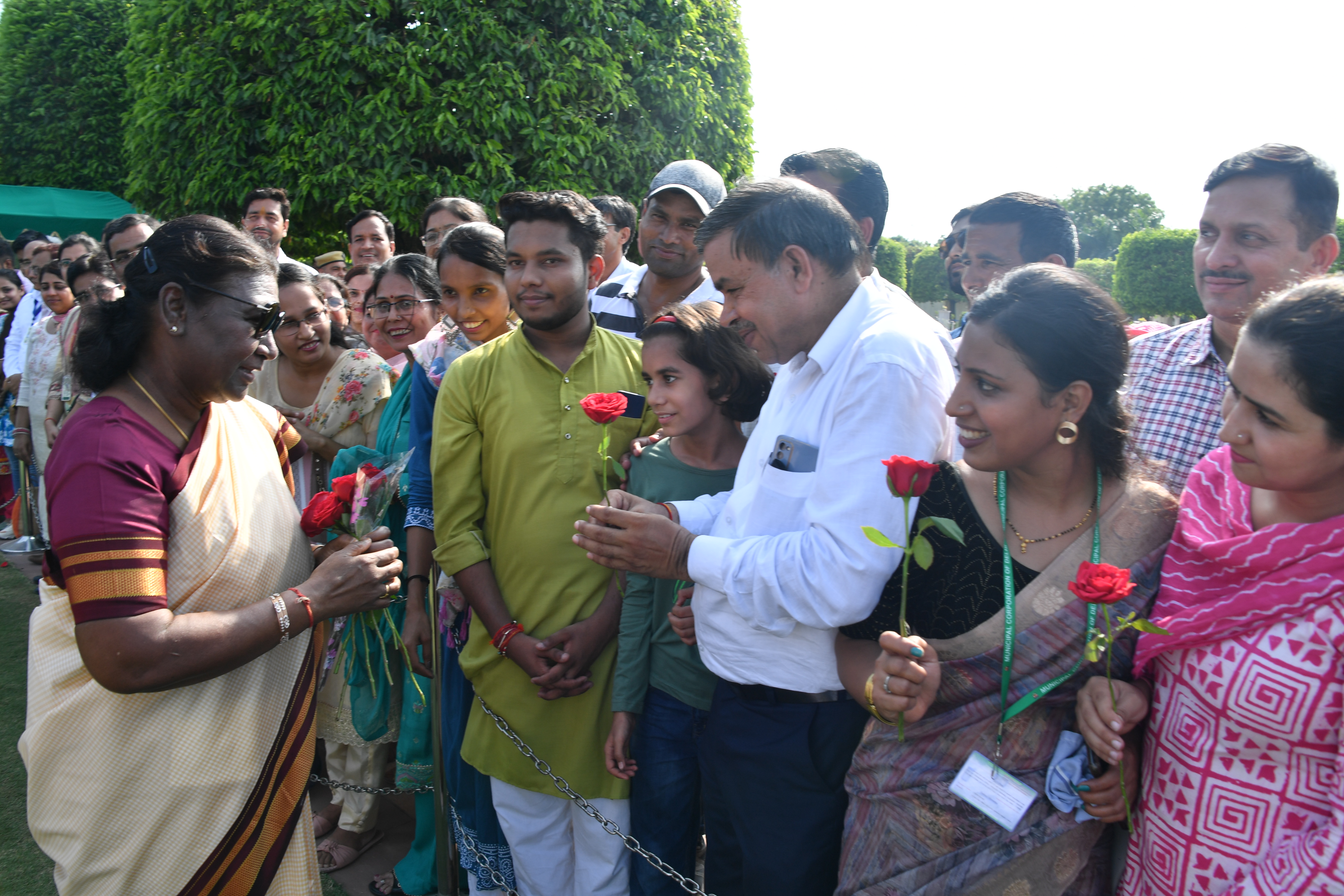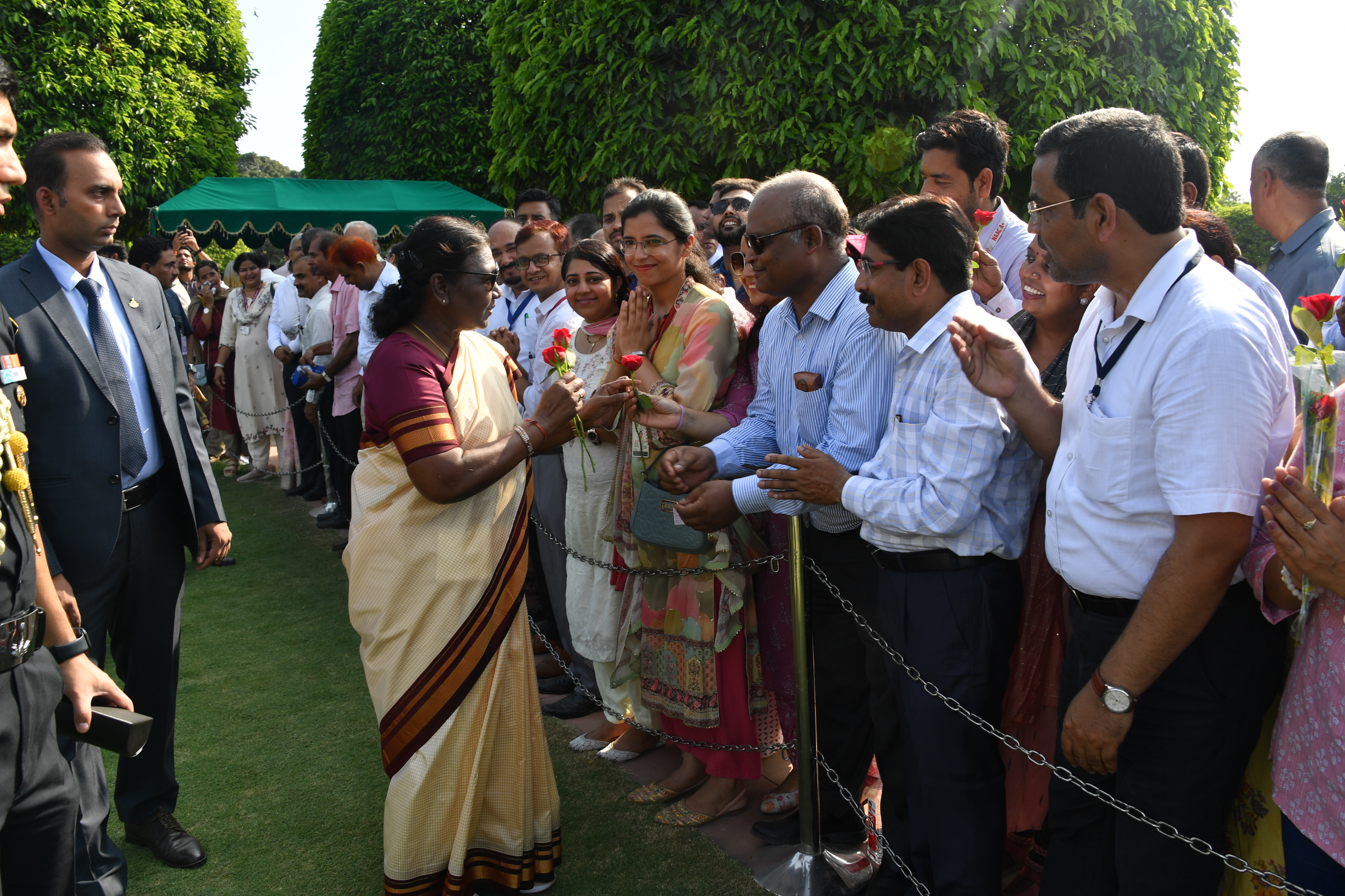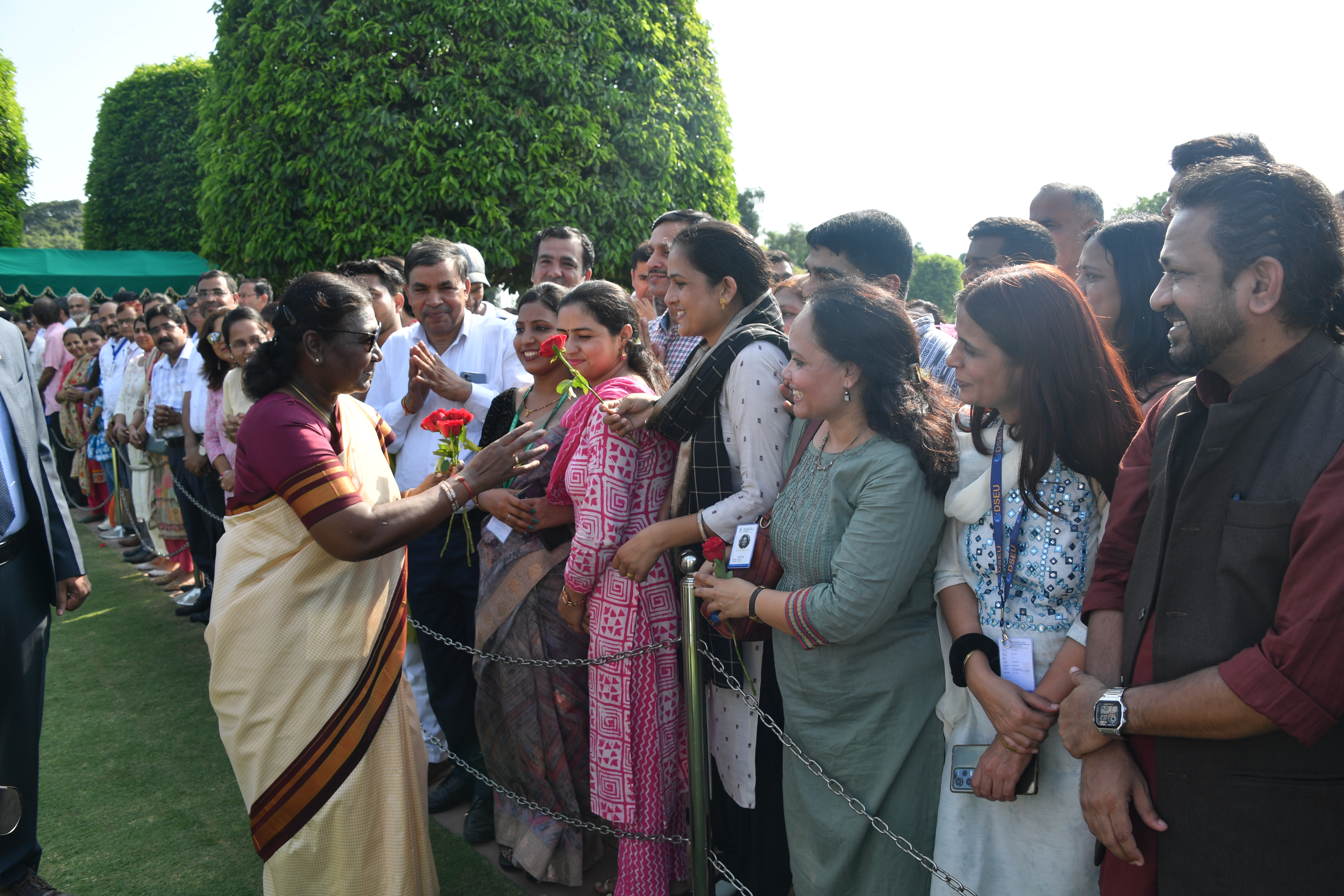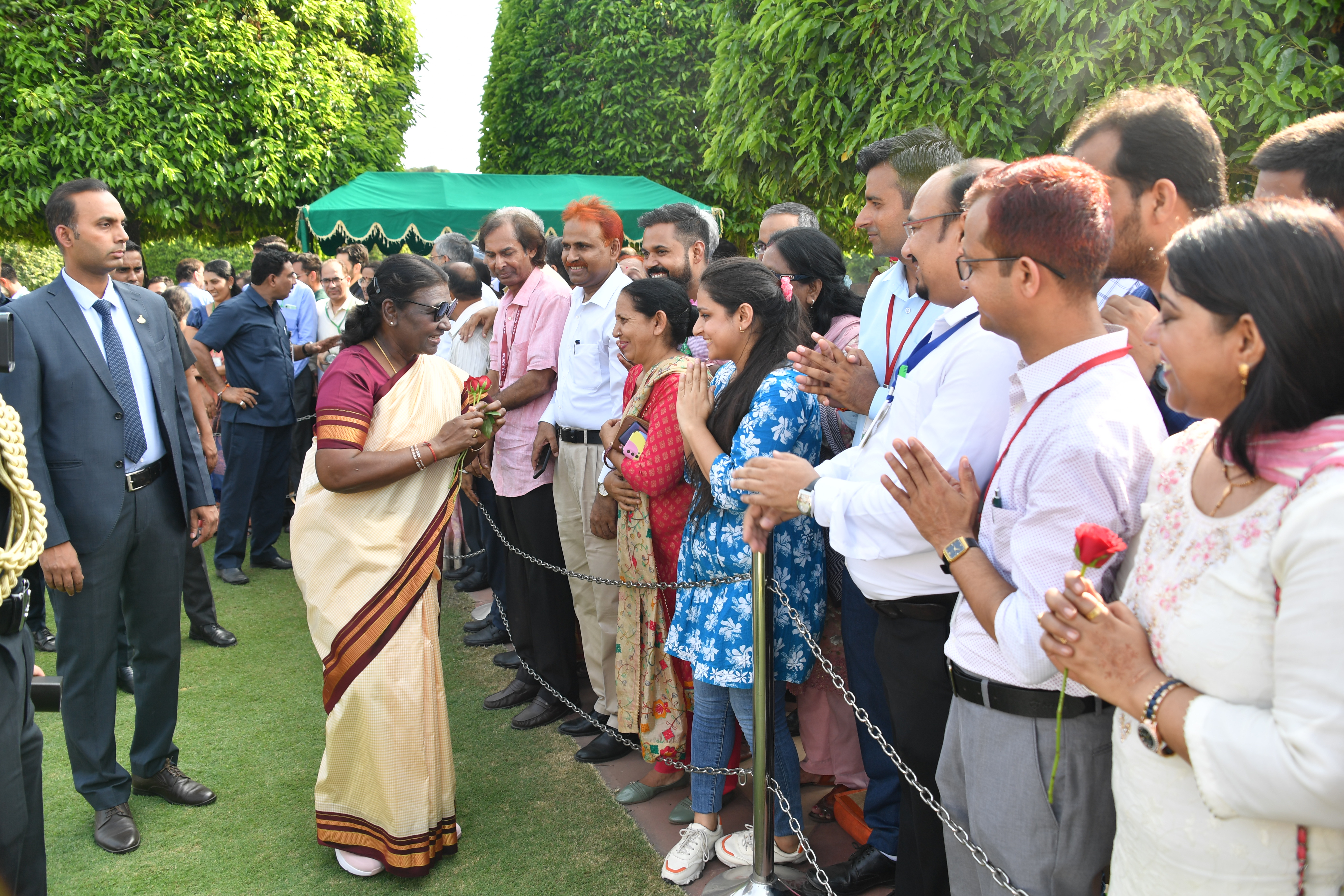 | Caption: | The President of India, Smt. Droupadi Murmu Interaction with the teachers invited to visit the Amrit Udyan as special invitees at Rashtrapati Bhavan on September 5, 2023. |