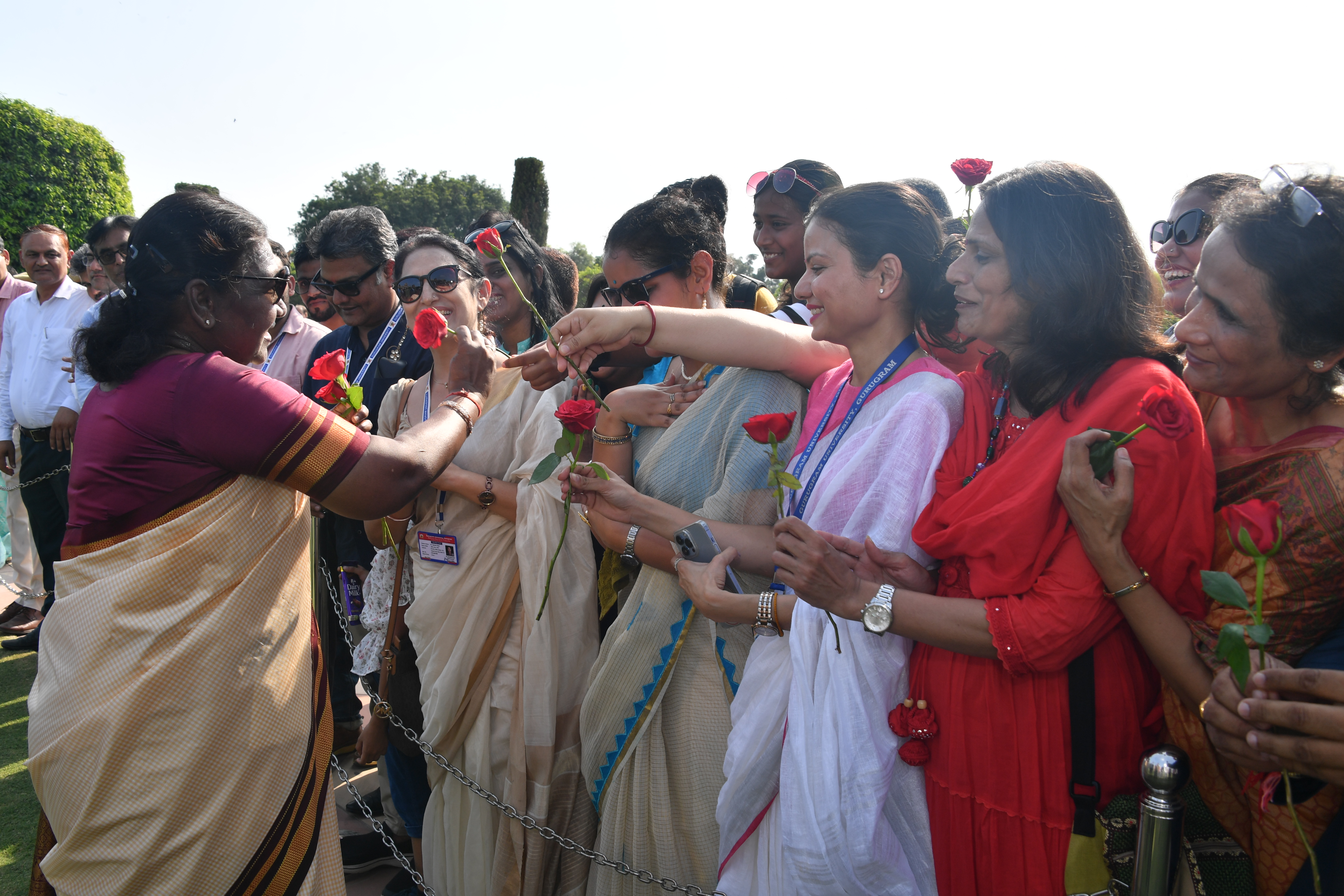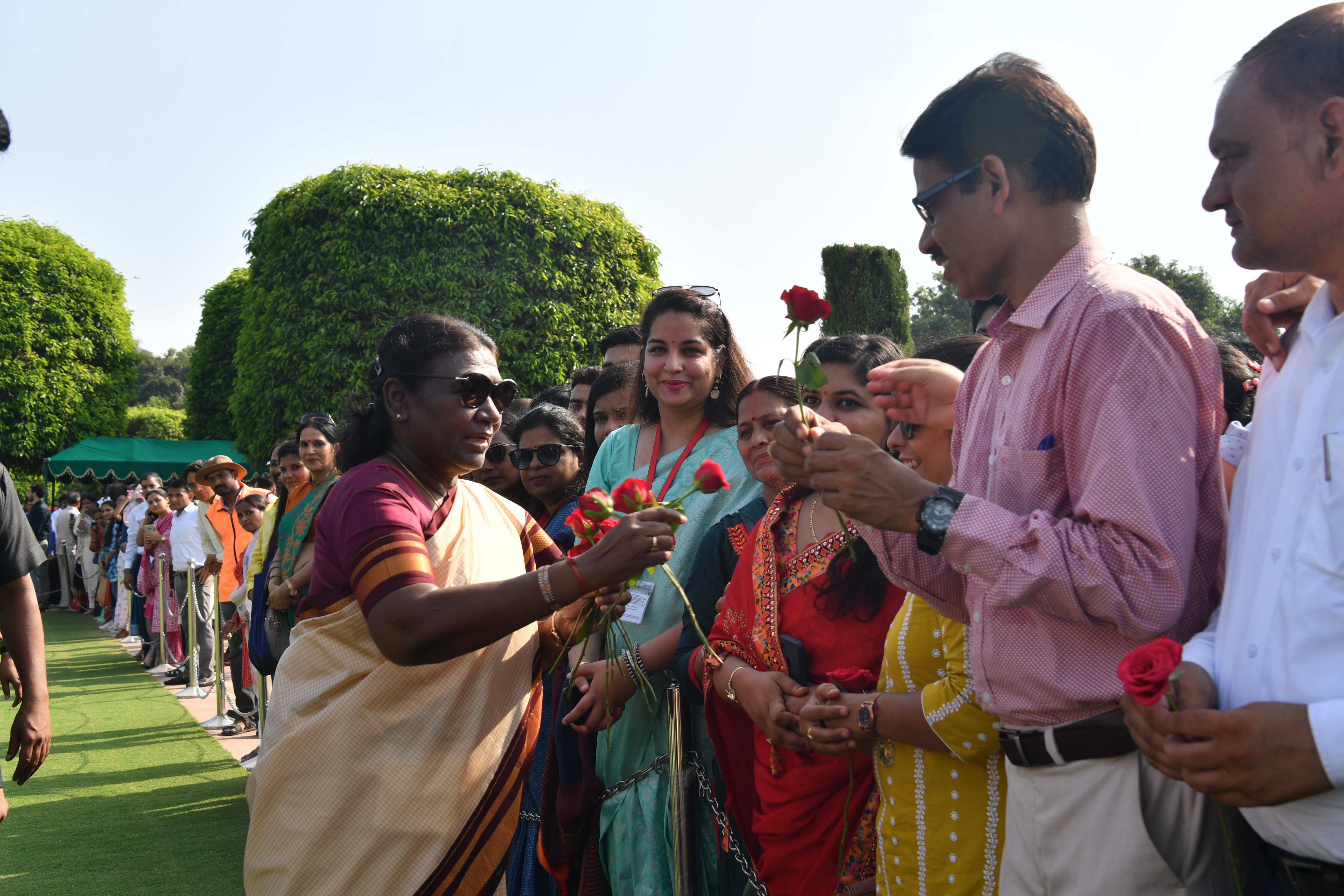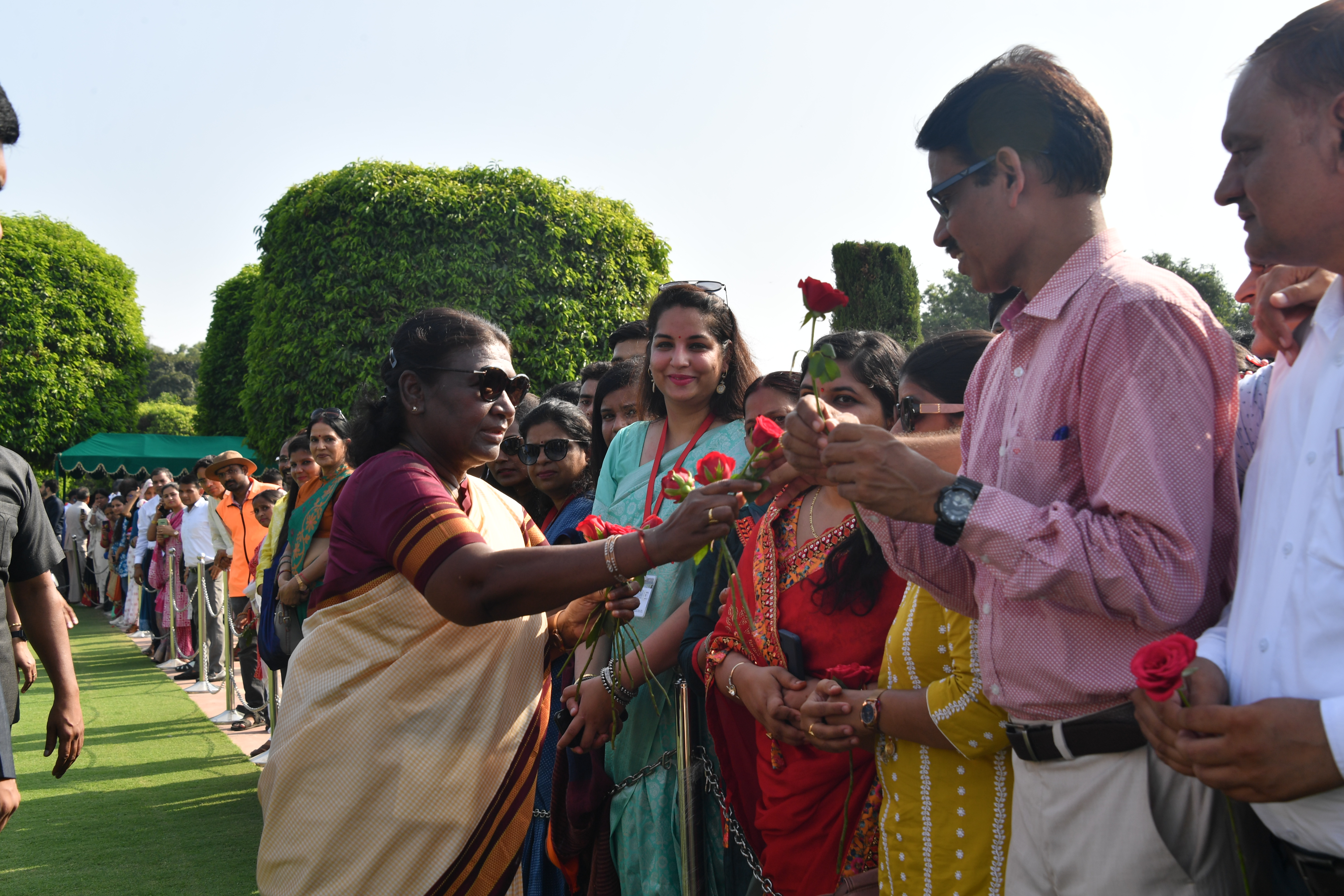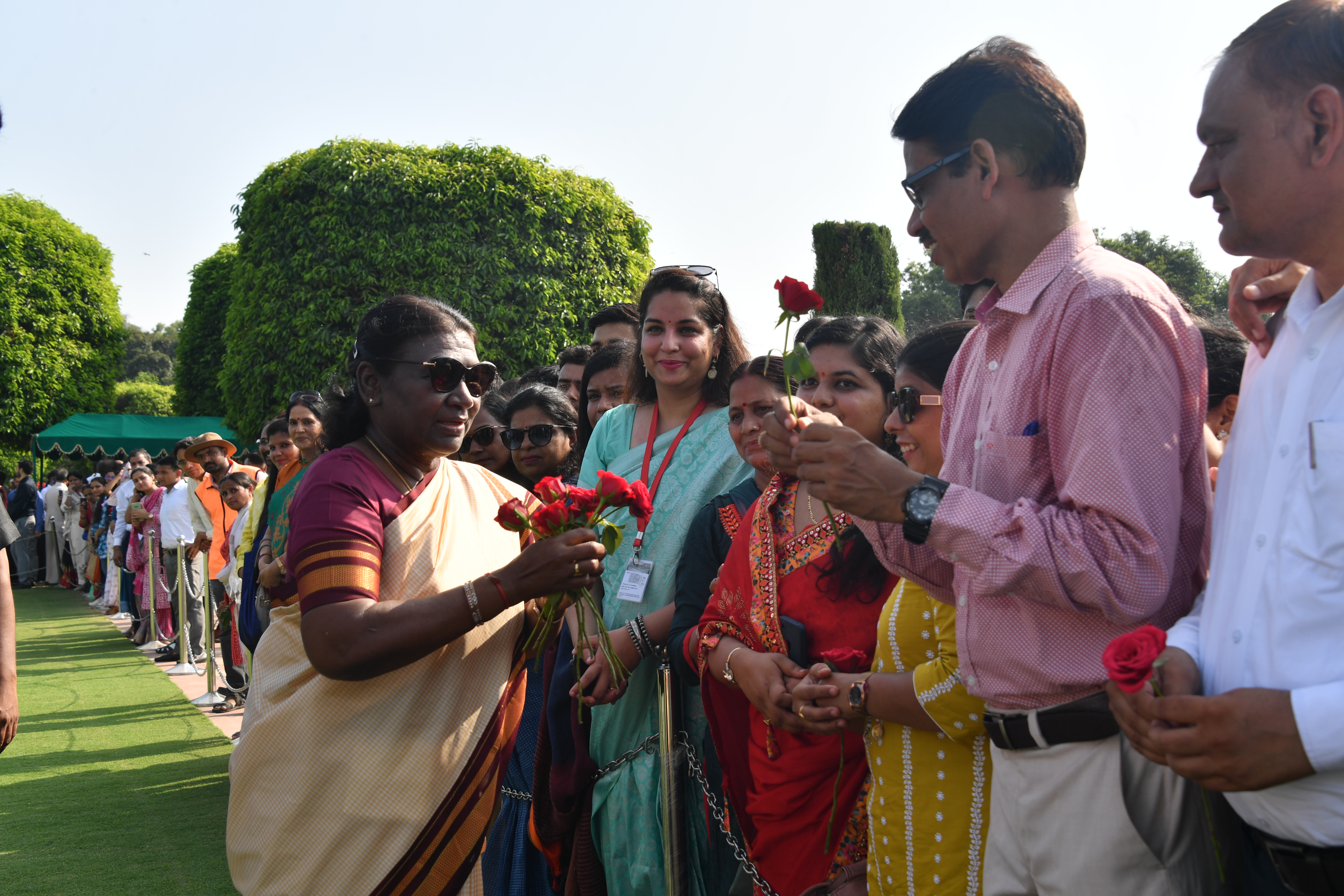 | Caption: | The President of India, Smt. Droupadi Murmu Interaction with the teachers invited to visit the Amrit Udyan as special invitees at Rashtrapati Bhavan on September 5, 2023. |