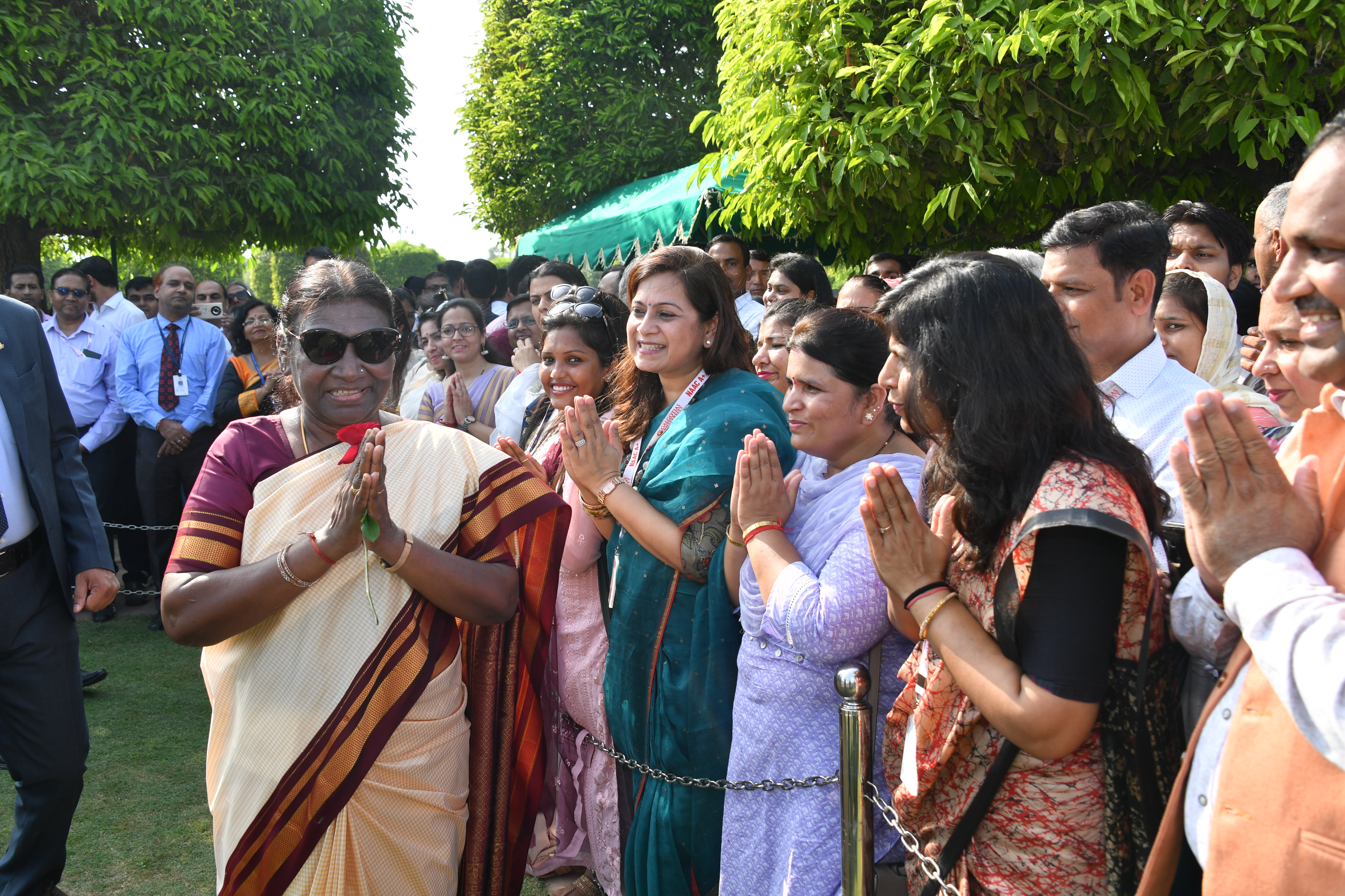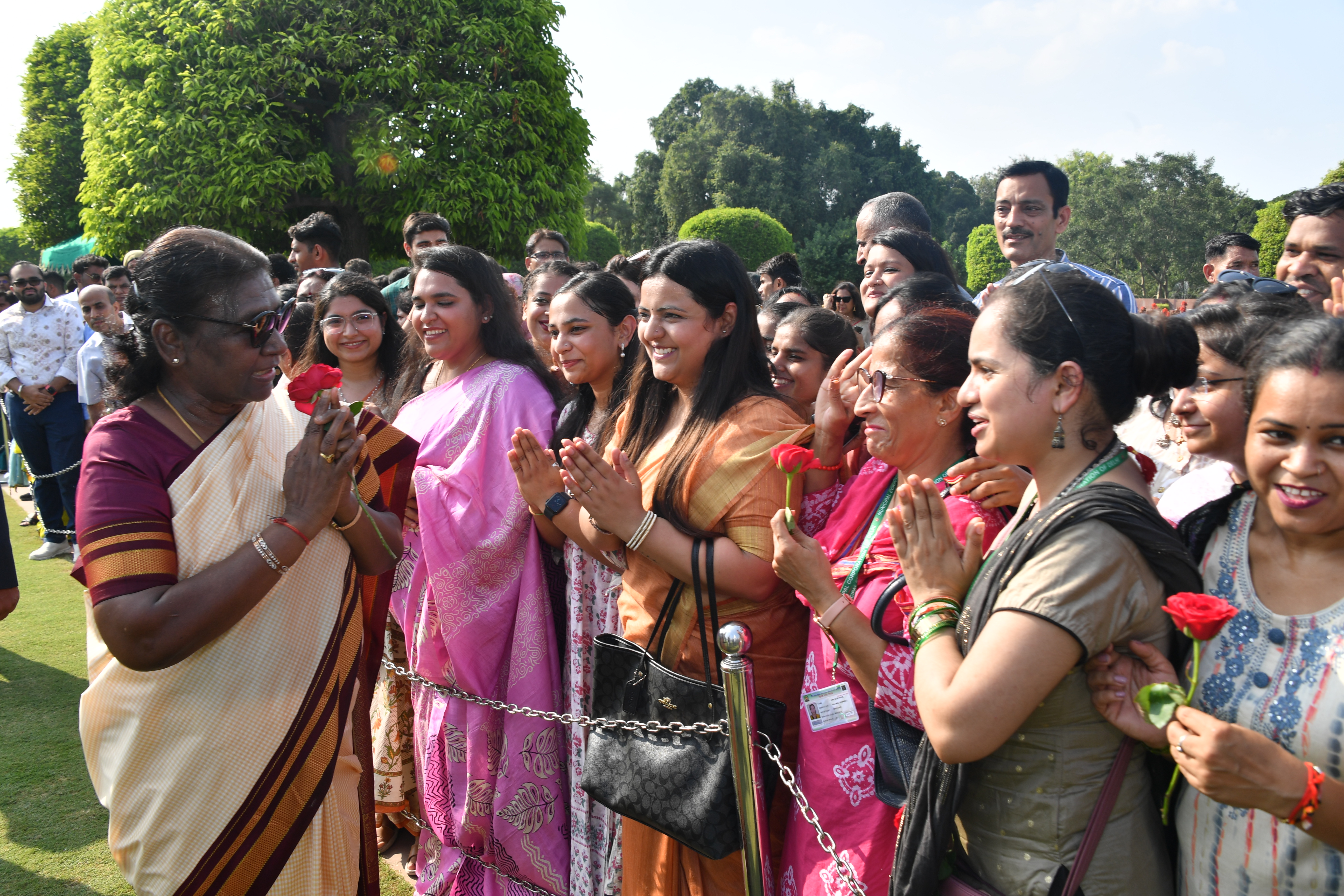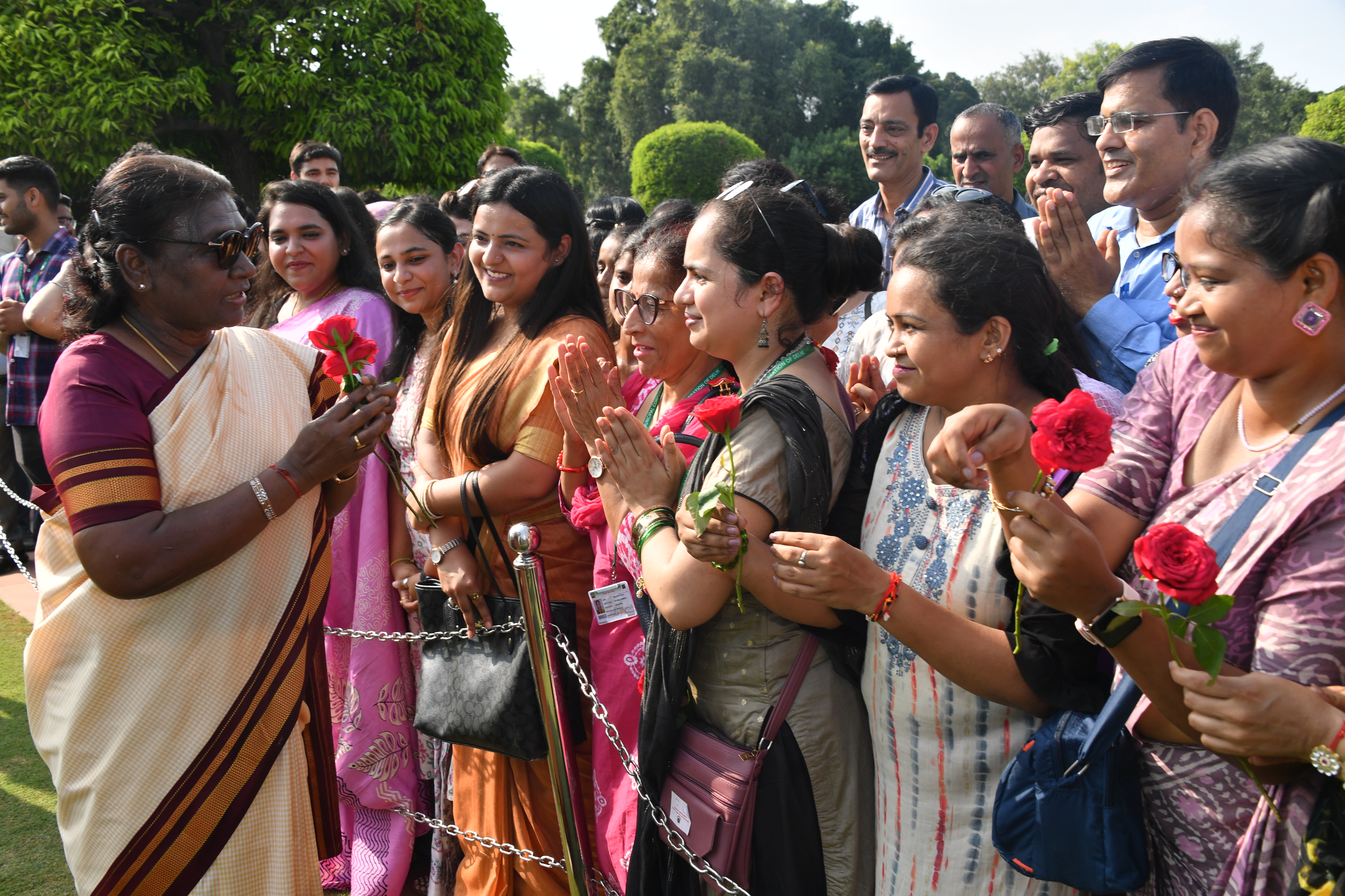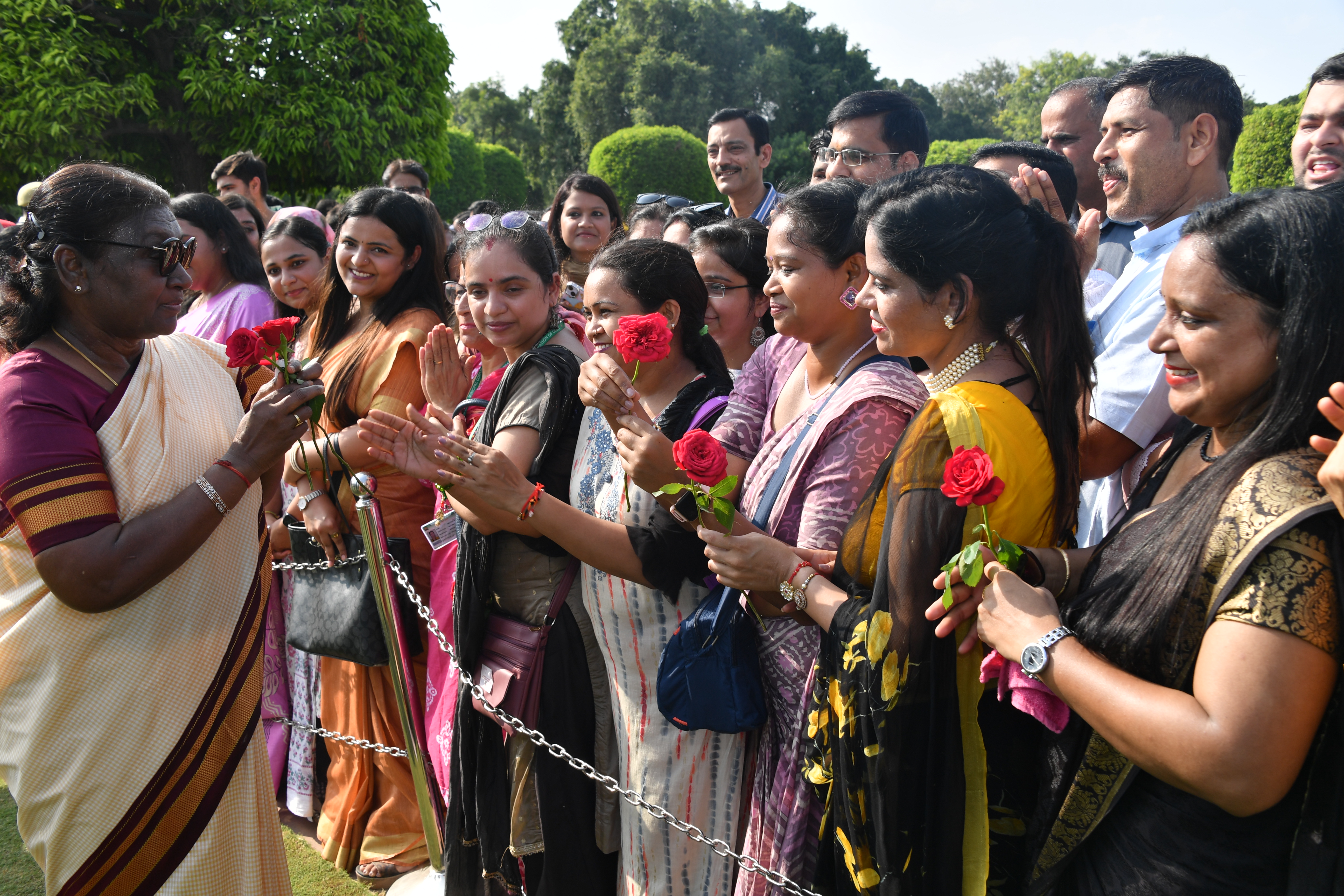 | Caption: | The President of India, Smt. Droupadi Murmu Interaction with the teachers invited to visit the Amrit Udyan as special invitees at Rashtrapati Bhavan on September 5, 2023. |