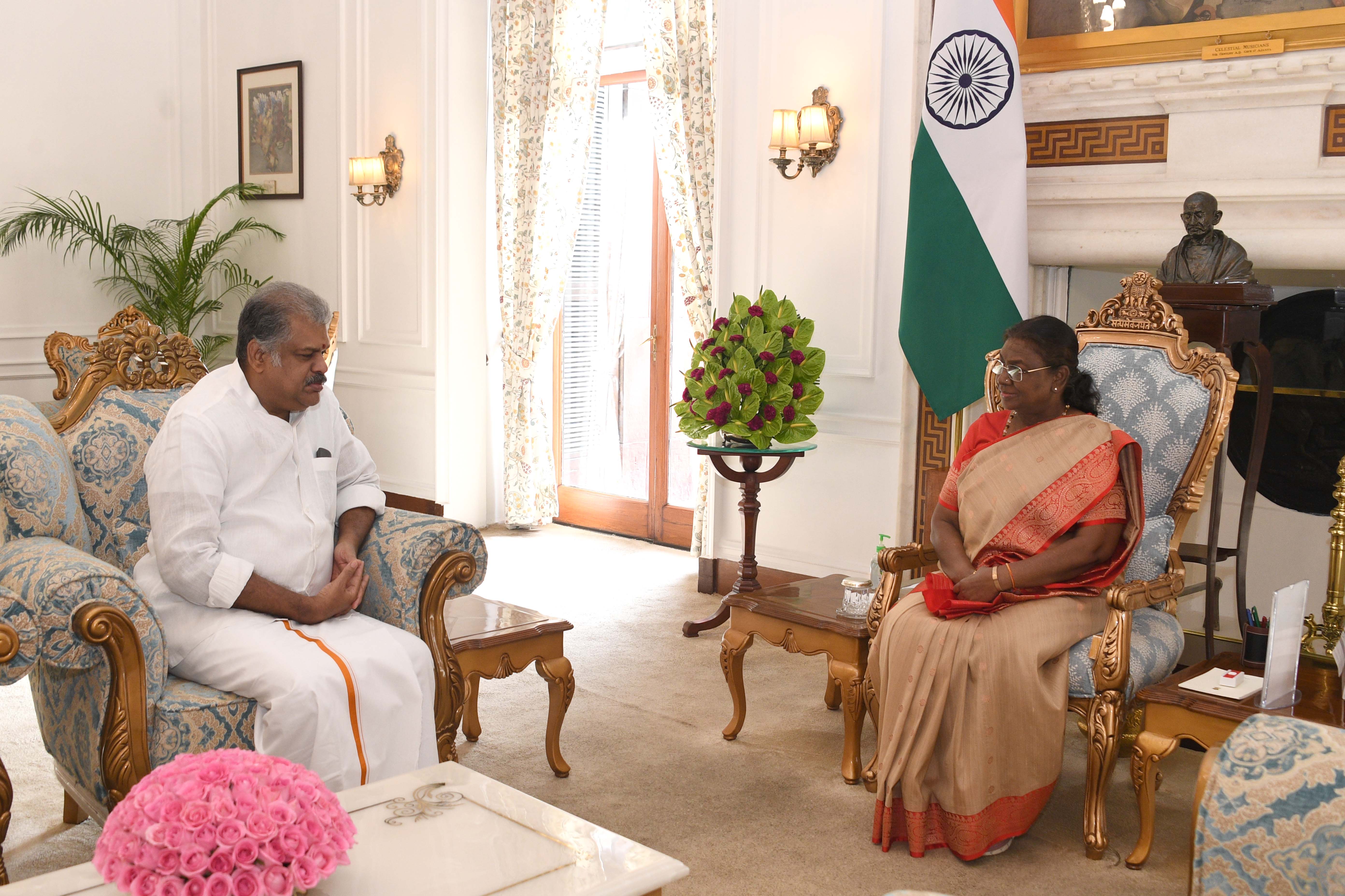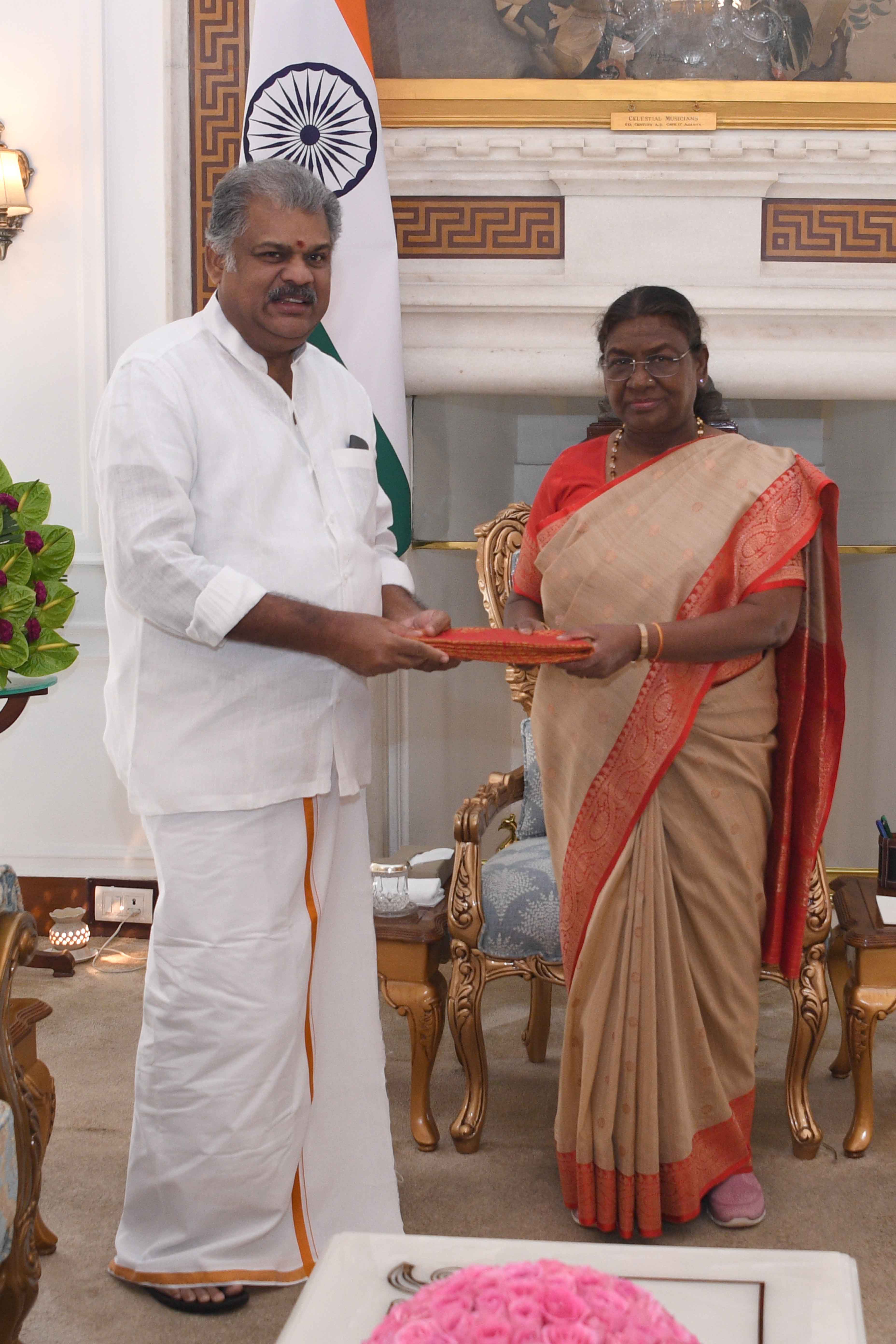 | Caption: | Shri G.K. Vasan, Member of Parliament (RS), President Tamil Maanila Congress (M), former Union Minister of Shipping meeting with the President of India, Smt Droupadi Murmu at Rashtrapati Bhavan on August 1, 2024. |