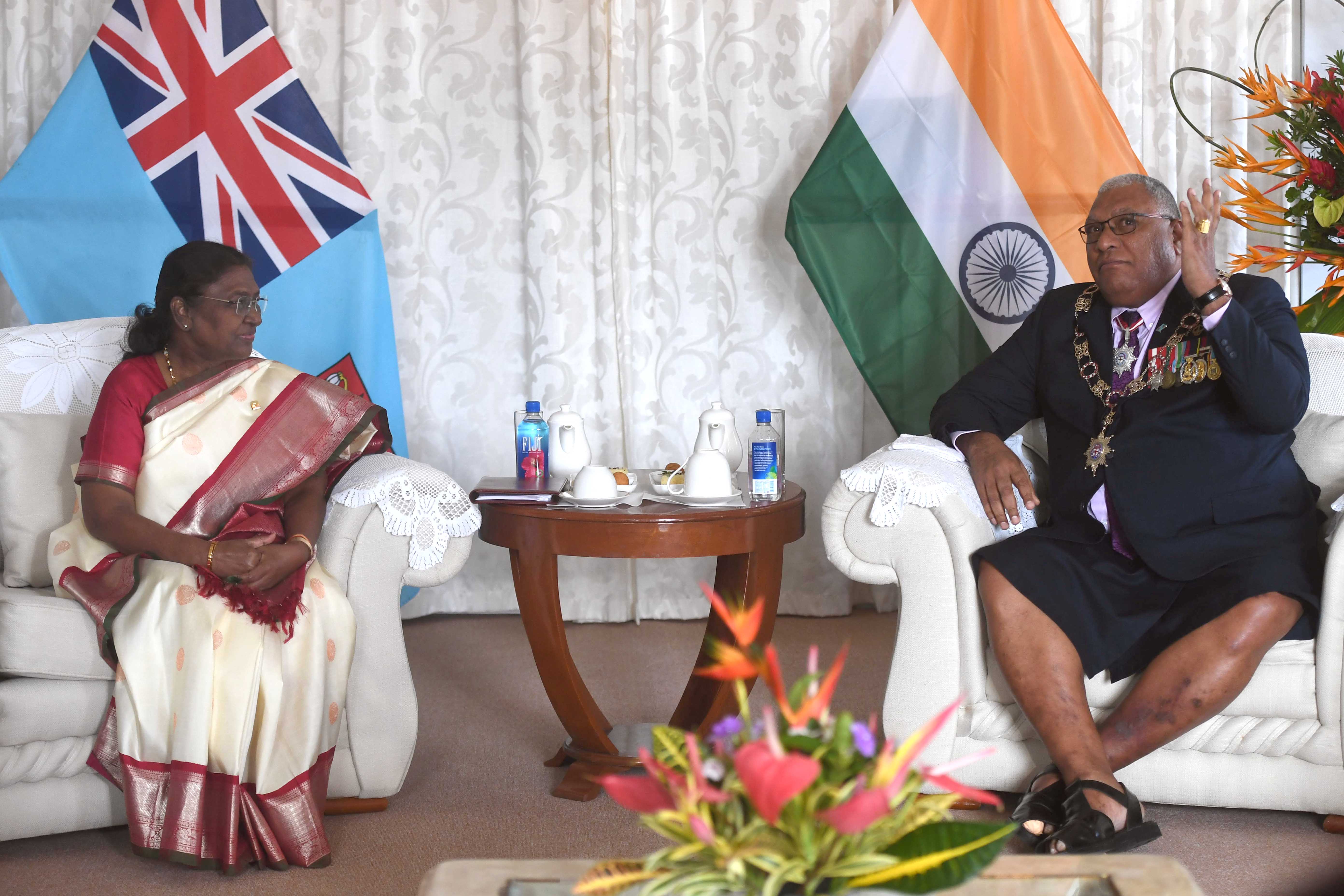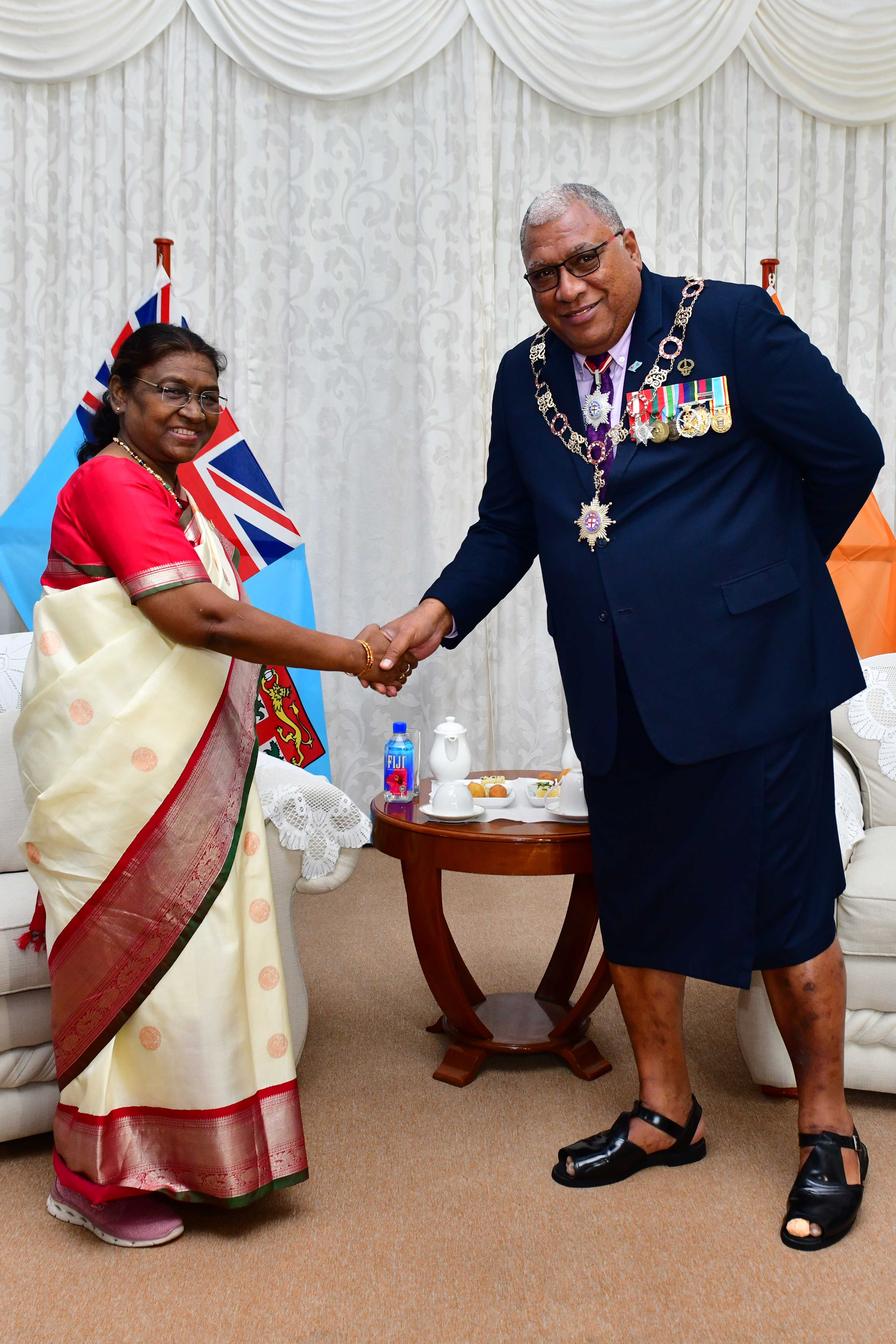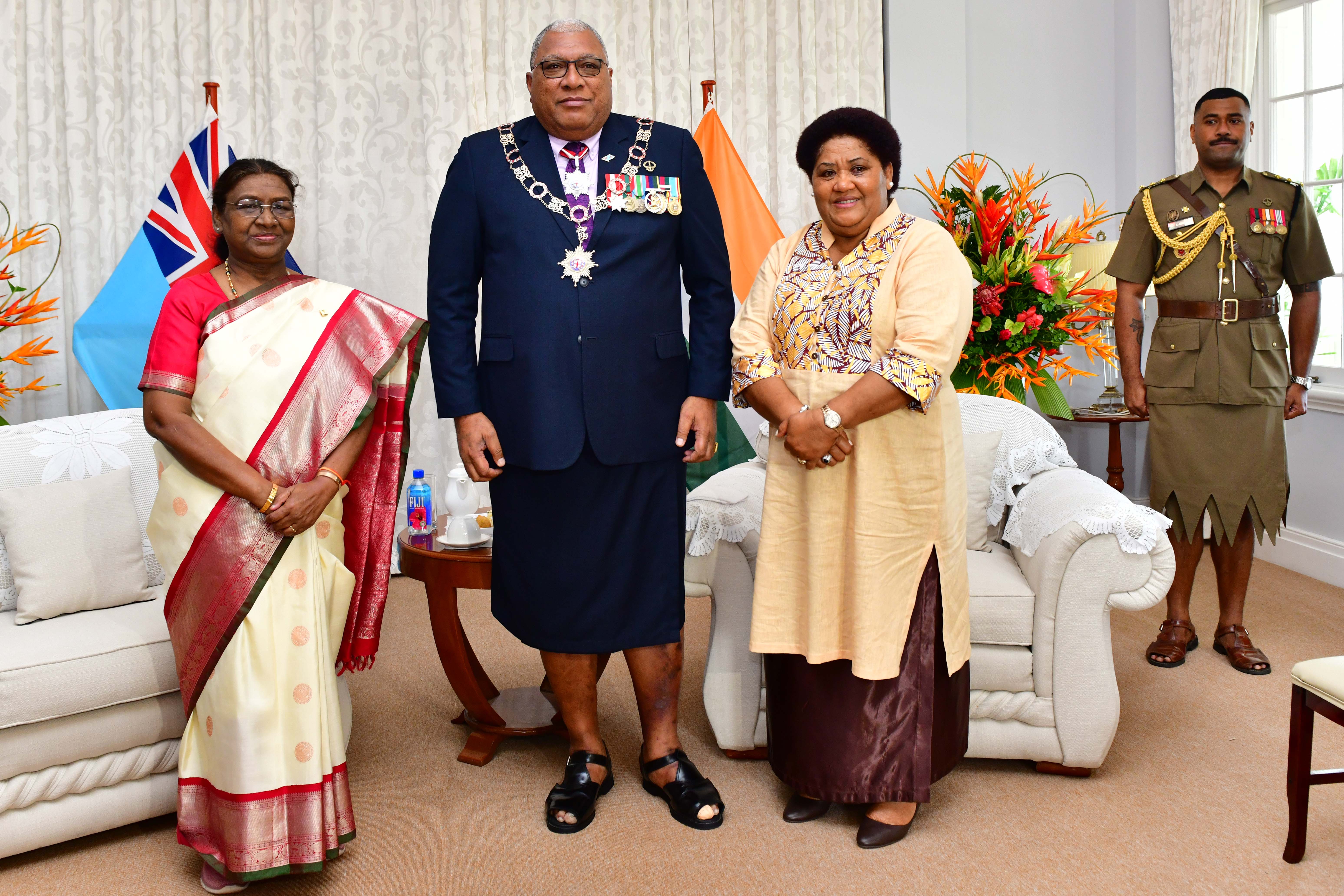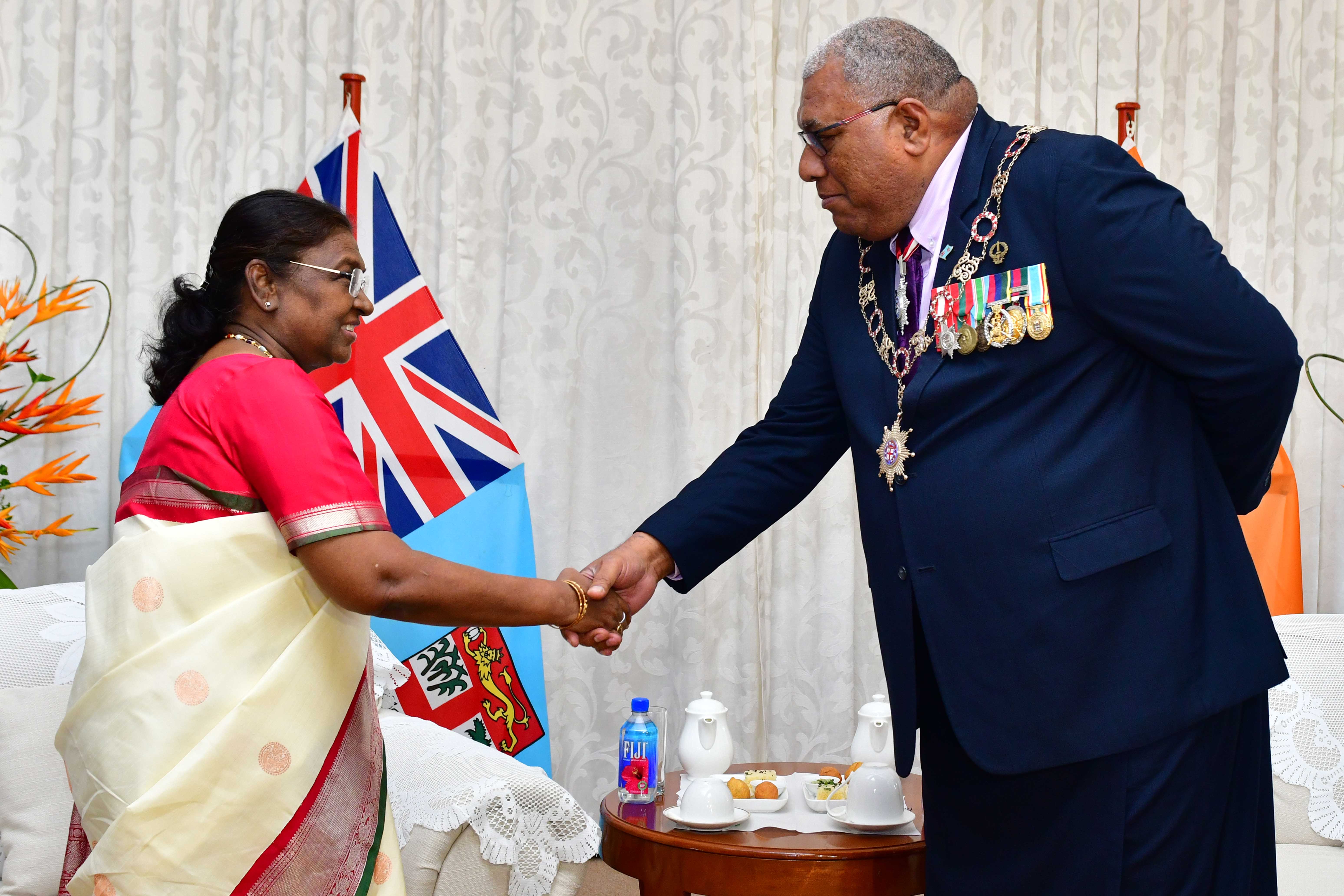 | Caption: | The president of India Smt.Droupadi Murmu was warmly received by the President of Fiji, Shri Ratu Wiliame Maivalili Katonivere at State House, Suva in Fiji on August 6, 2024. |