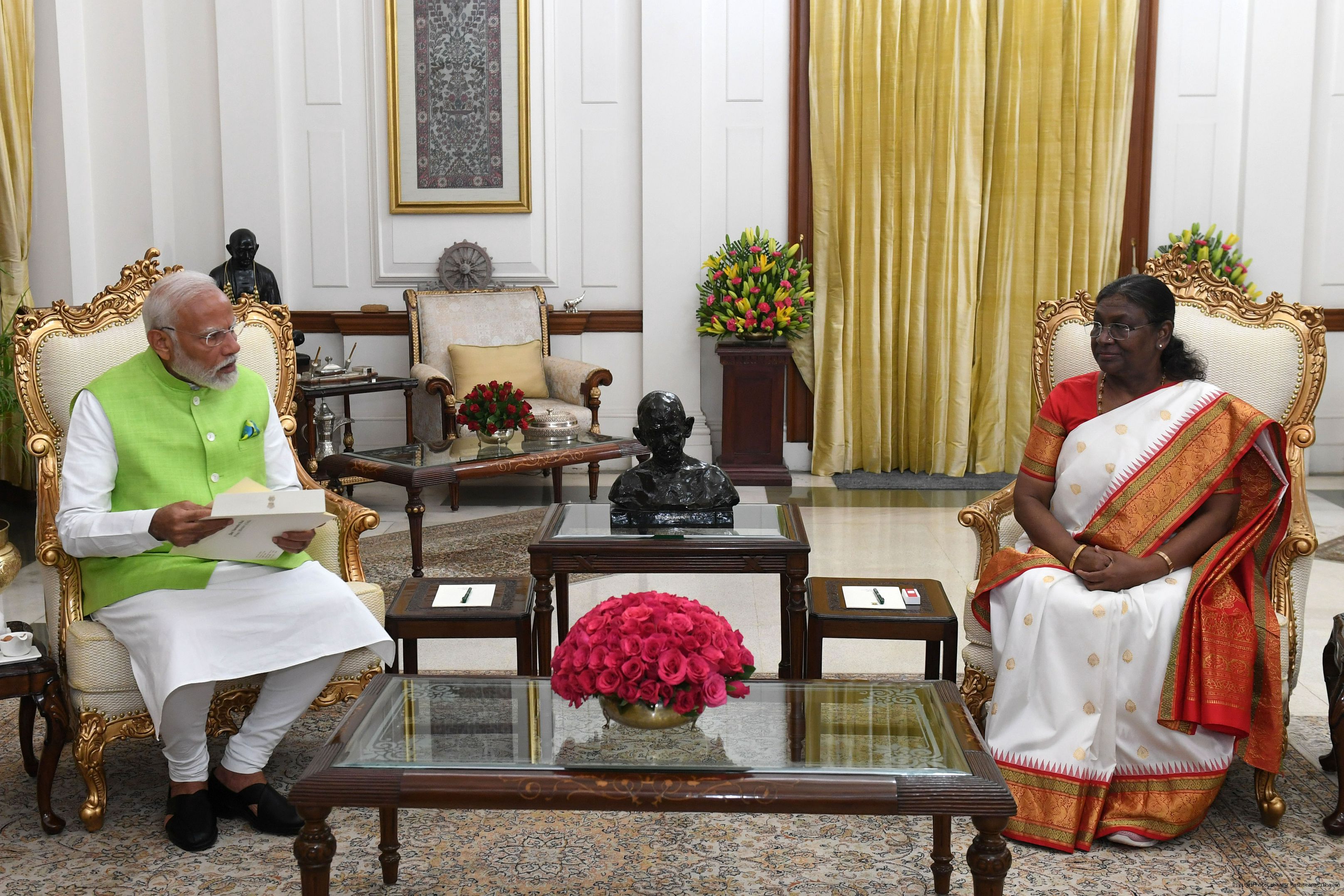 | Caption: | The Prime Minister of India, Shri Narendra Modi called on the president of India Smt. Droupadi Murmu at Rashtrapati Bhavan on June 05, 2024. |
