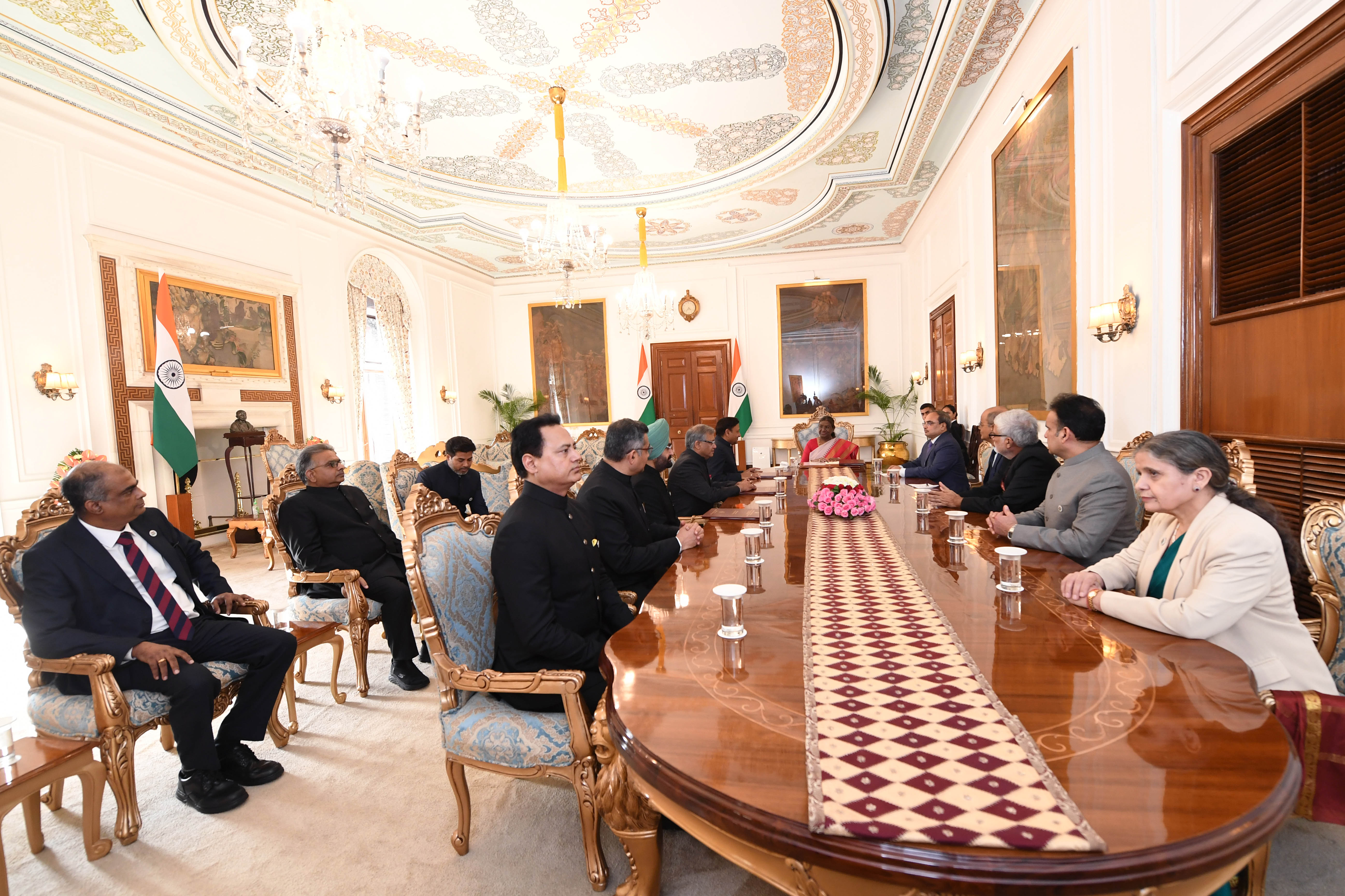 | Caption: | Shri Rajiv Kumar, Chief Election Commissioner of India accompanied by Shri Gyanesh Kumar and Dr. Sukhbir Singh Sandhu, Election Commissioners called on the President of India Smt. Droupadi Murmu at Rashtrapati Bhavan on June 06, 2024. |
