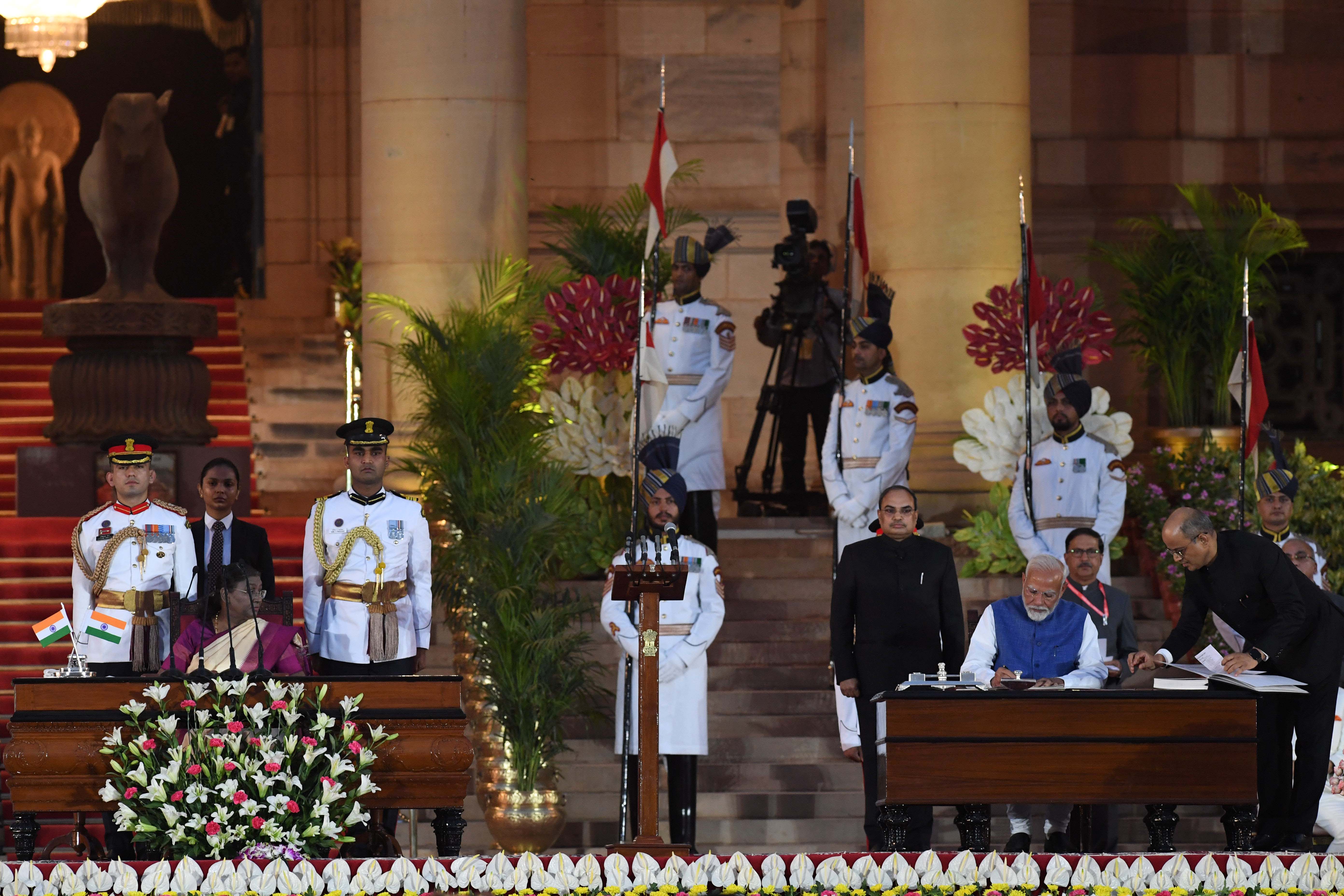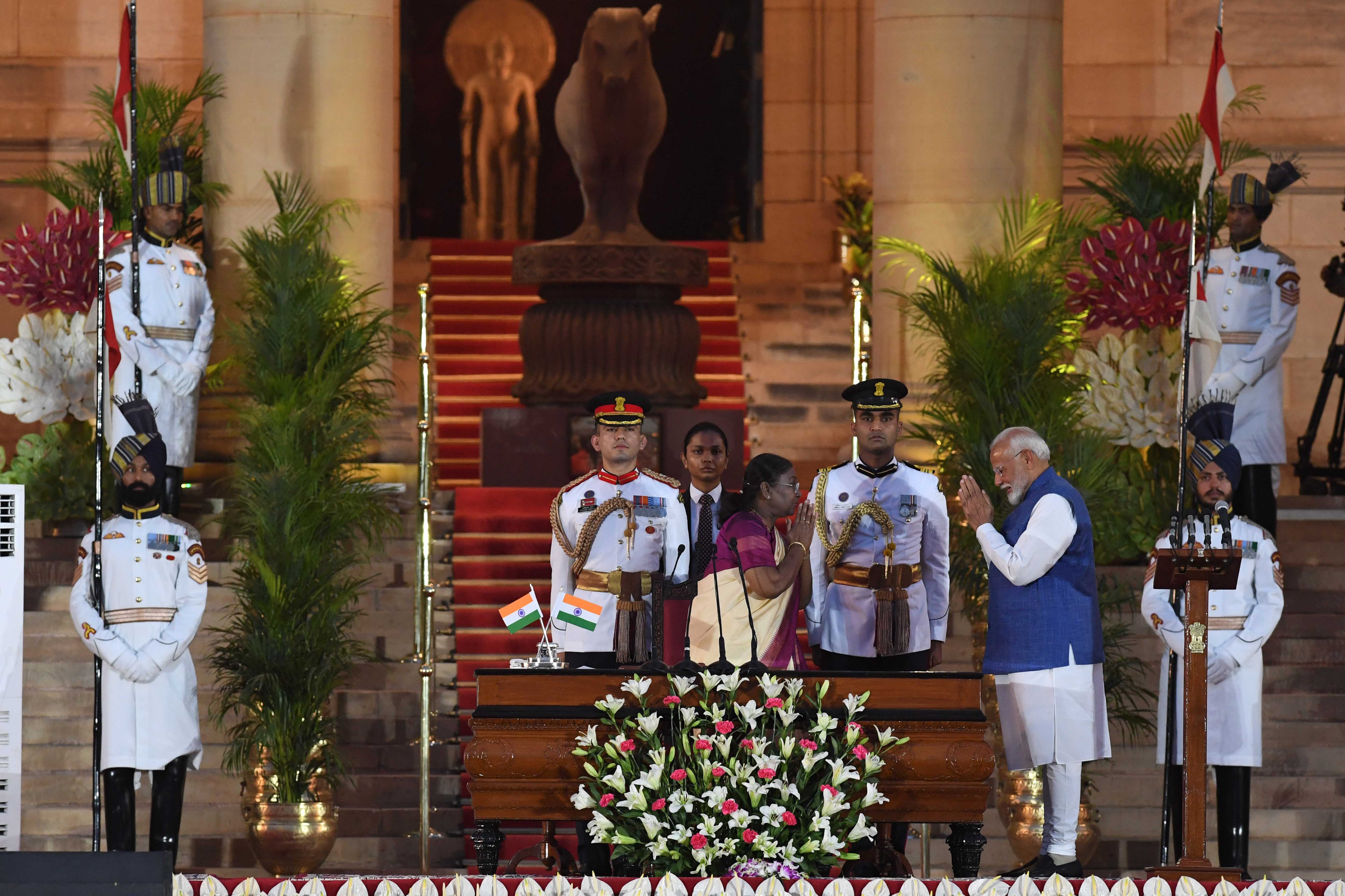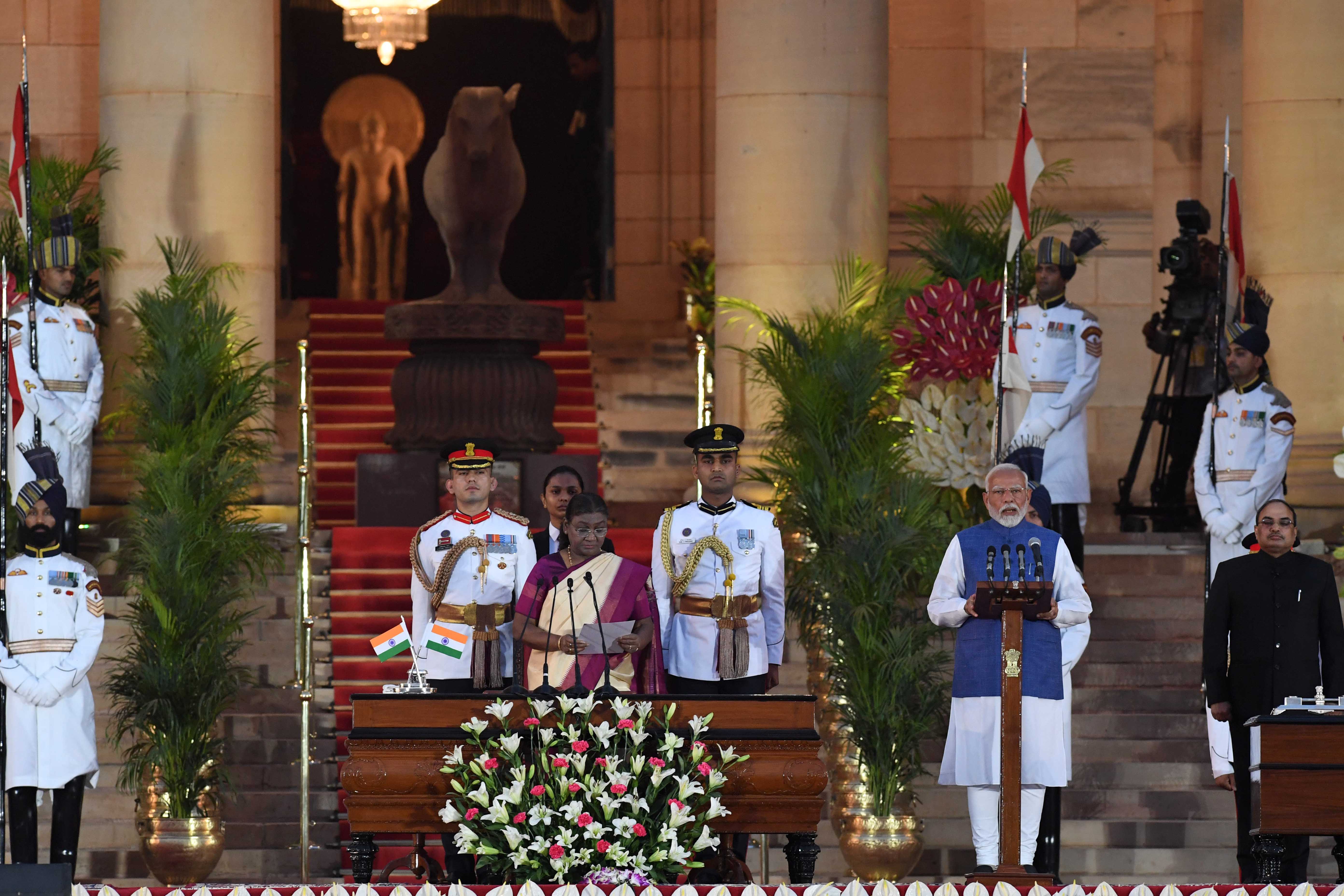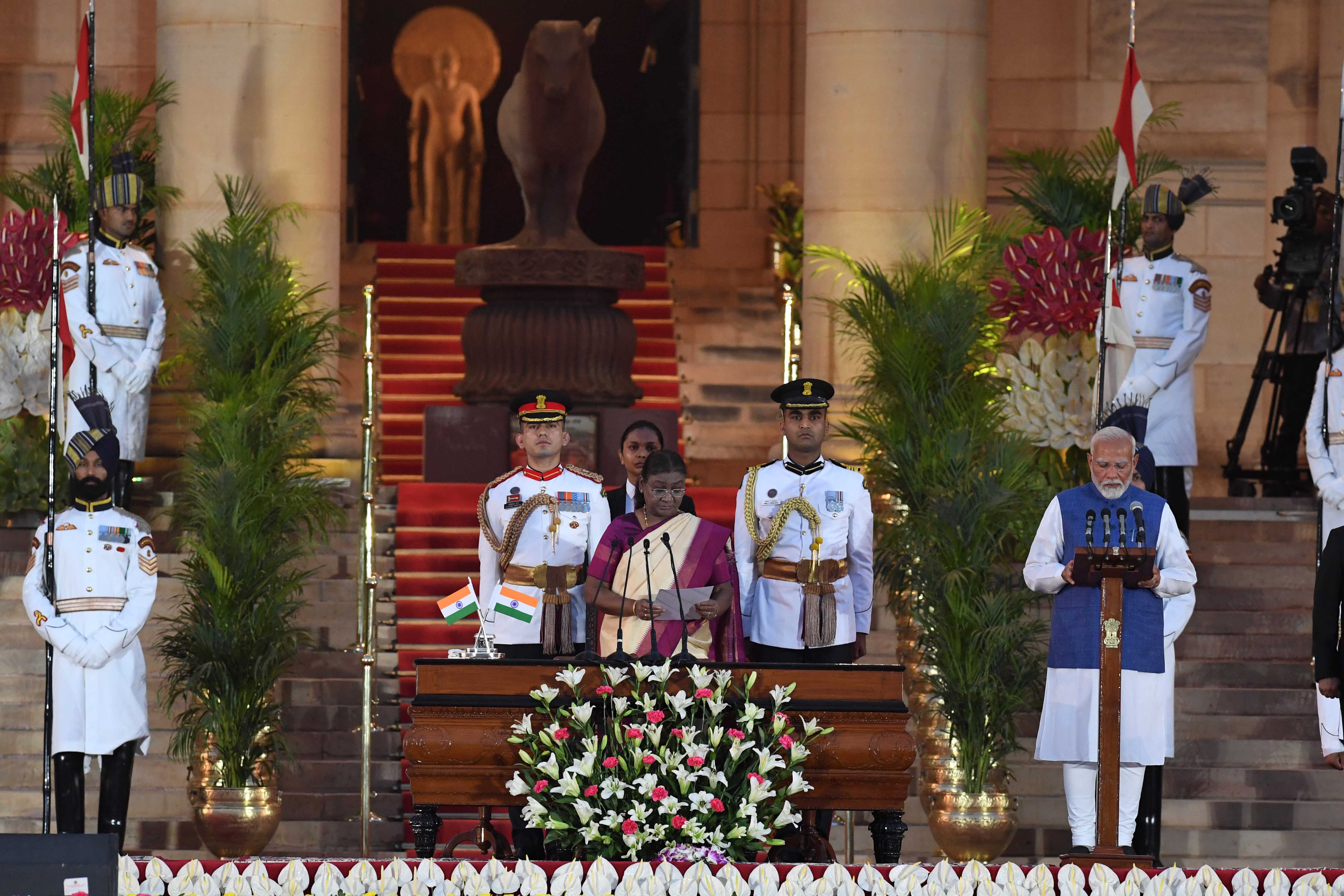 | Caption: | The President of India, Smt Droupadi Murmu administered the oath of office and secrecy to Prime Minister Shri Narendra Modi at the swearing-in-ceremony held at Rashtrapati Bhavan on June 09, 2024. |