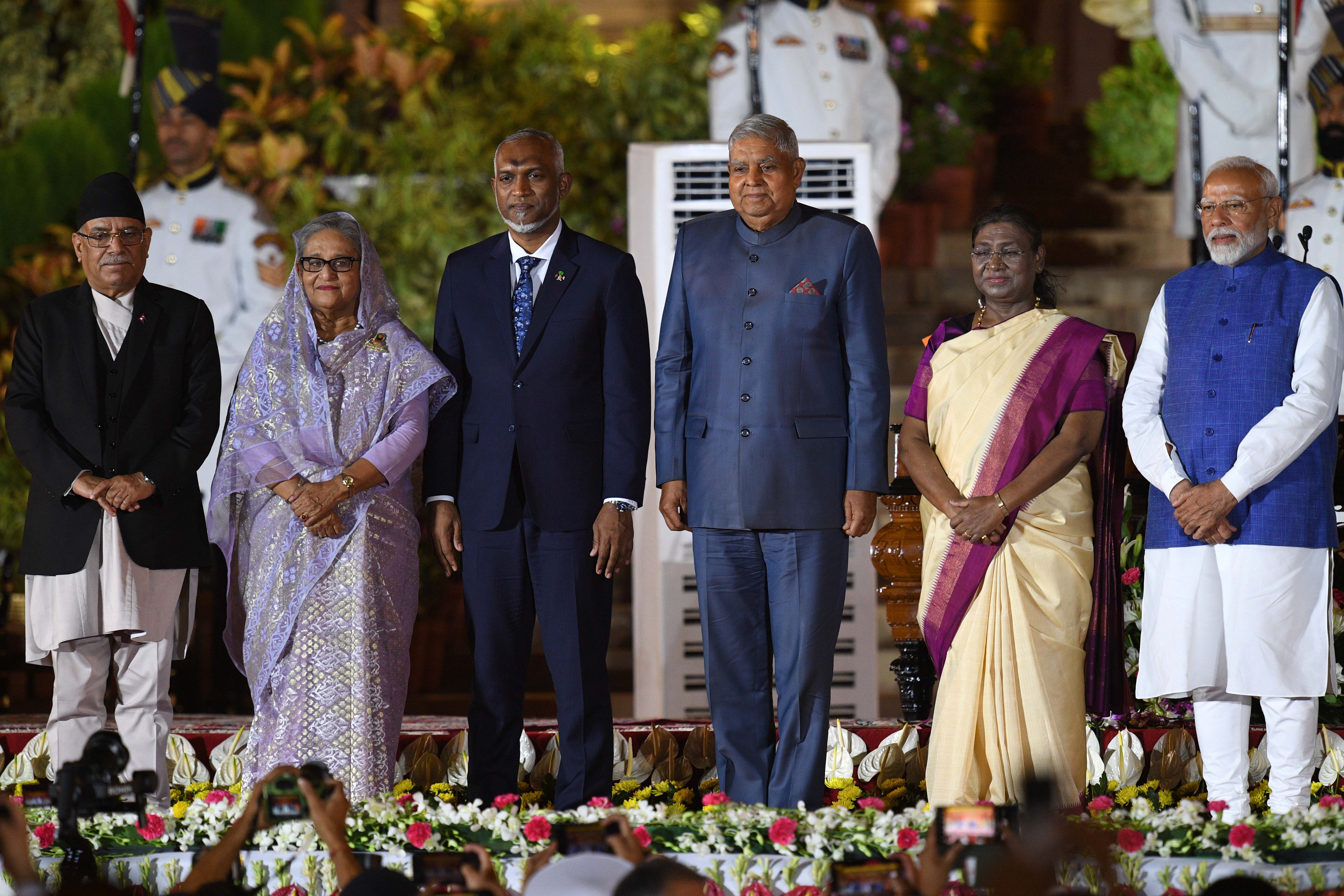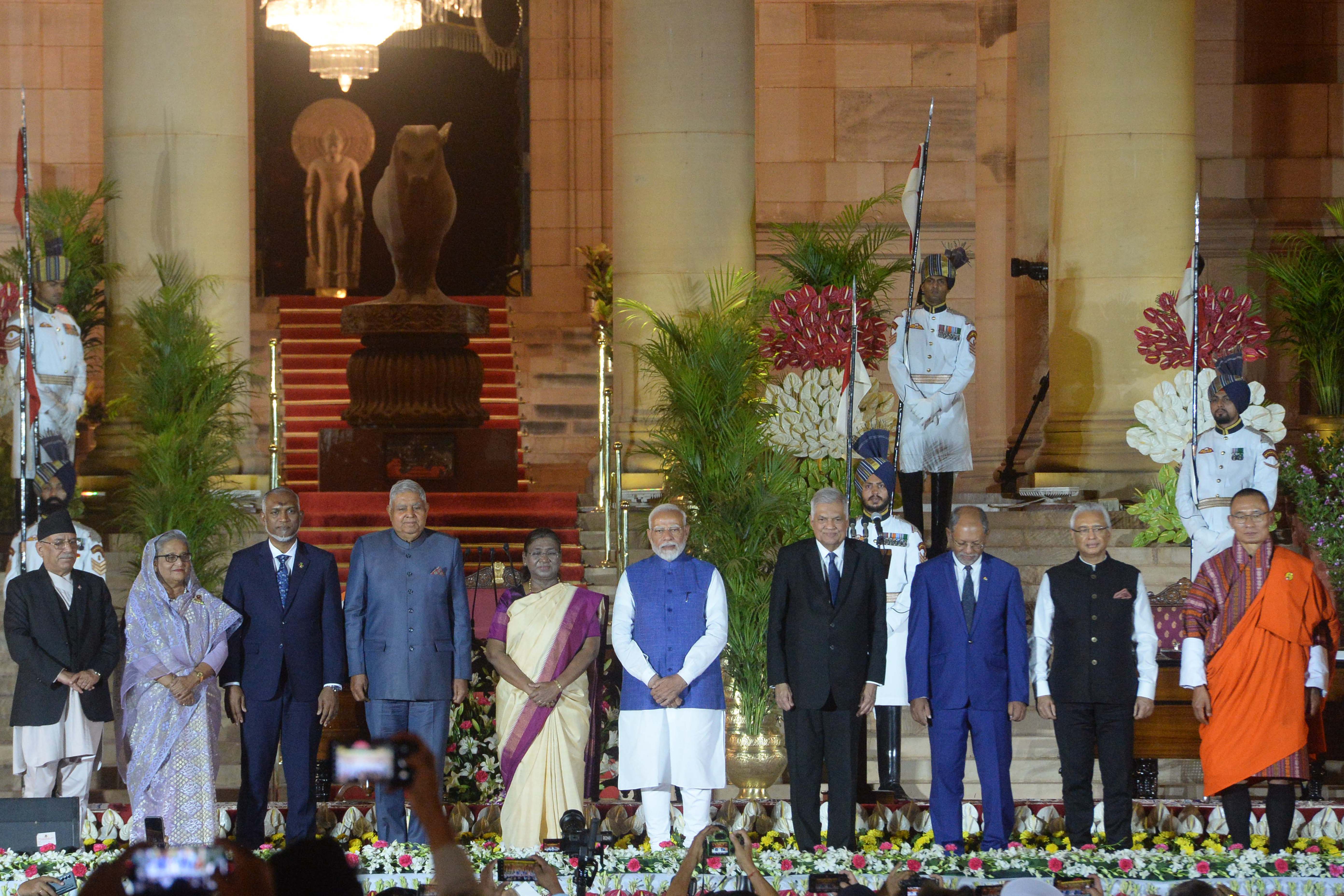 | Caption: | The Leaders of Sri Lanka, the Maldives, Seychelles, Bangladesh, Mauritius, Nepal, and Bhutan with the President of India Smt Droupadi Murmu, Vice President Shri Jagdeep Dhankhar Dhankhar and Prime Minister Shri Narendra Modi at the forecourt of Rashtrapati Bhavan following the swearing-in ceremony on June 9, 2024. |