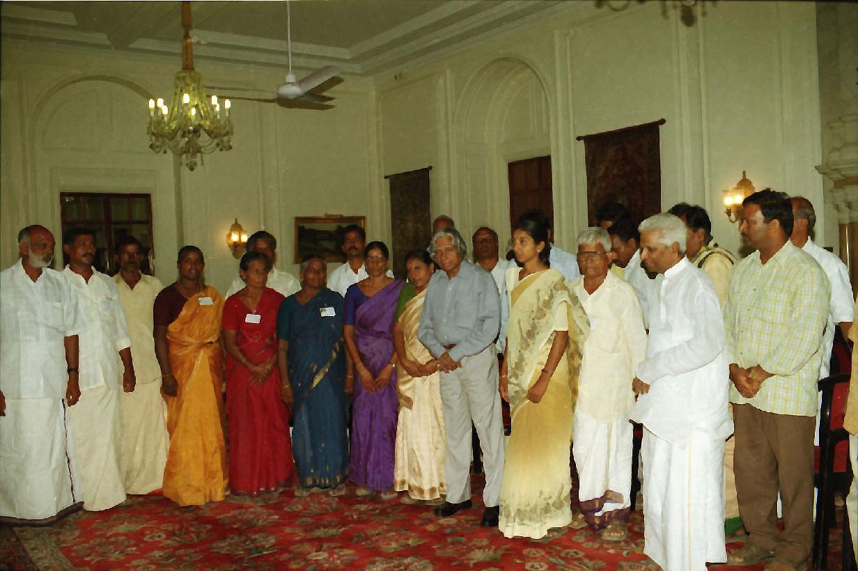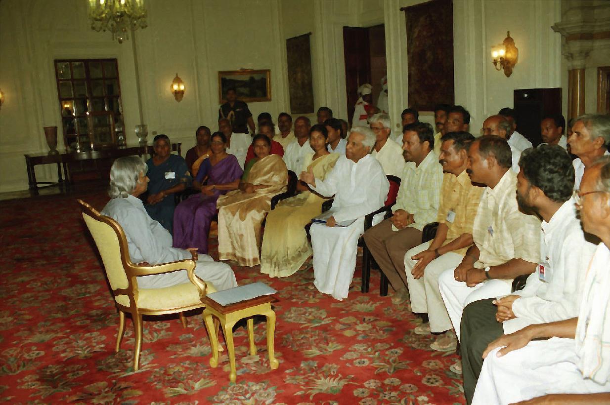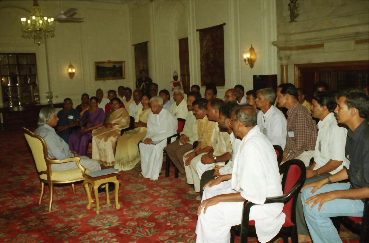 | Caption: | The President of India, Dr A P J Abdul Kalam meeting with the Farmers Associated with ''Swarnamukhi Rejuvenation Project'' from Andhra Pradesh led by Dr G Munirathnam, Hony General Secretary, Rashtriya Seva Samithi at the Yellow Drawing Room of Rashtrapati Bhavan in New Delhi on Aug 24, 2002 |