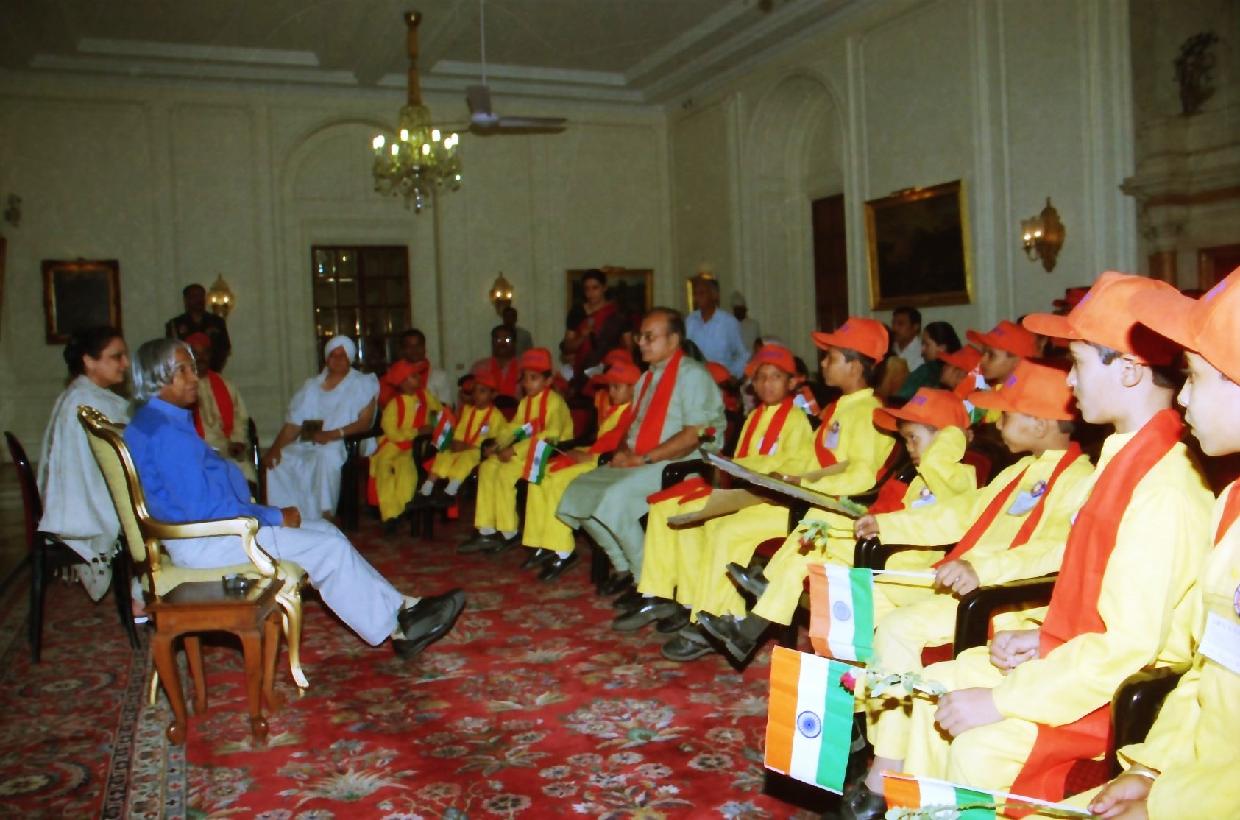 | Caption: | The Children from Jeevan Prabhat Aryan Samaj Gandhidham Kutch Gujarat calling on the President of India, Dr A P J Abdul Kalam at the Yellow Drawing Room of Rashtrapati Bhavan in New Delhi on May 05, 2003 |