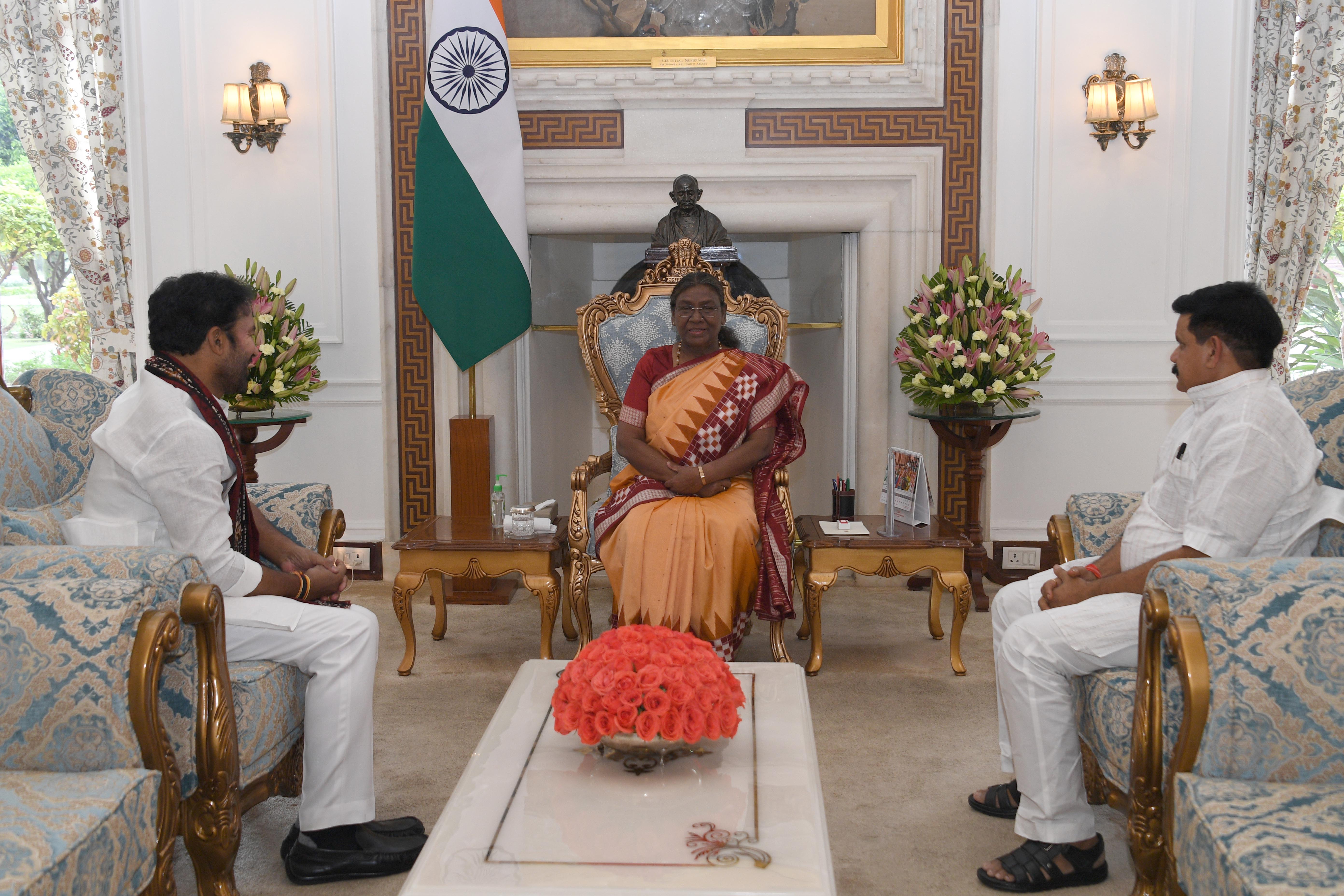 | Caption: | The Union Minister for Coal and Mines, Shri G. Kishan Reddy along with Minister of State for Coal and Mines, Shri Satish Chandra Dubey called on the President of India Smt. Droupadi Murmu at Rashtrapati Bhavan on June 14, 2024. |