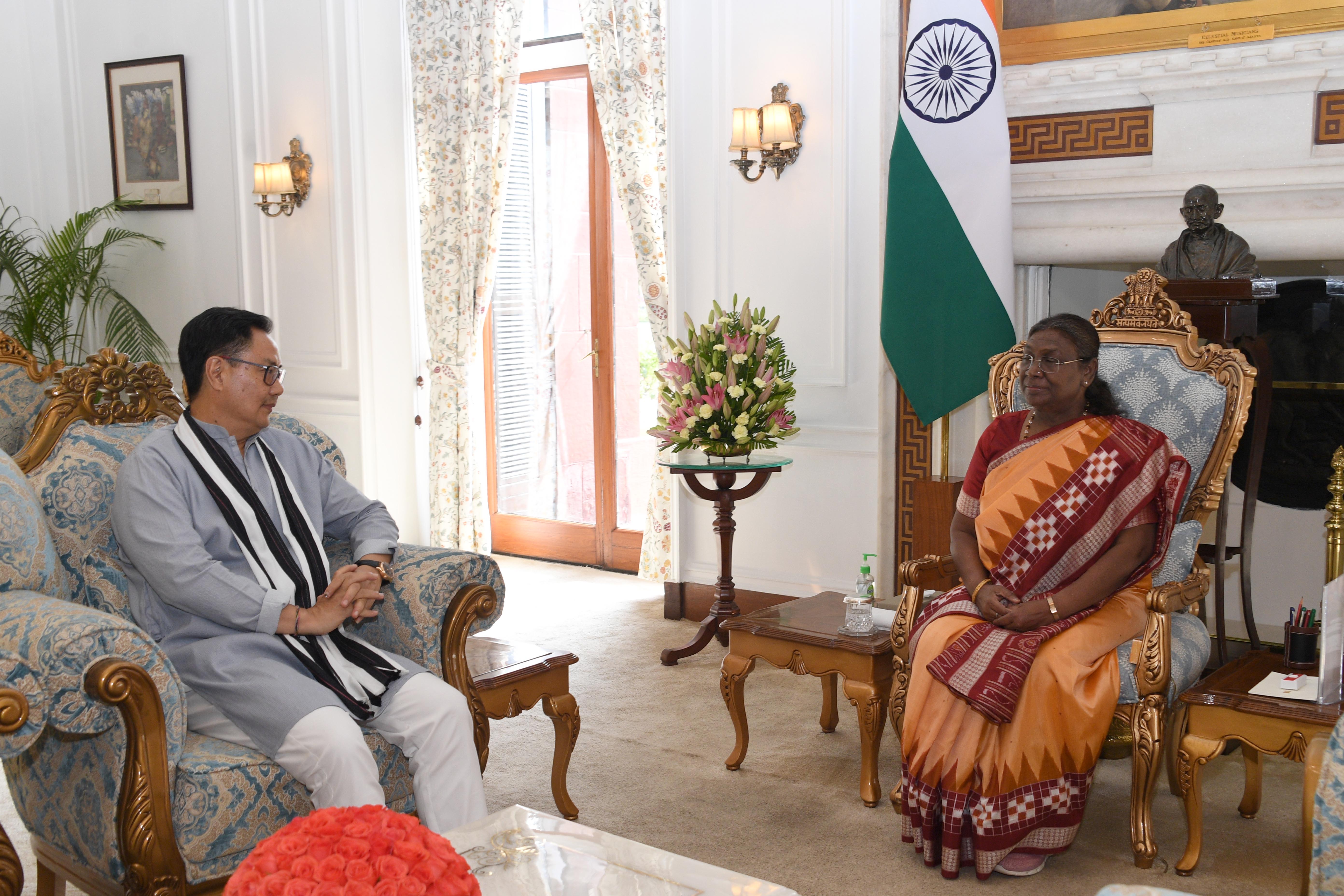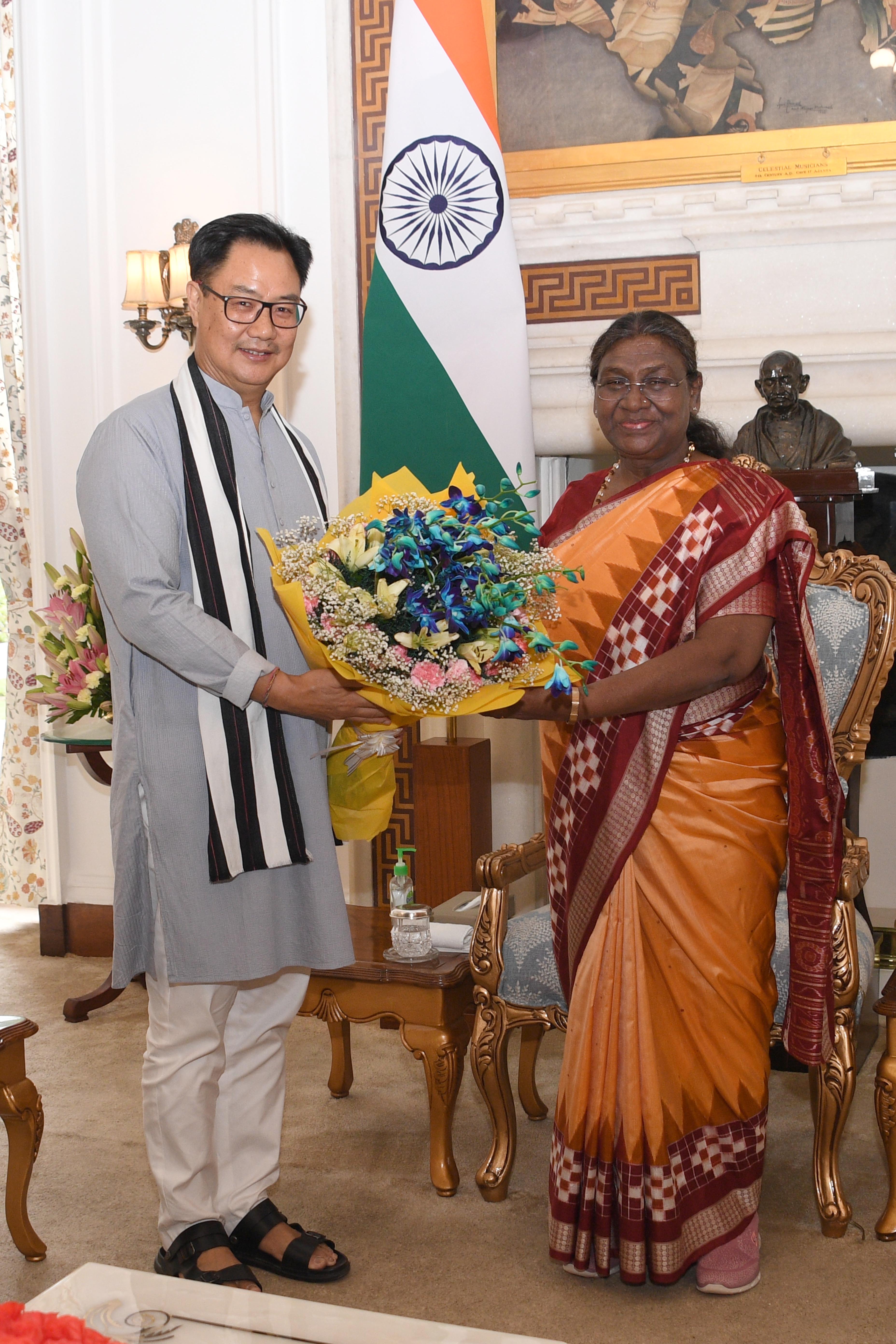 | Caption: | The Union Minister for Parliamentary Affairs and Minority Affairs, Shri Kiren Rijiju called on the President of India Smt. Droupadi Murmu at Rashtrapati Bhavan on June 14, 2024. |