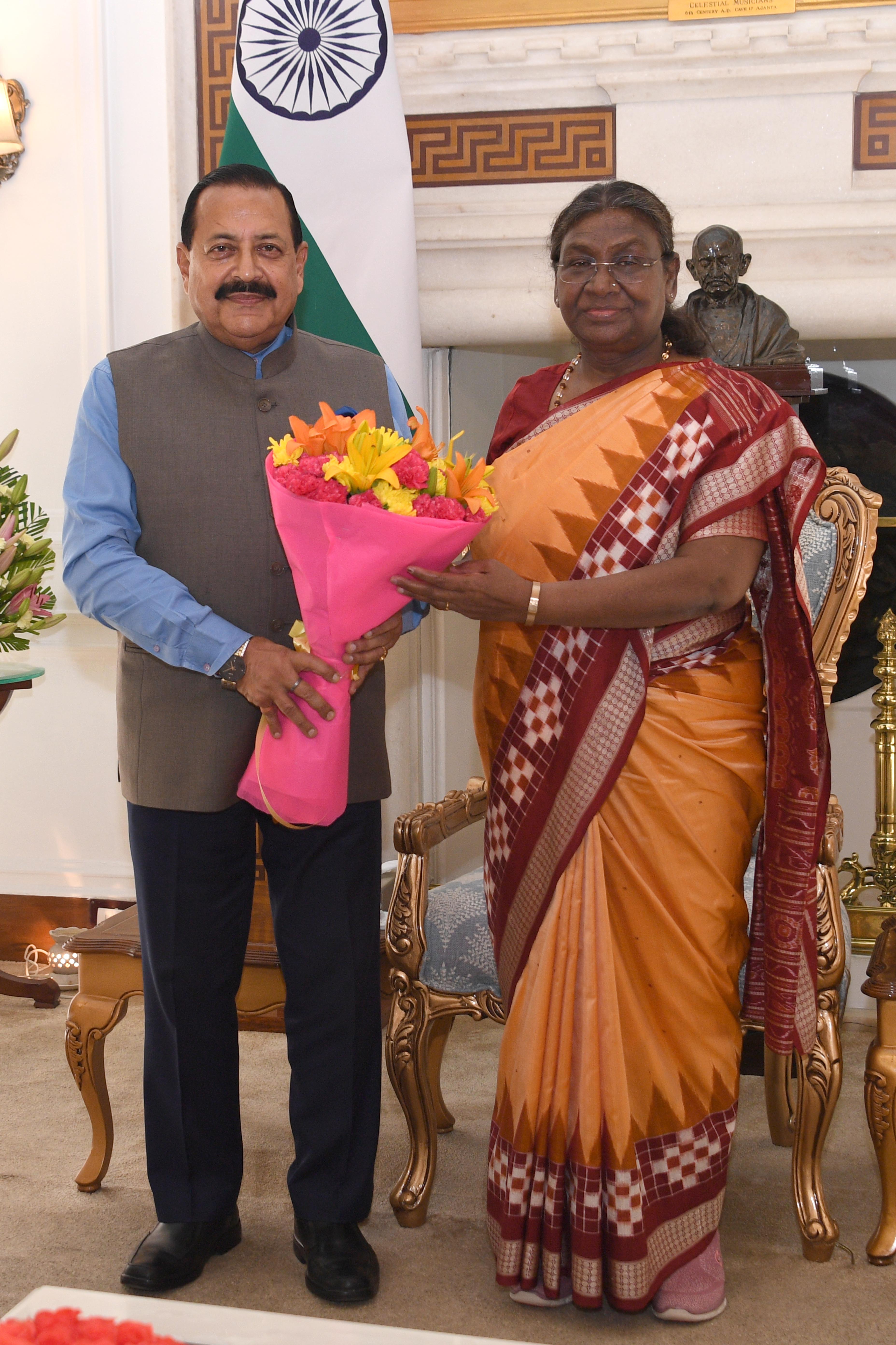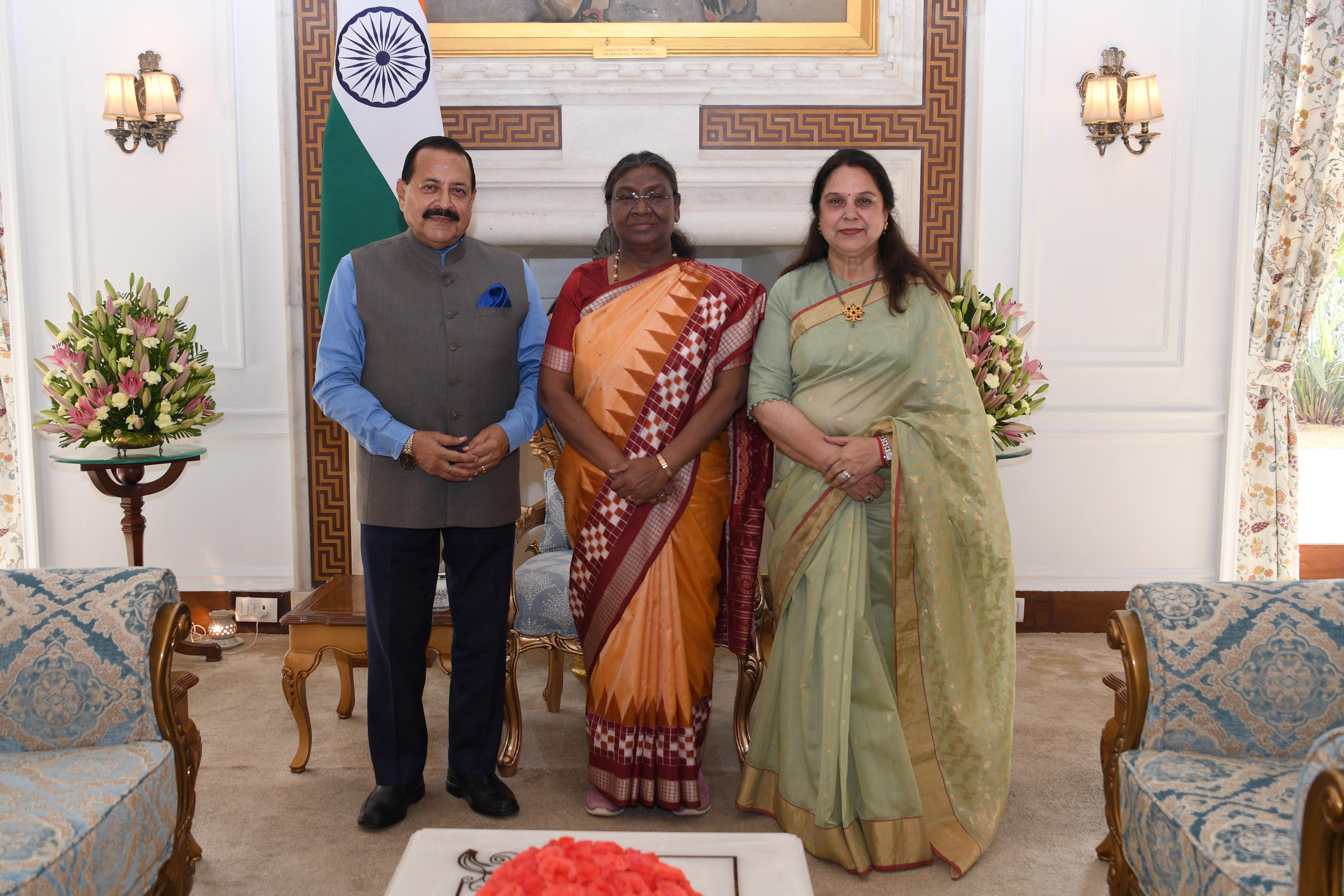 | Caption: | The Minister of State (IC) for Science Technology and Earth Sciences and Minister of State in PMO, Personnel, Public Grievances Pensions, Department of Atomic Energy and Department of Space, Dr Jitendra Singh along with spouse Smt. Manju Devi called on the President of India Smt. Droupadi Murmu at Rashtrapati Bhavan on June 14, 2024. |