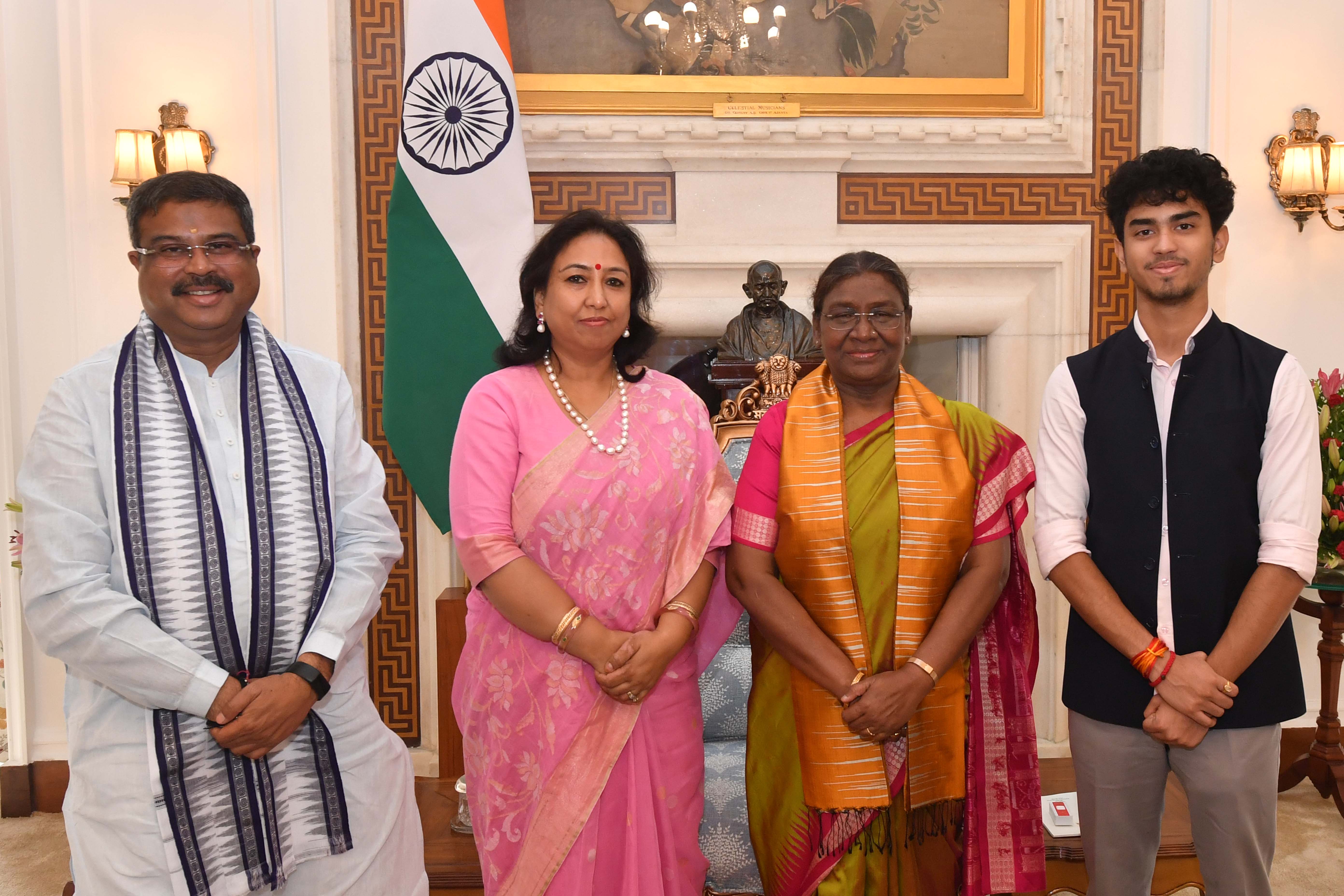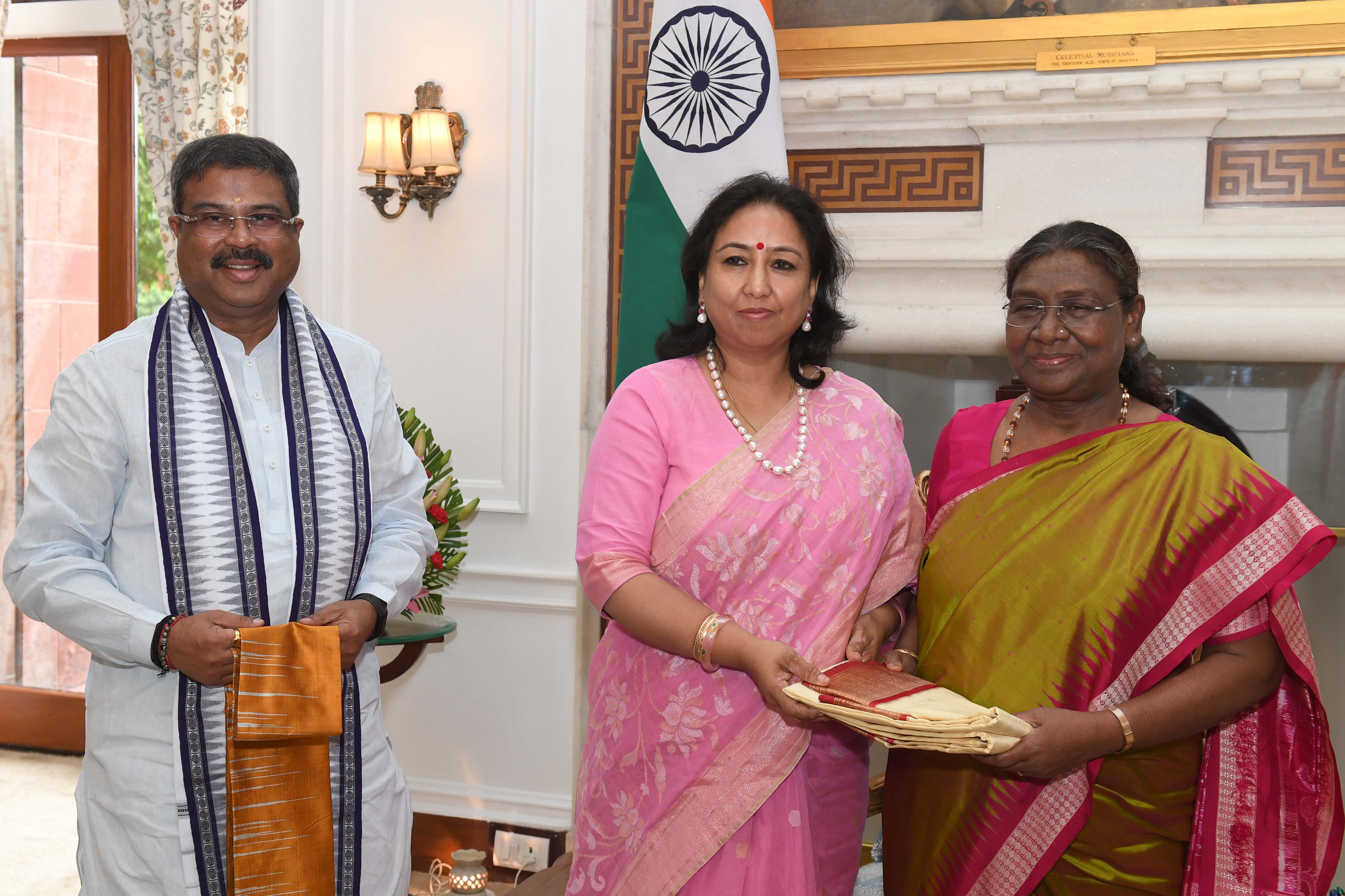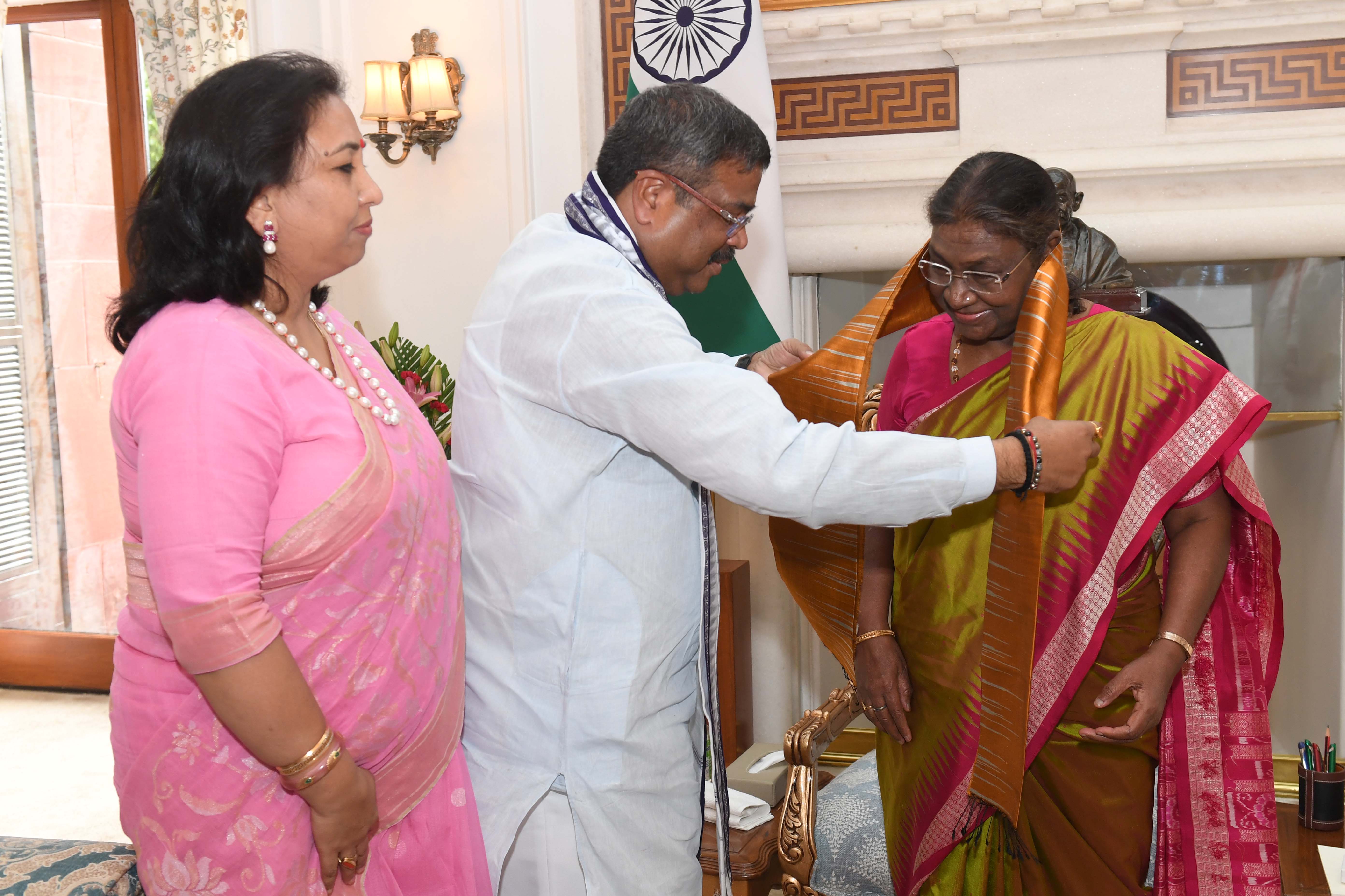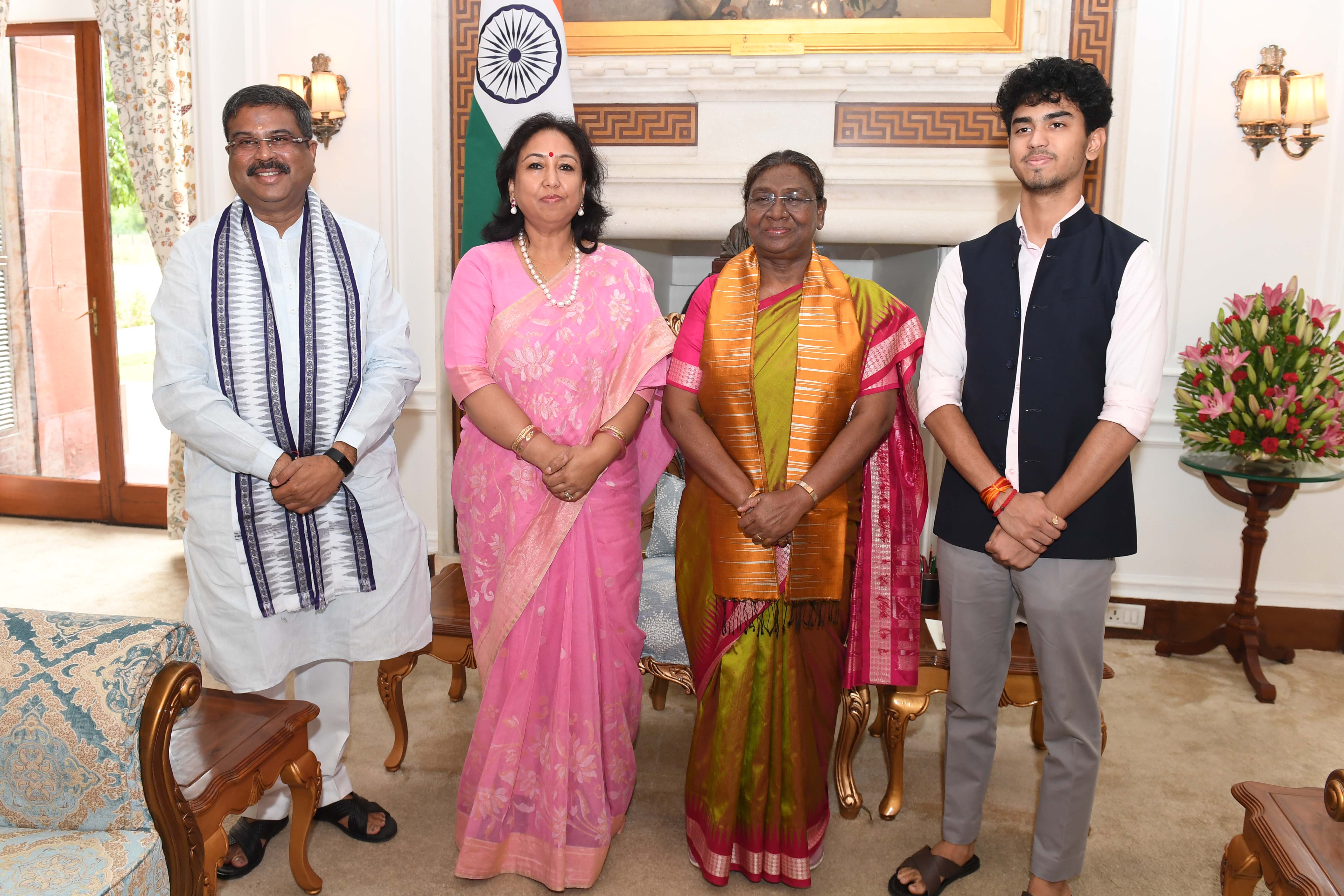 | Caption: | The Union Minister for Education, Shri Dharmendra Pradhan along with Ministers of State for Education, Shri Jayant Chaudhary and Dr Sukanta Majumdar called on the President of India Smt. Droupadi Murmu at Rashtrapati Bhavan on June 20, 2024. |