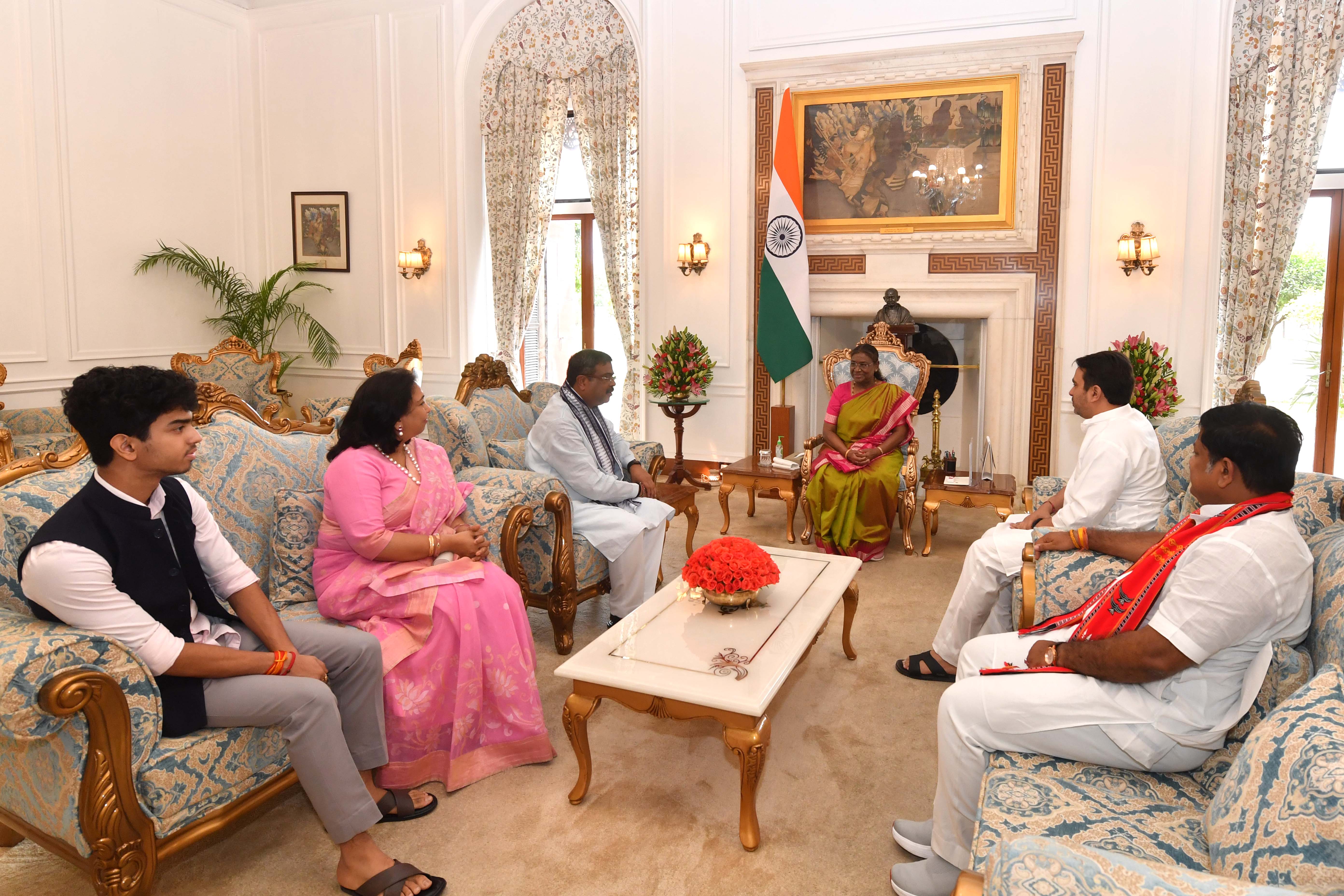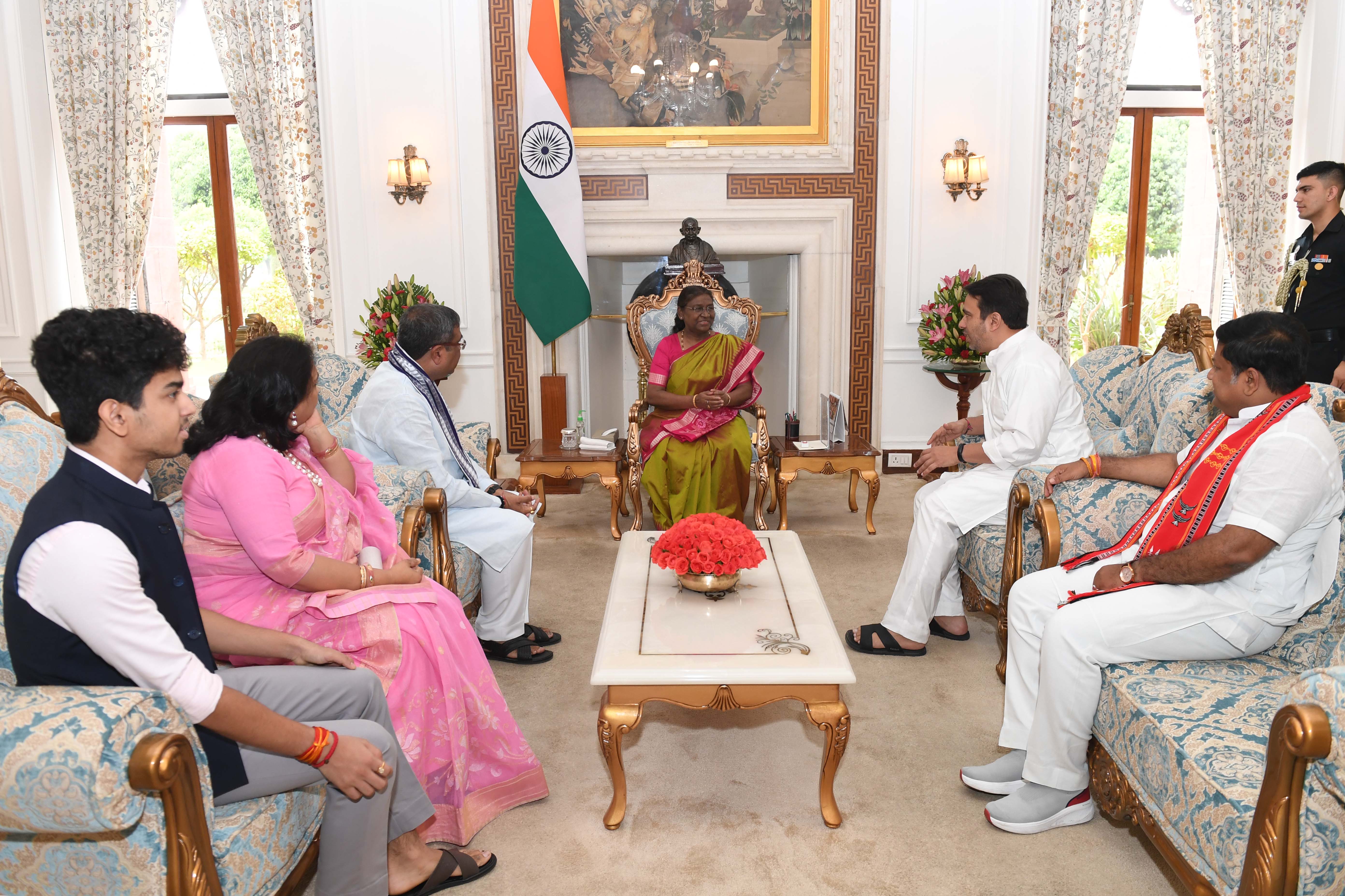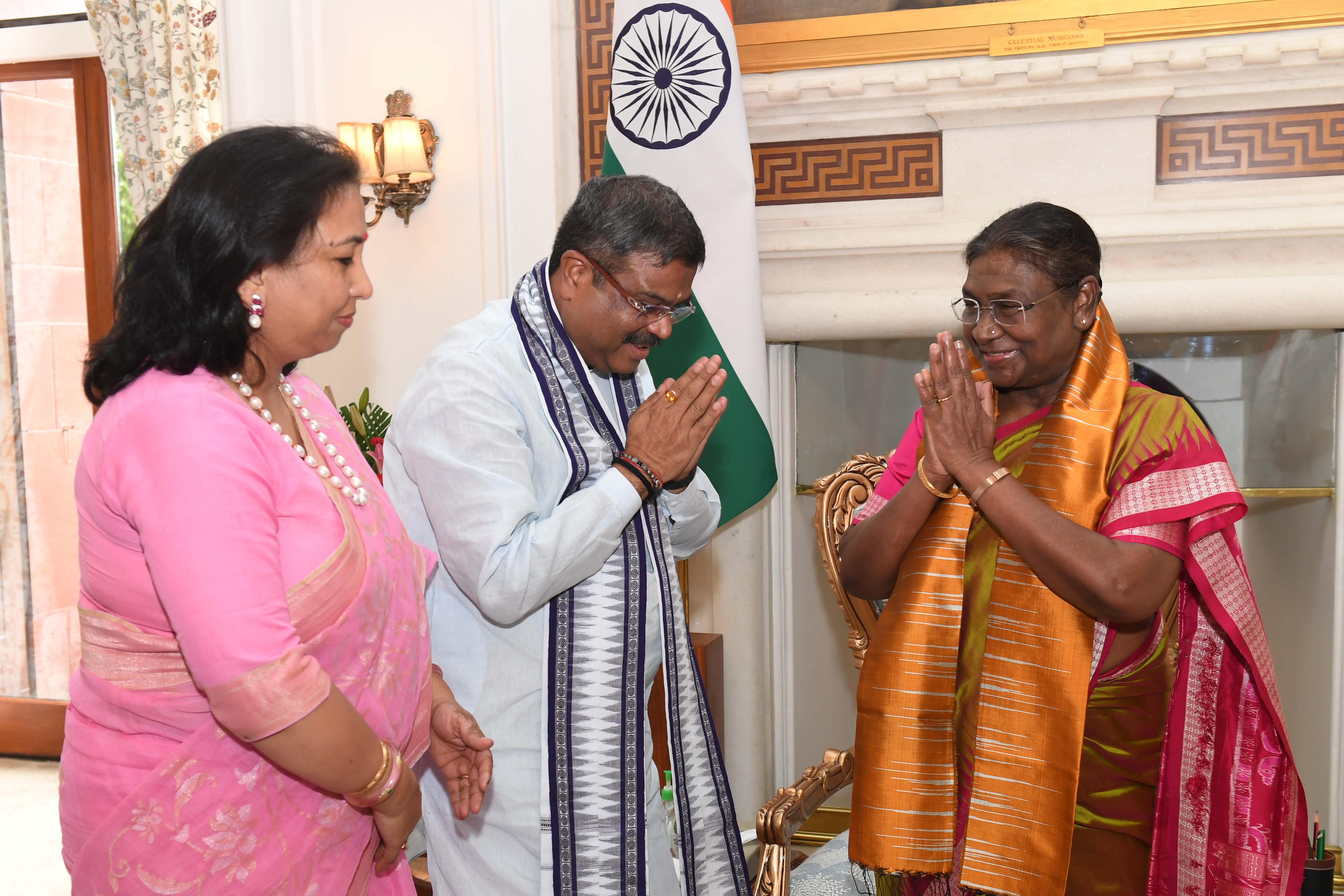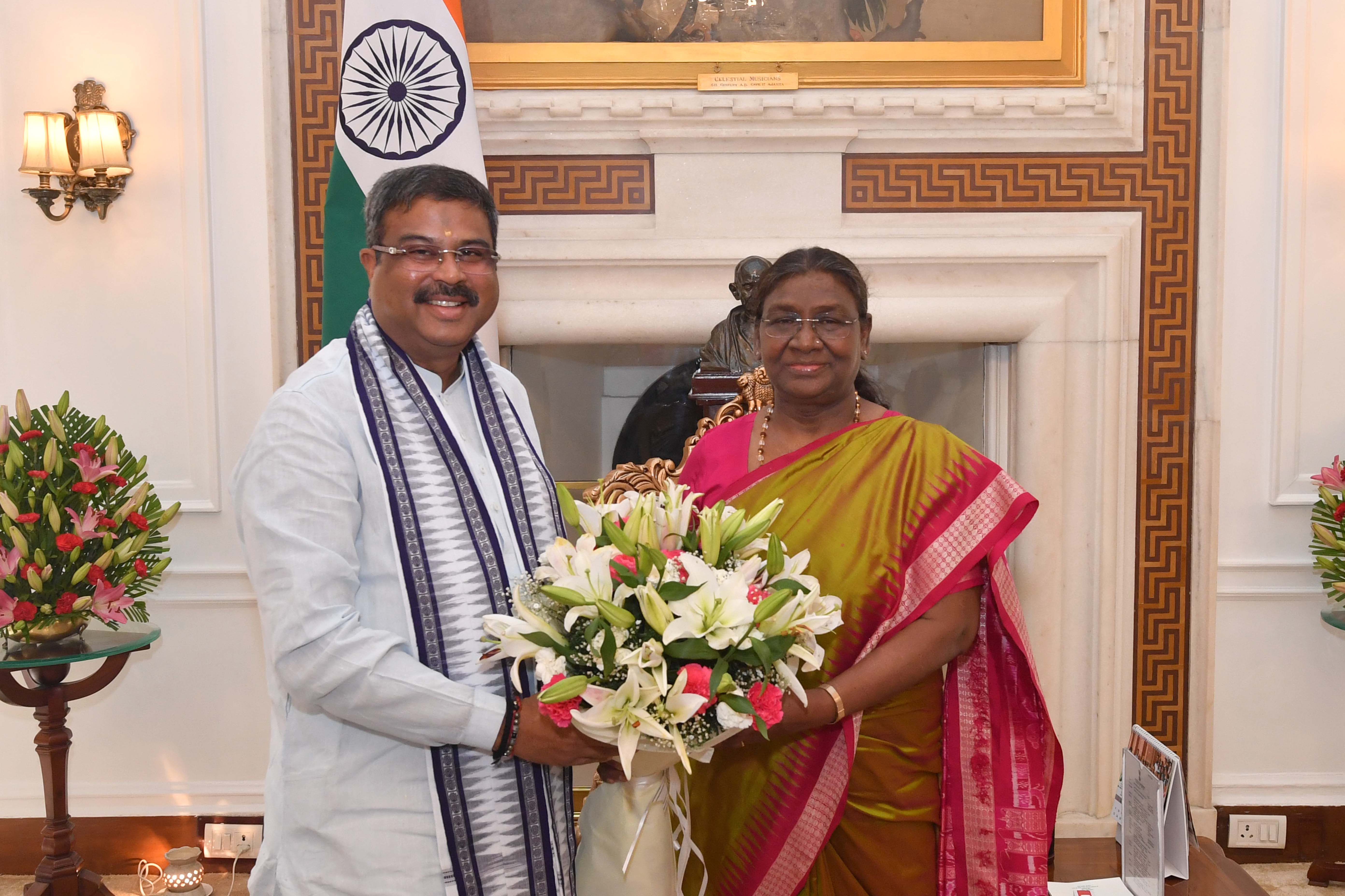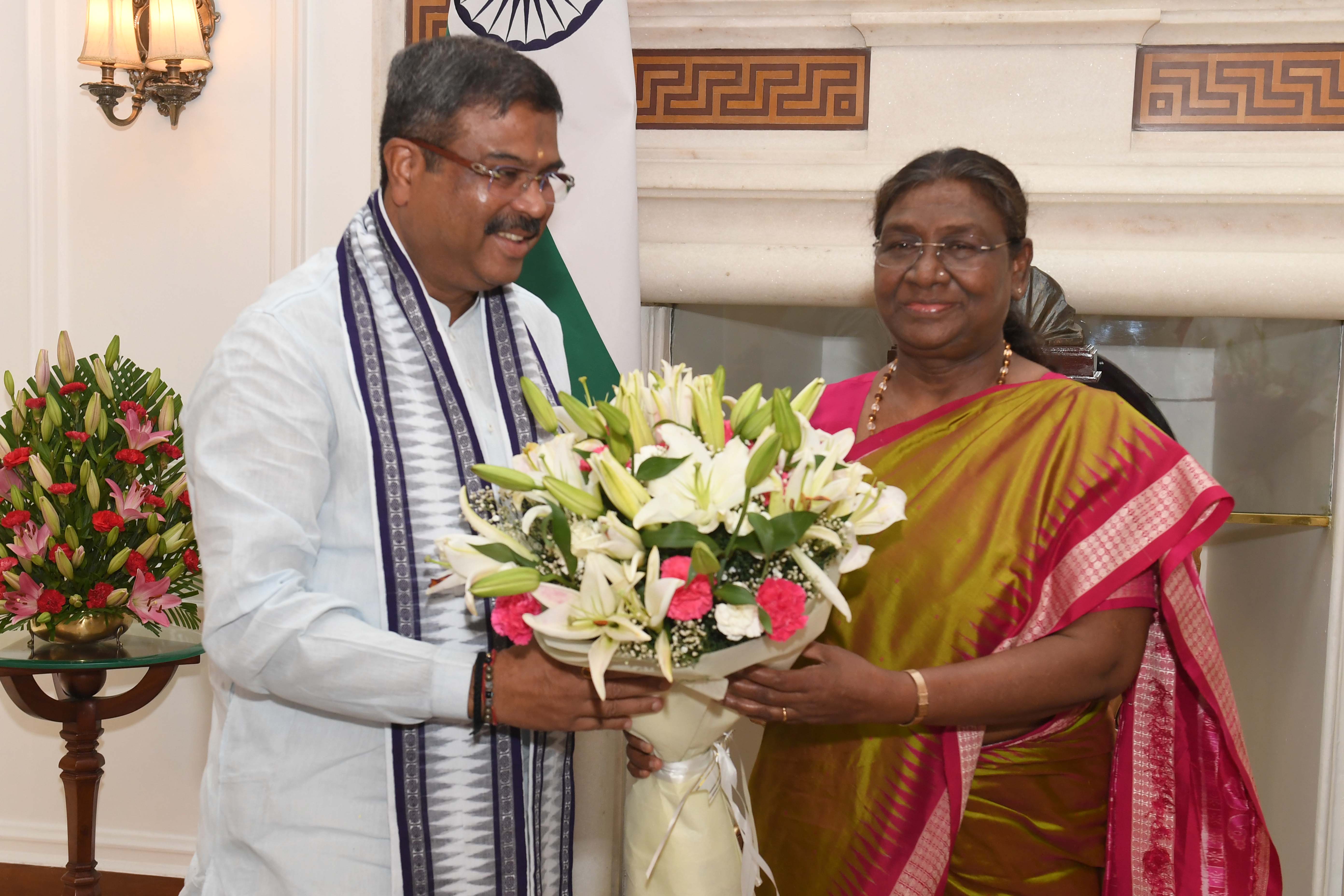 | Caption: | The Union Minister for Education, Shri Dharmendra Pradhan along with Ministers of State for Education, Shri Jayant Chaudhary and Dr Sukanta Majumdar called on the President of India Smt. Droupadi Murmu at Rashtrapati Bhavan on June 20, 2024. |