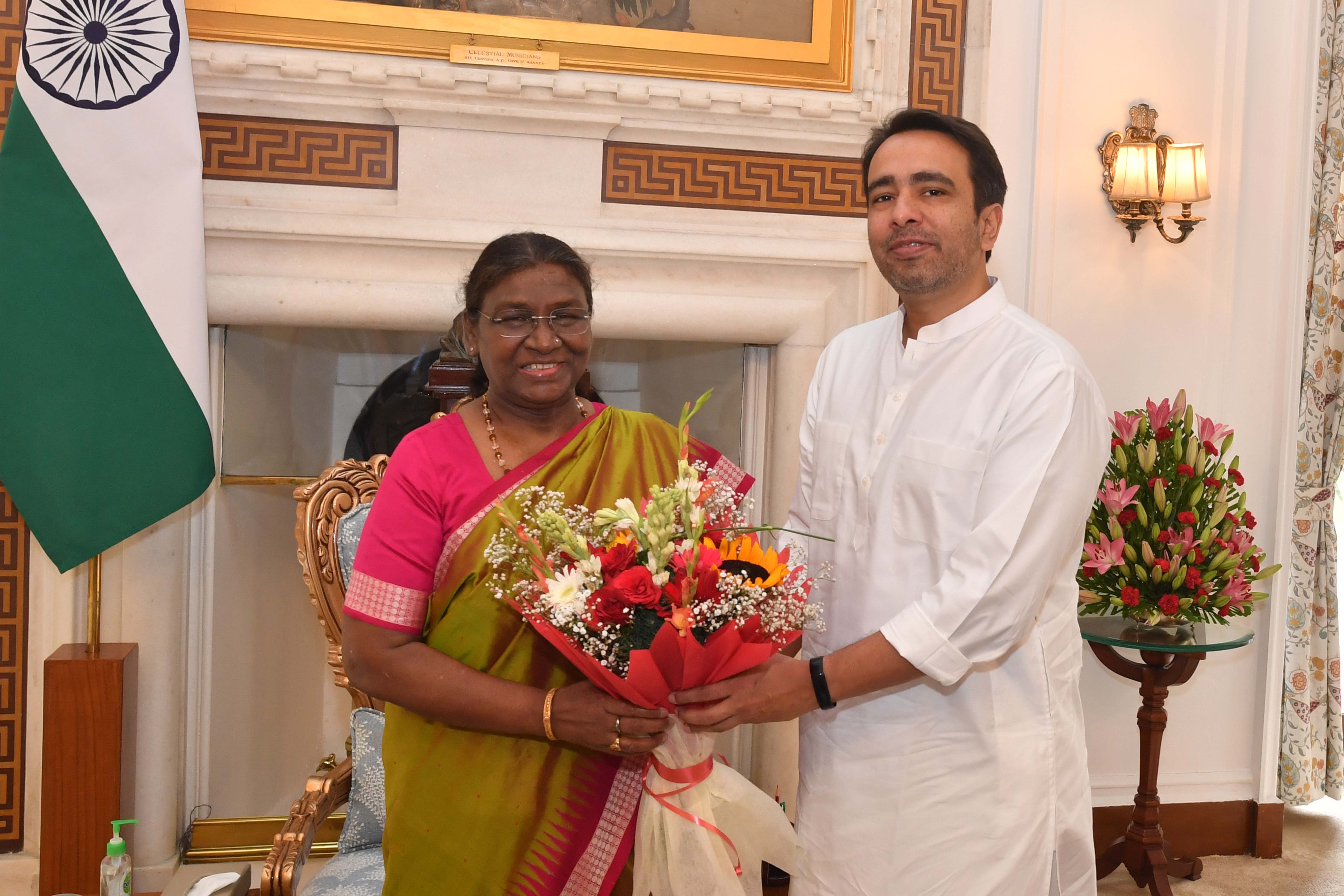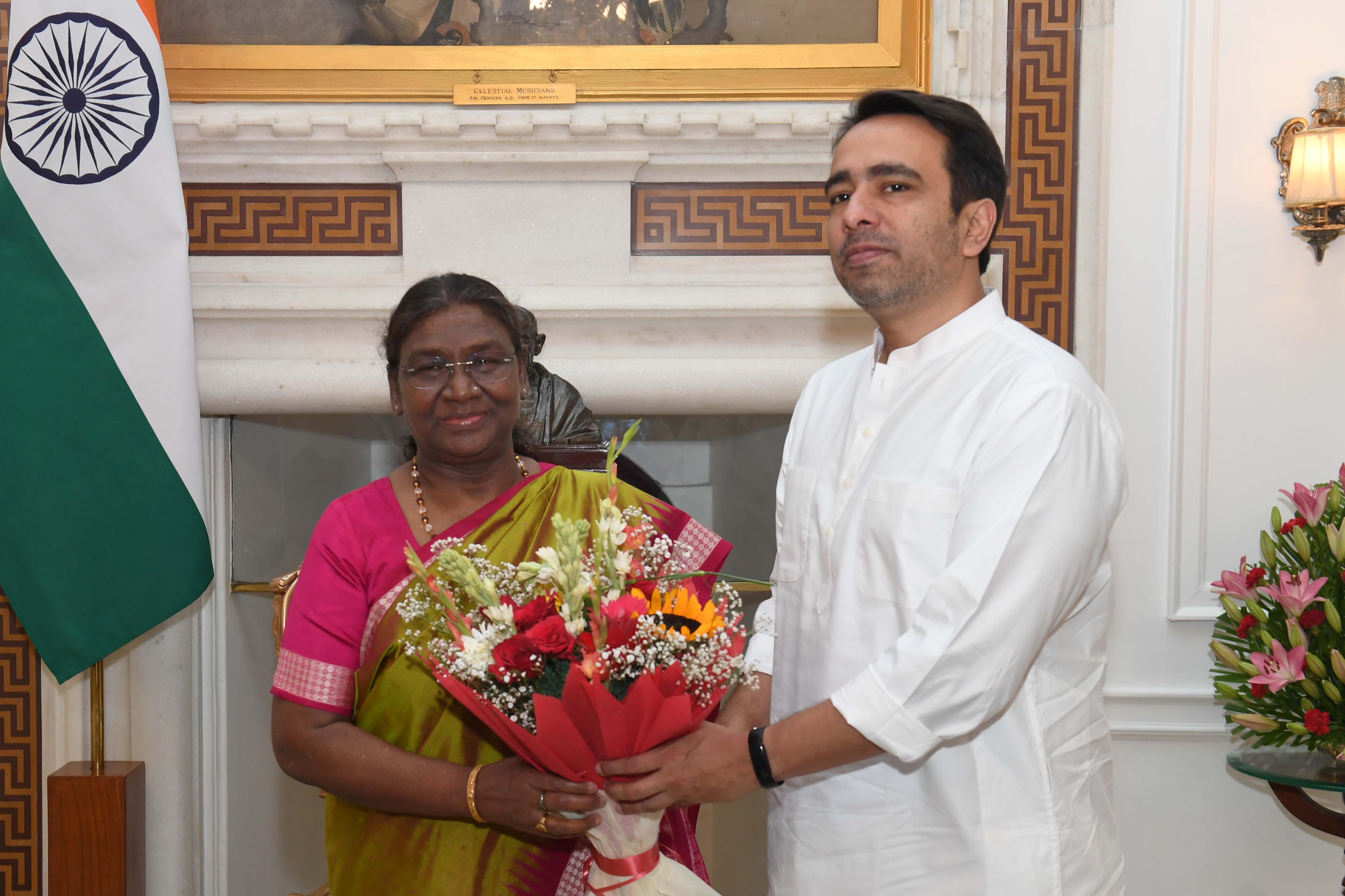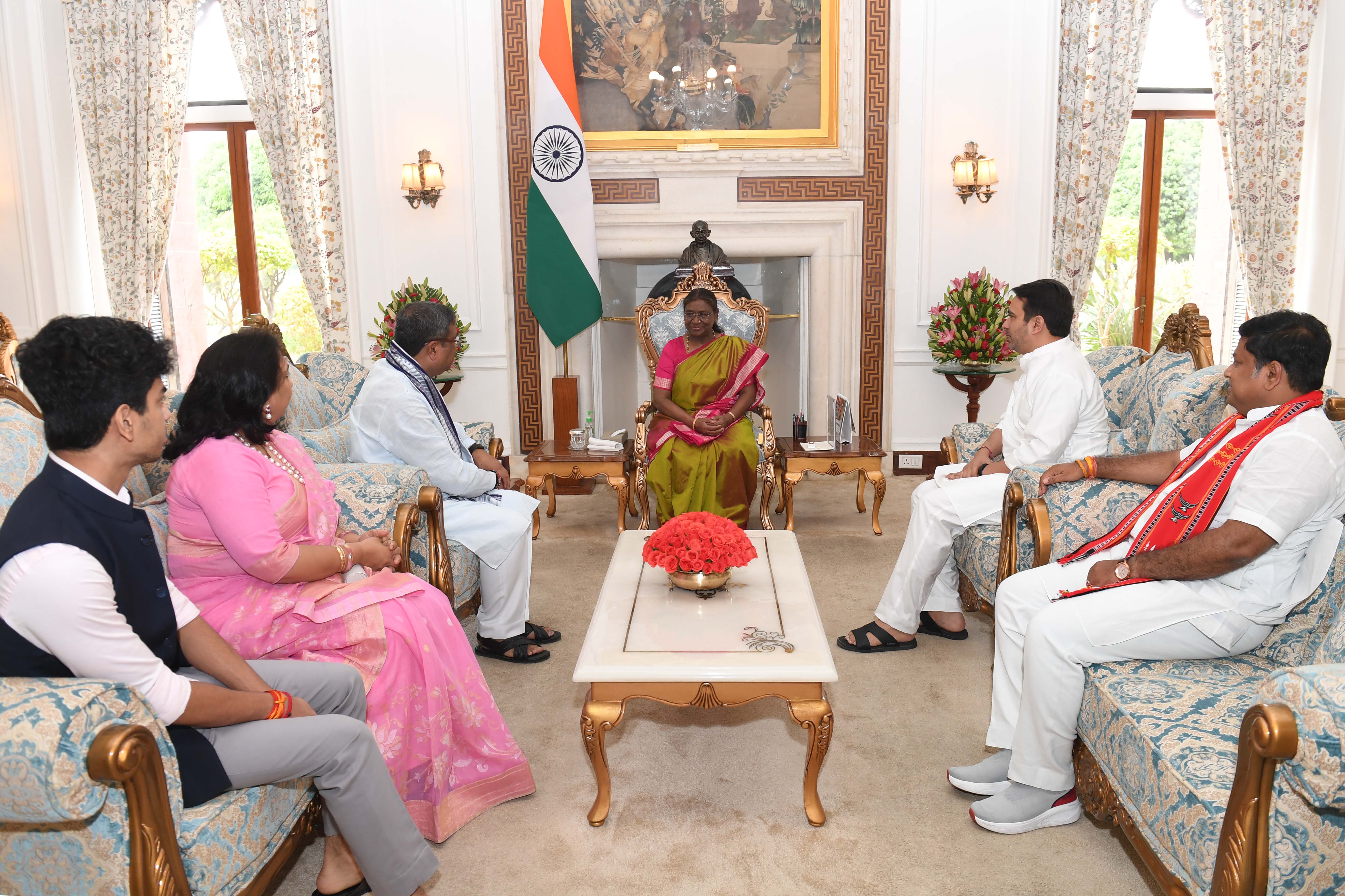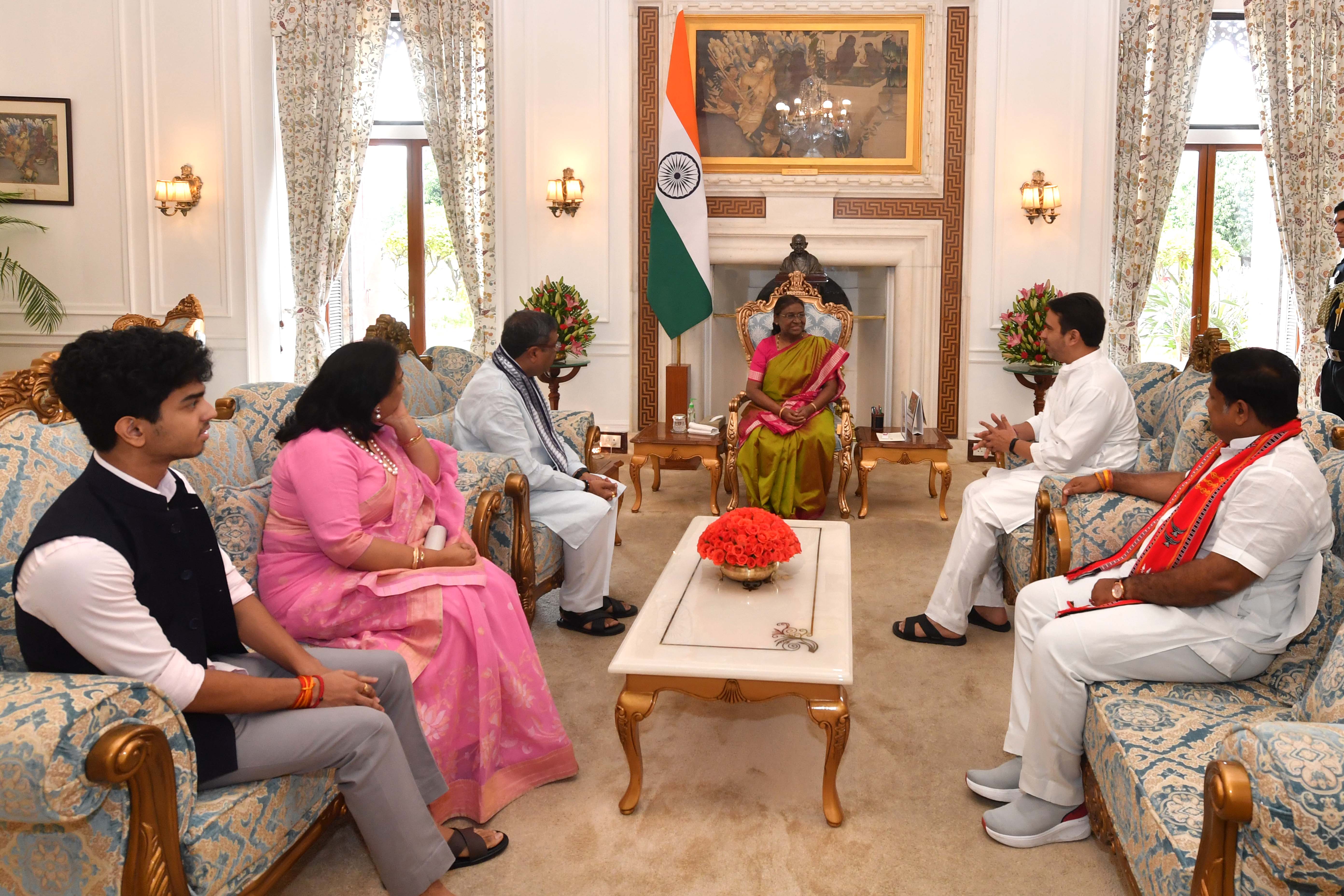 | Caption: | The Union Minister for Education, Shri Dharmendra Pradhan along with Ministers of State for Education, Shri Jayant Chaudhary and Dr Sukanta Majumdar called on the President of India Smt. Droupadi Murmu at Rashtrapati Bhavan on June 20, 2024. |