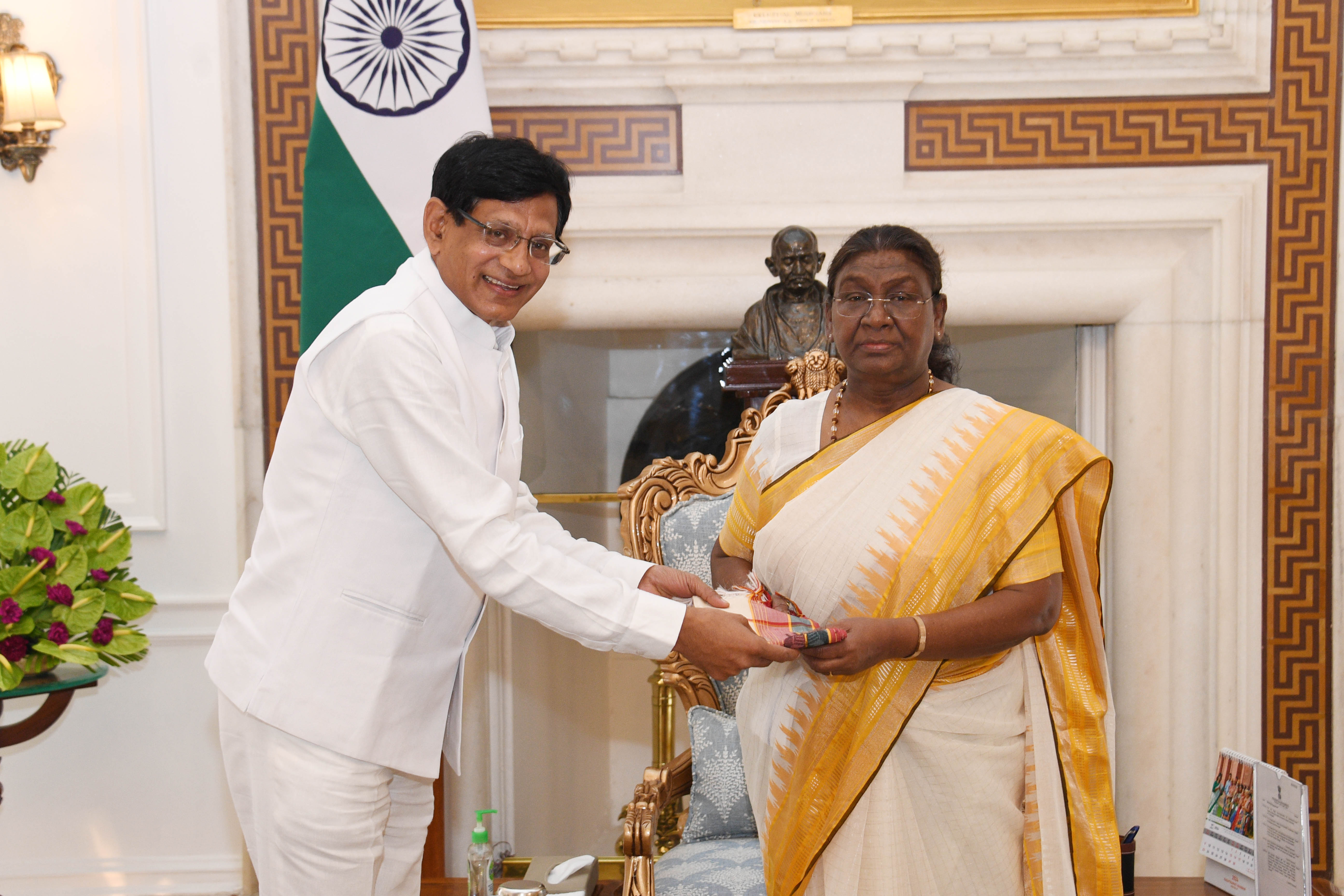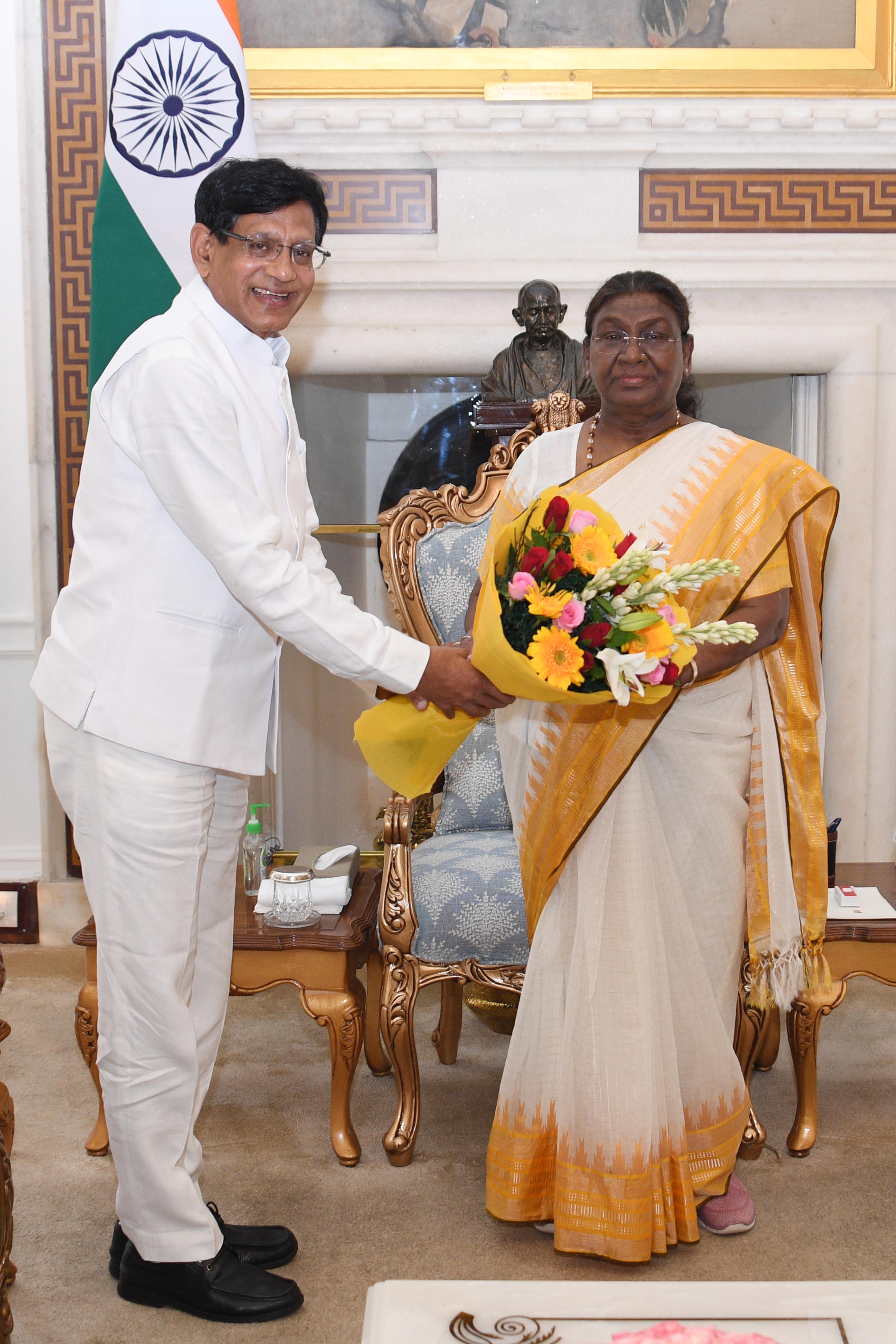 | Caption: | Prof. P.K. Patra , Vice-Chancellor, Pt. Deendayal Upadhyay Memorial Health Sciences Ayush University of Chhattisgarh meeting with the President of India Smt. Droupadi Murmu at Rashtrapati Bhavan on Jun 25, 2024. |