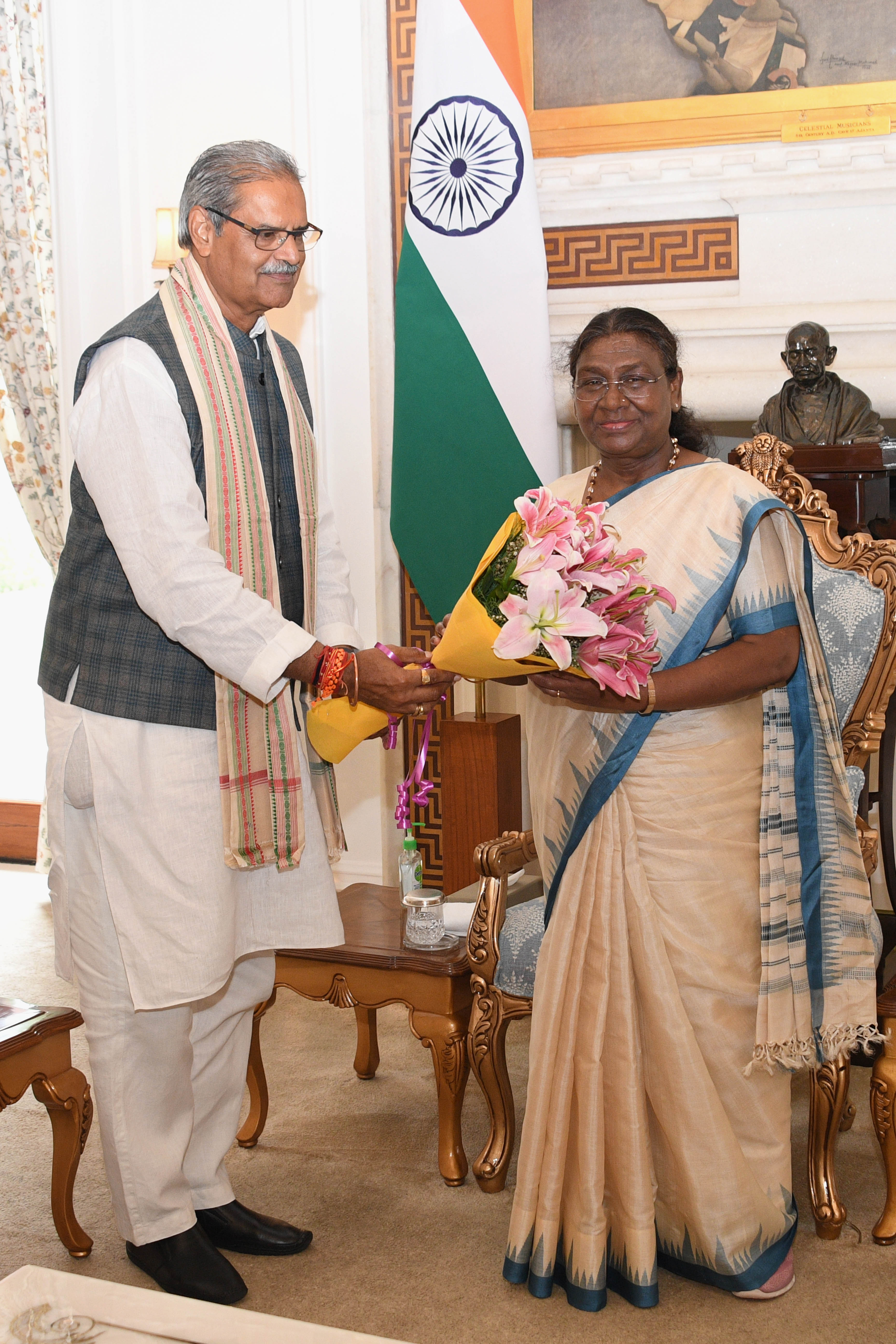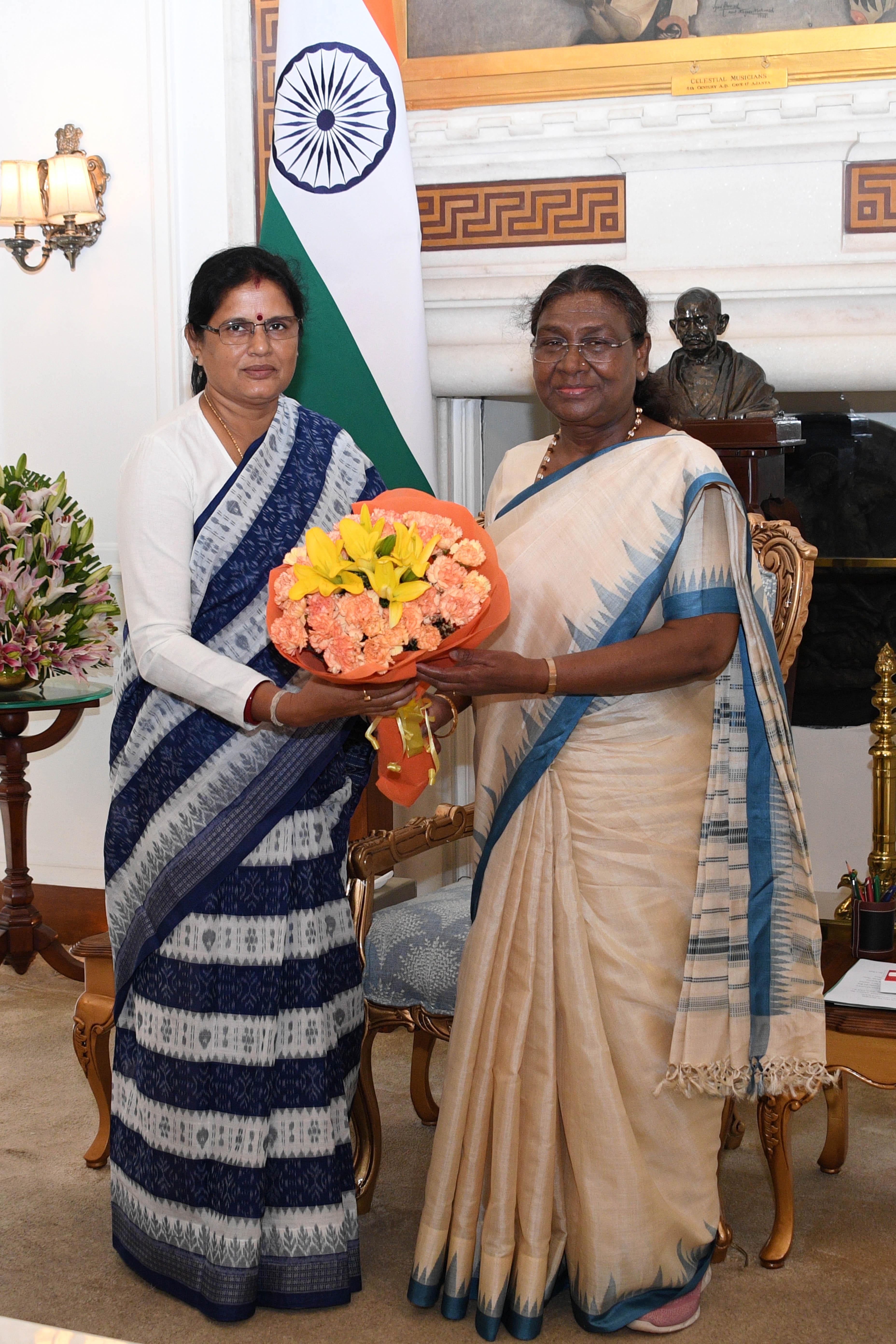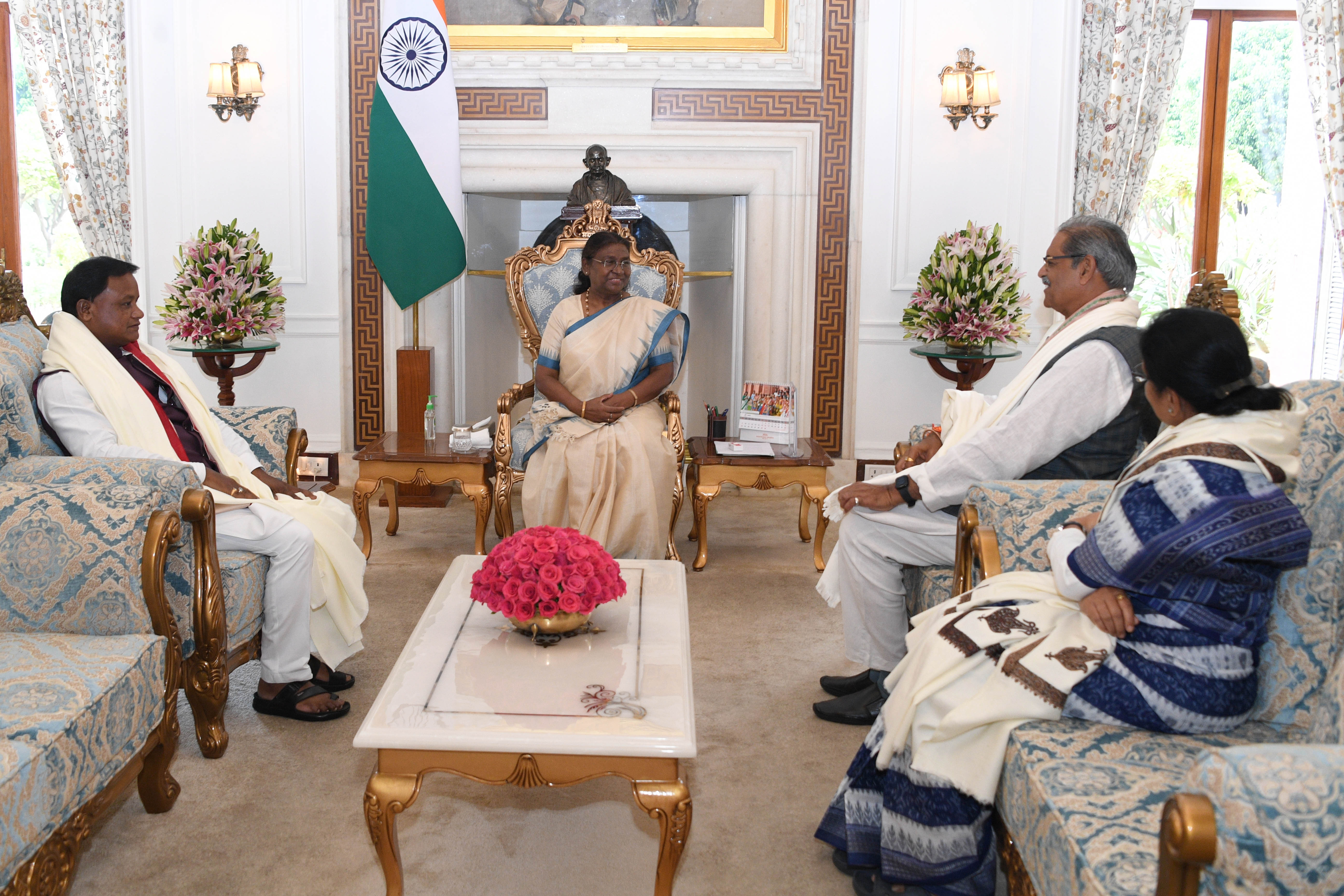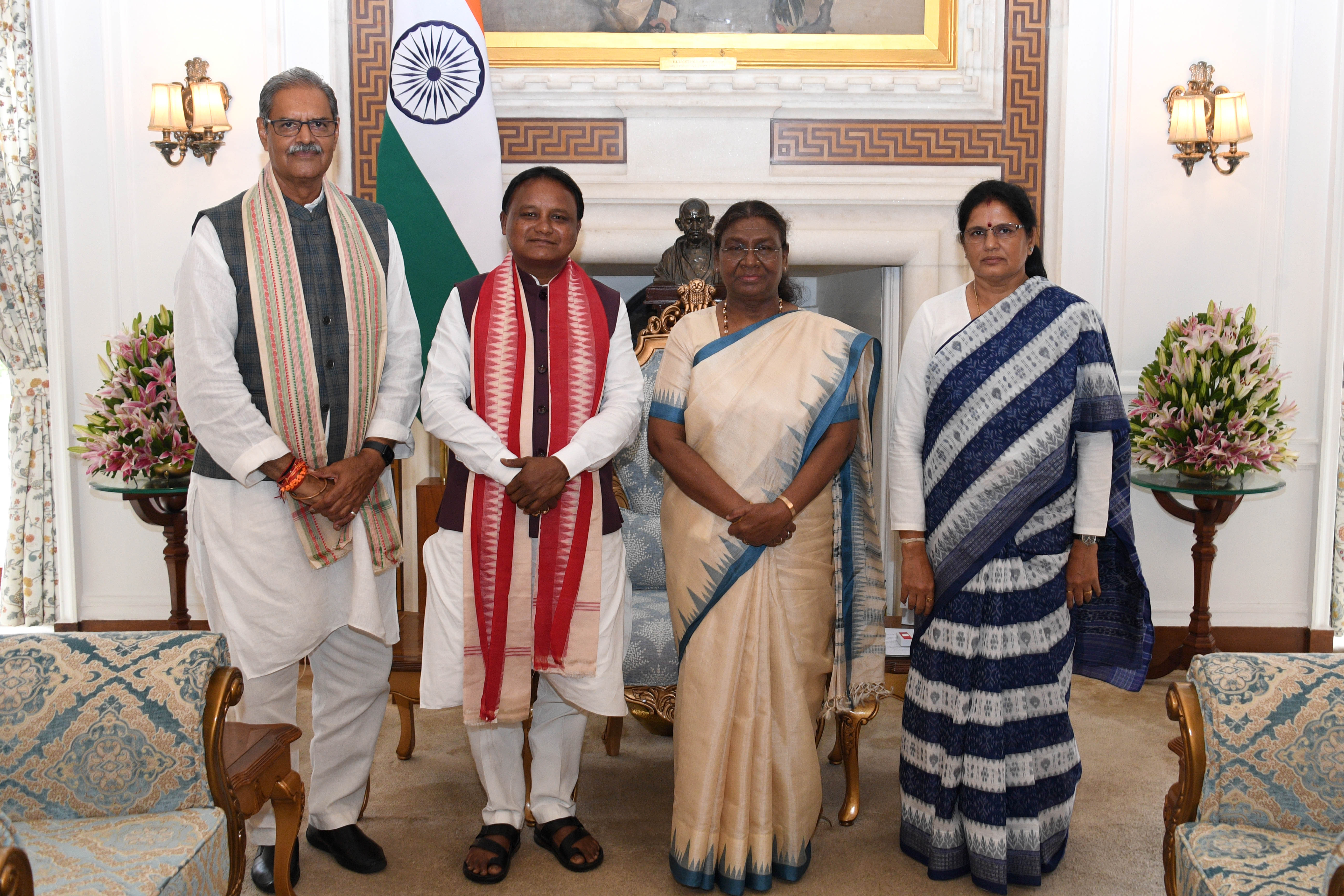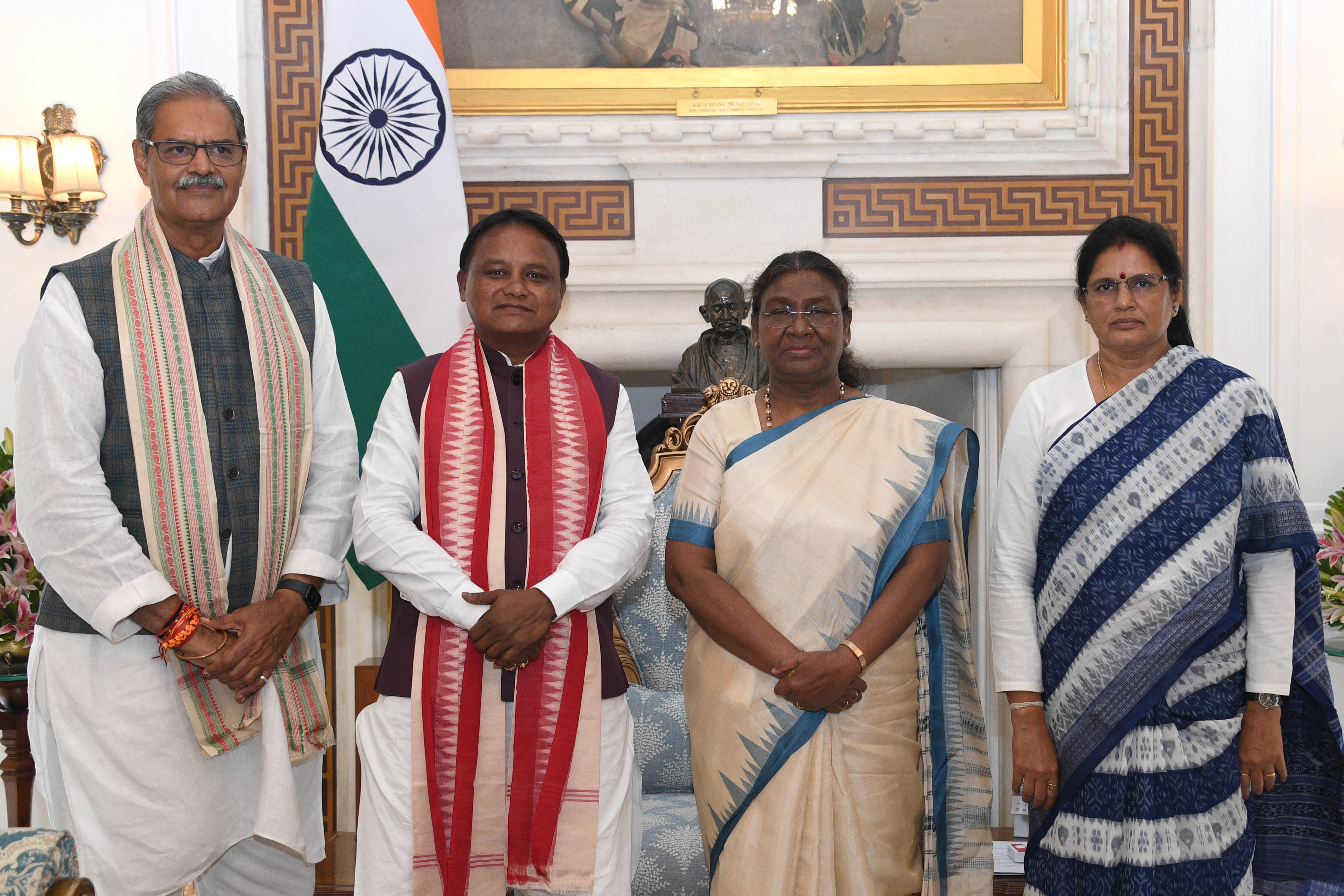 | Caption: | The Chief Minister of Odisha, Shri Mohan Charan Majhi along with Deputy Chief Ministers, Shri Kanak Vardhan Singh Deo and Smt Pravati Parida called on the President of India Smt. Droupadi Murmu at Rashtrapati Bhavan on June 27, 2024. |