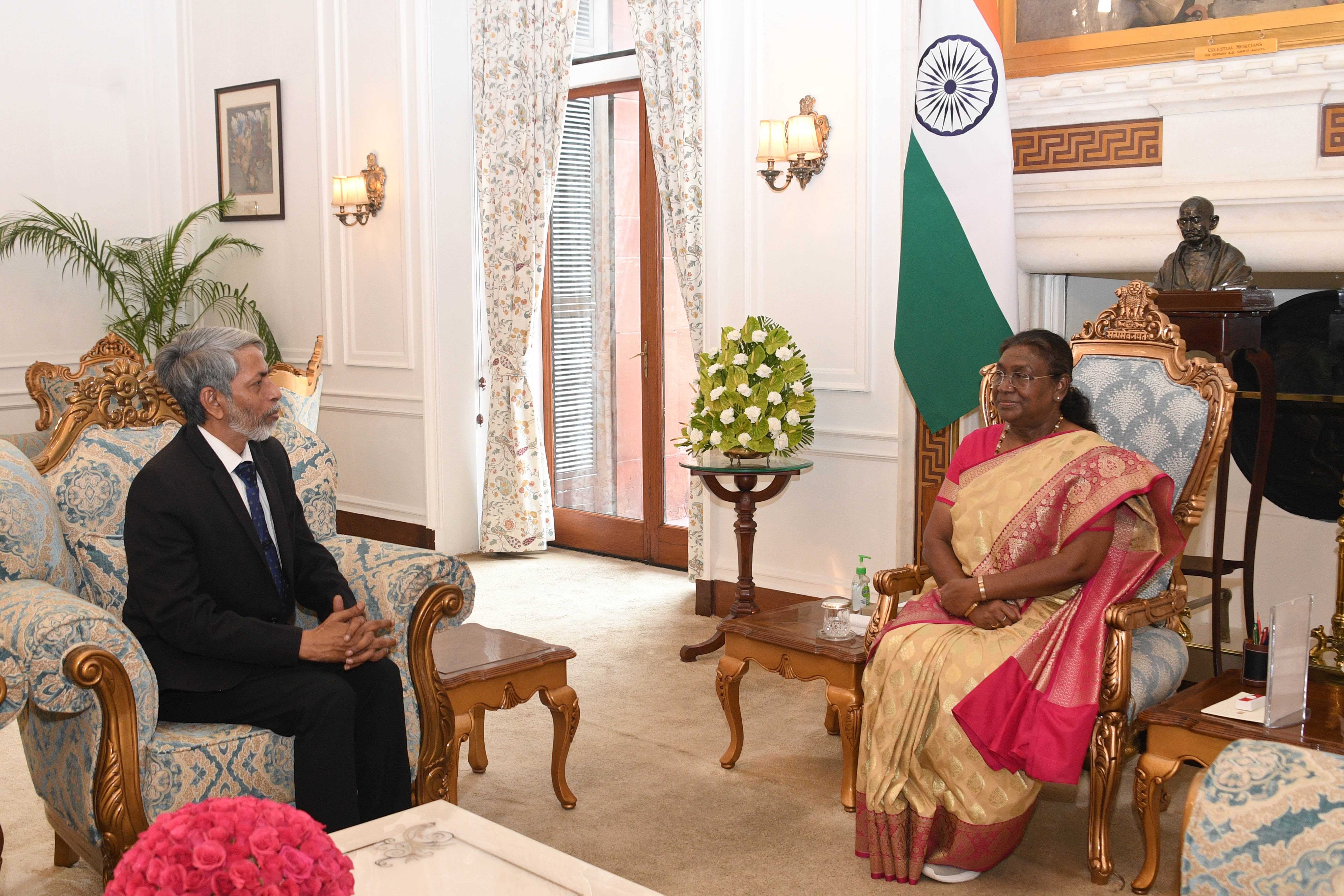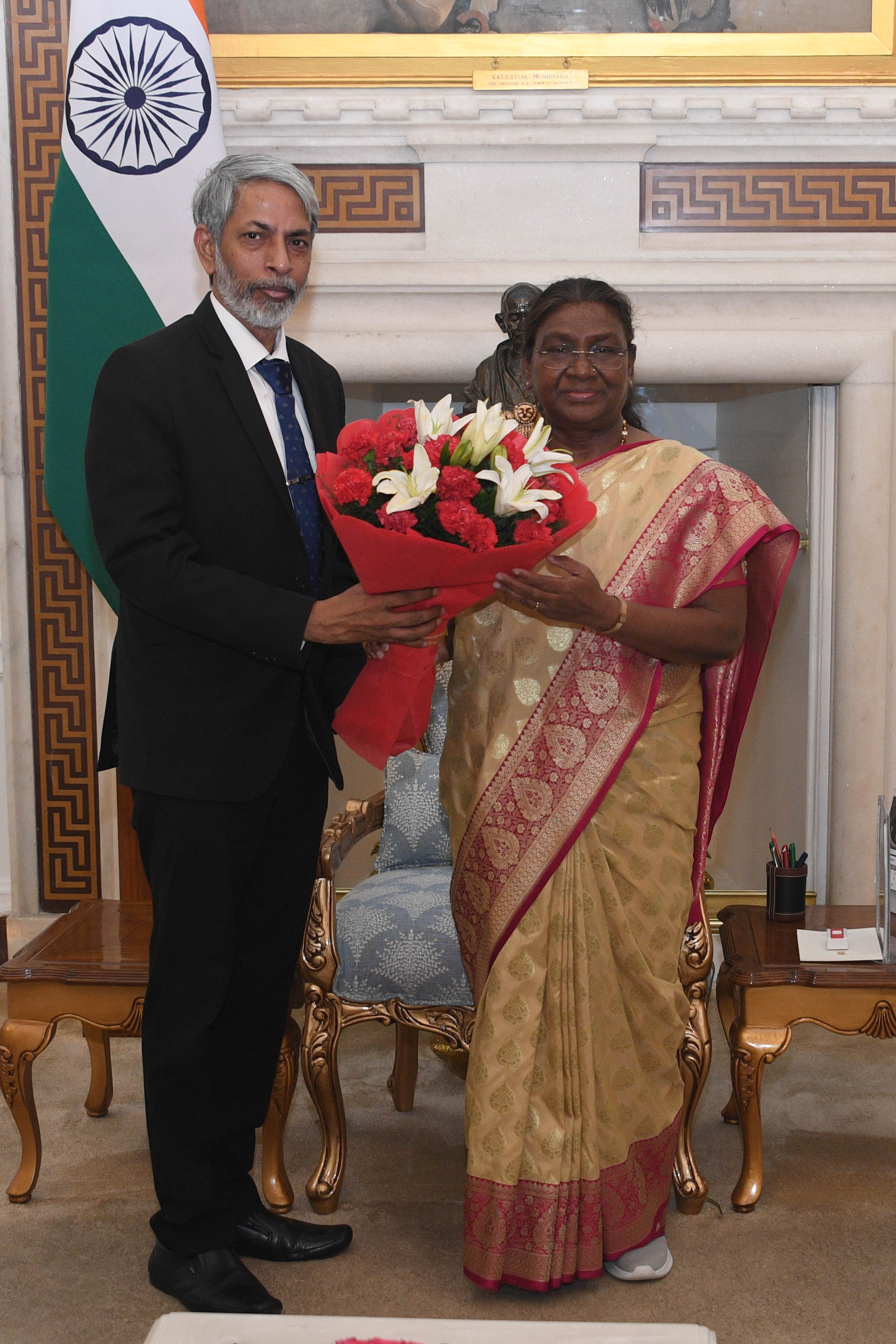 | Caption: | Sri Amarendu Prakash, Chairman, Steel Authority of India Limited(SAIL) meeting with the President of India Smt. Droupadi Murmu at Rashtrapati Bhavan on July 3, 2024. |