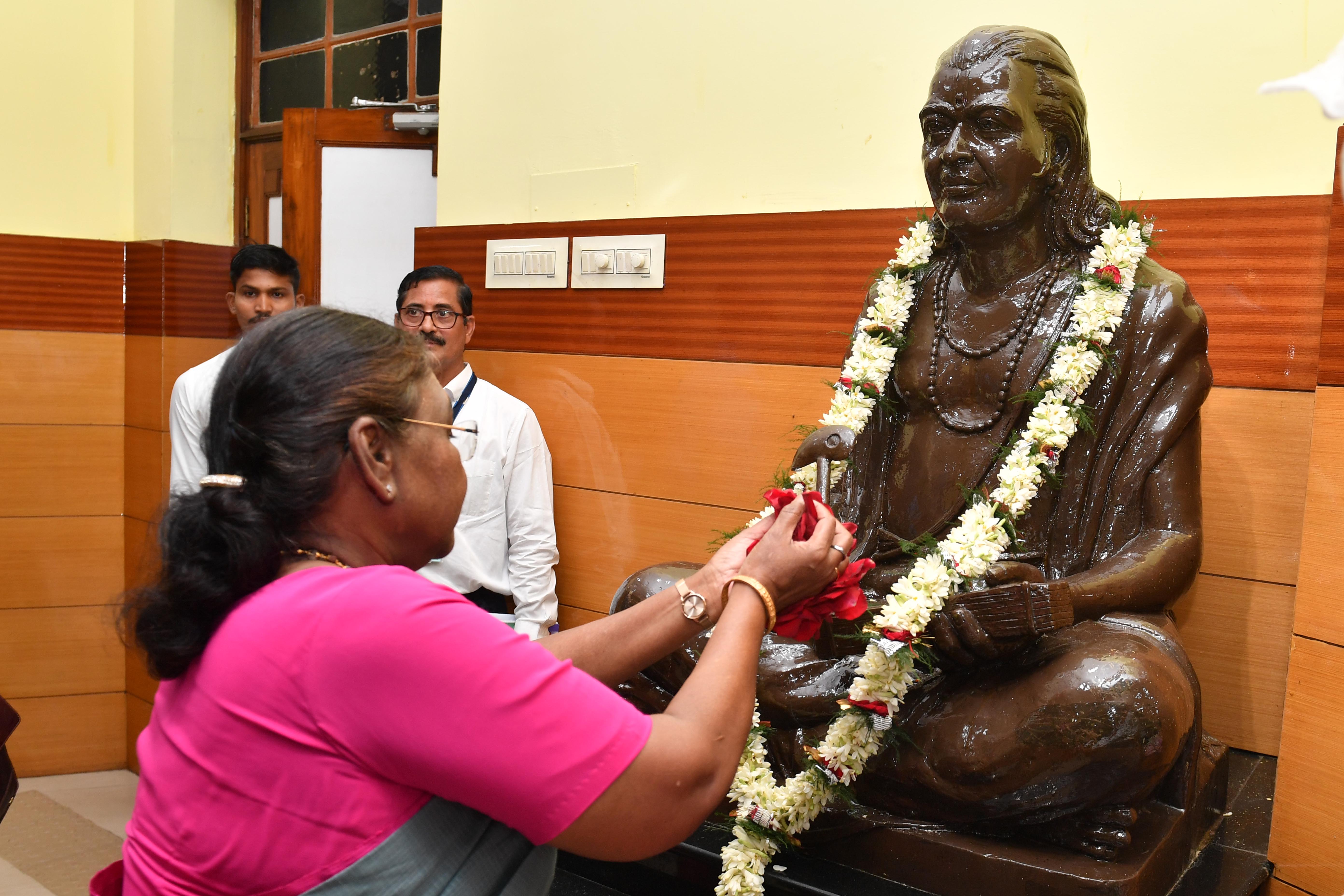| Caption: | The President of India, Smt Droupadi Murmu Garlanding the Statue of Jaydev Gopabandhu Das at Jayadev Bhavan at Bhubaneswar, Odisha on July 6, 2024. |