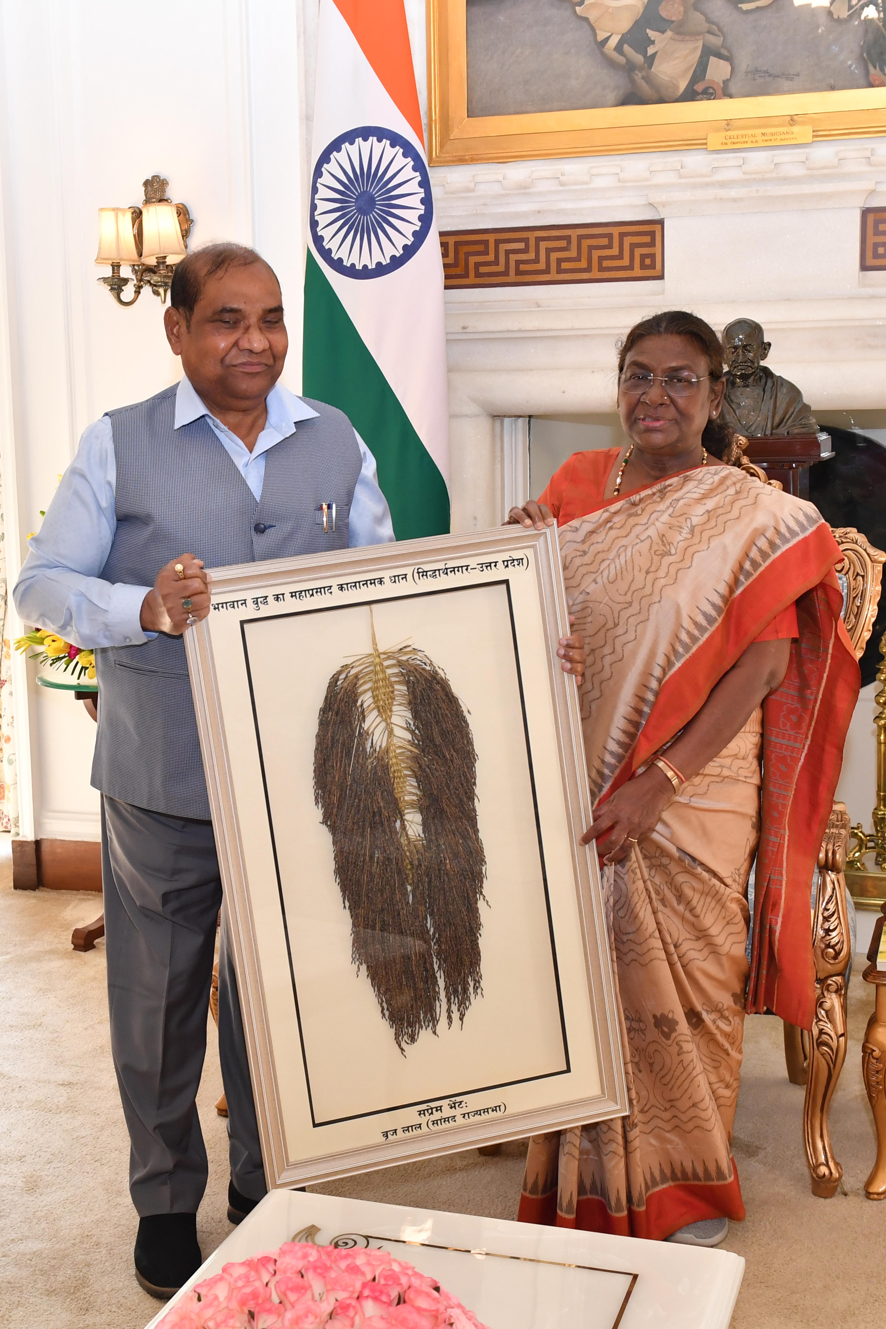 | Caption: | Shri Brij Lal, Member of Parliament (Rajya Sabha) along with wife Smt. Saroj Prasad meeting with the President of India Smt. Droupadi Murmu at Rashtrapati Bhavan on August 22, 2024. |