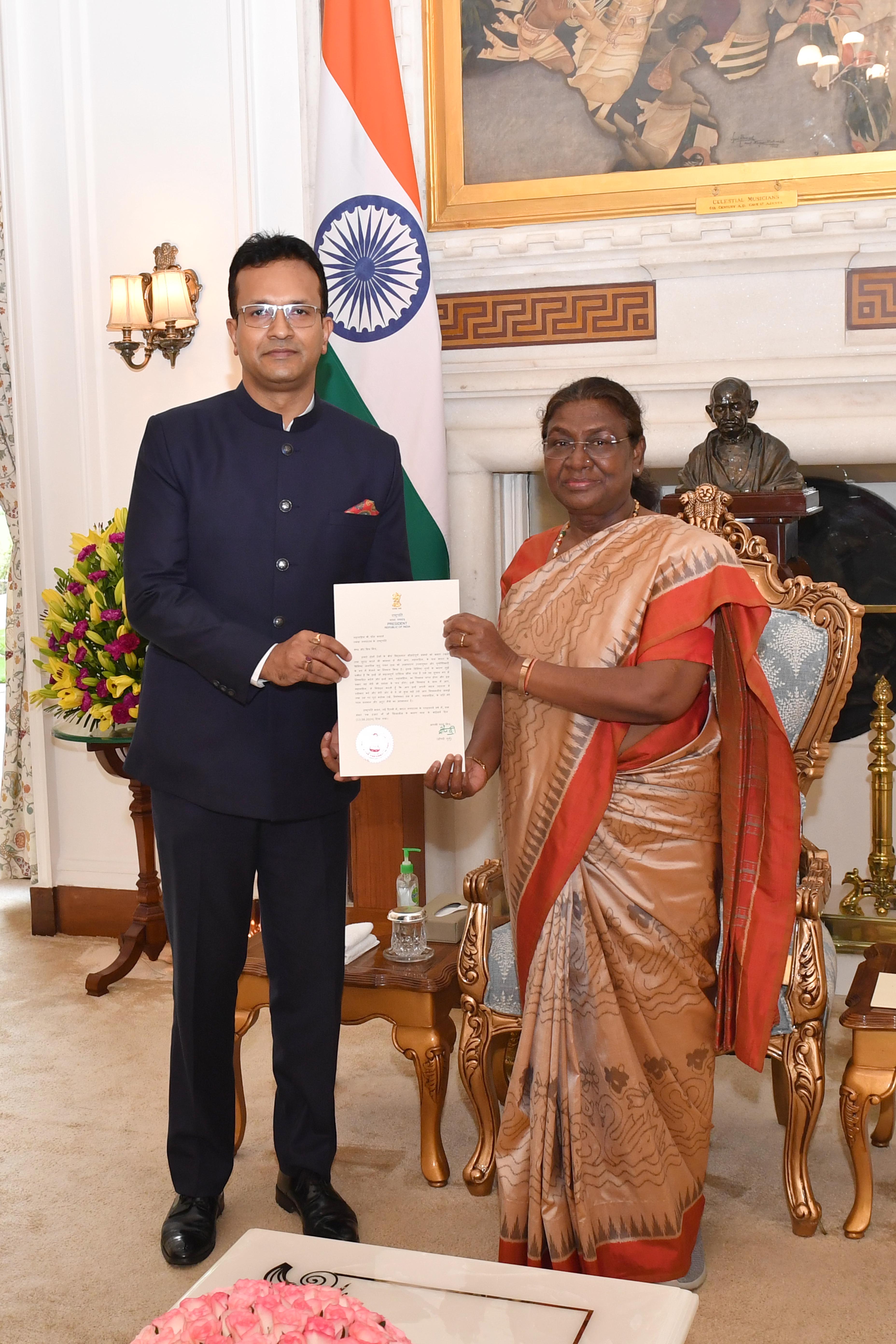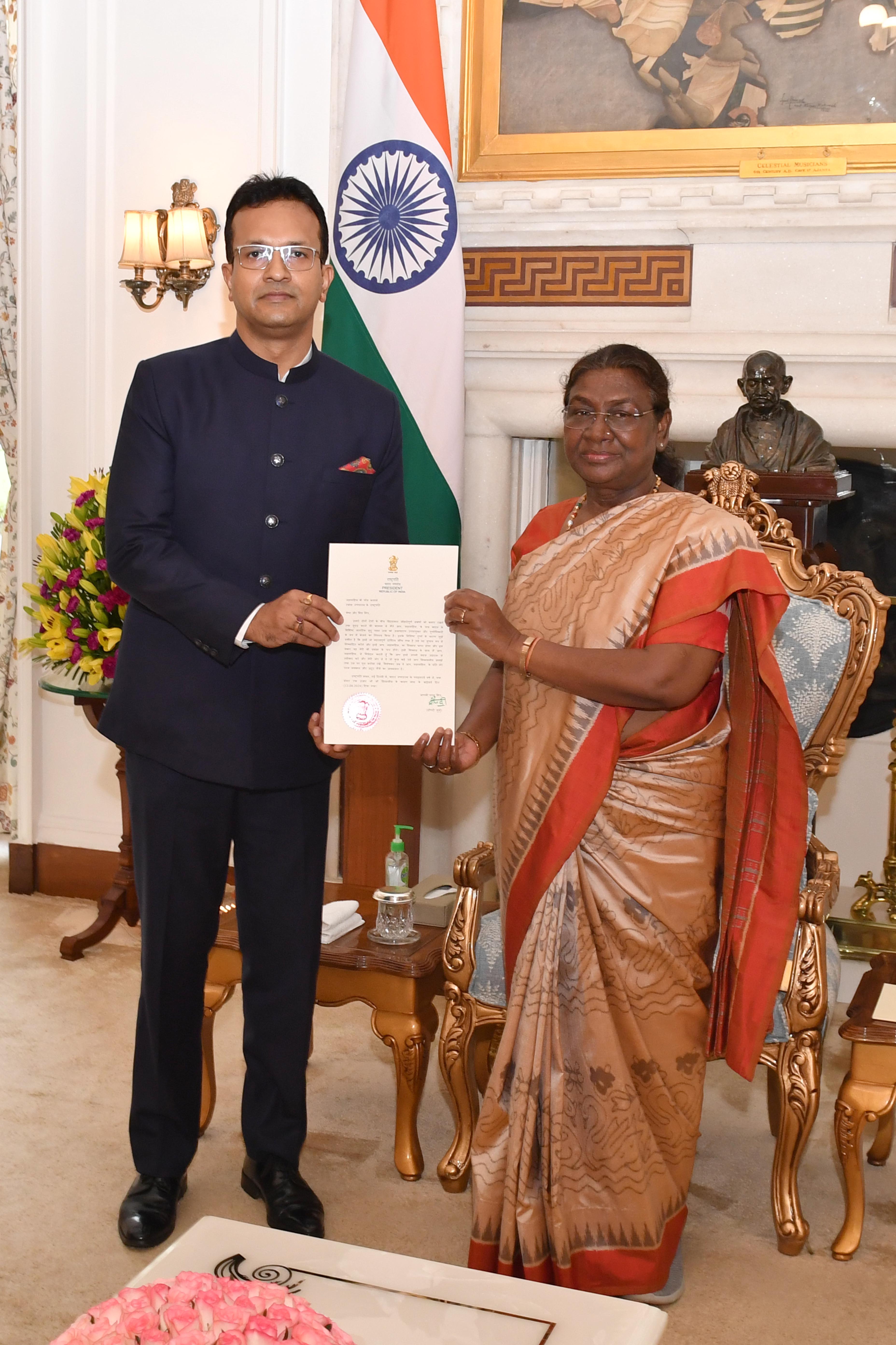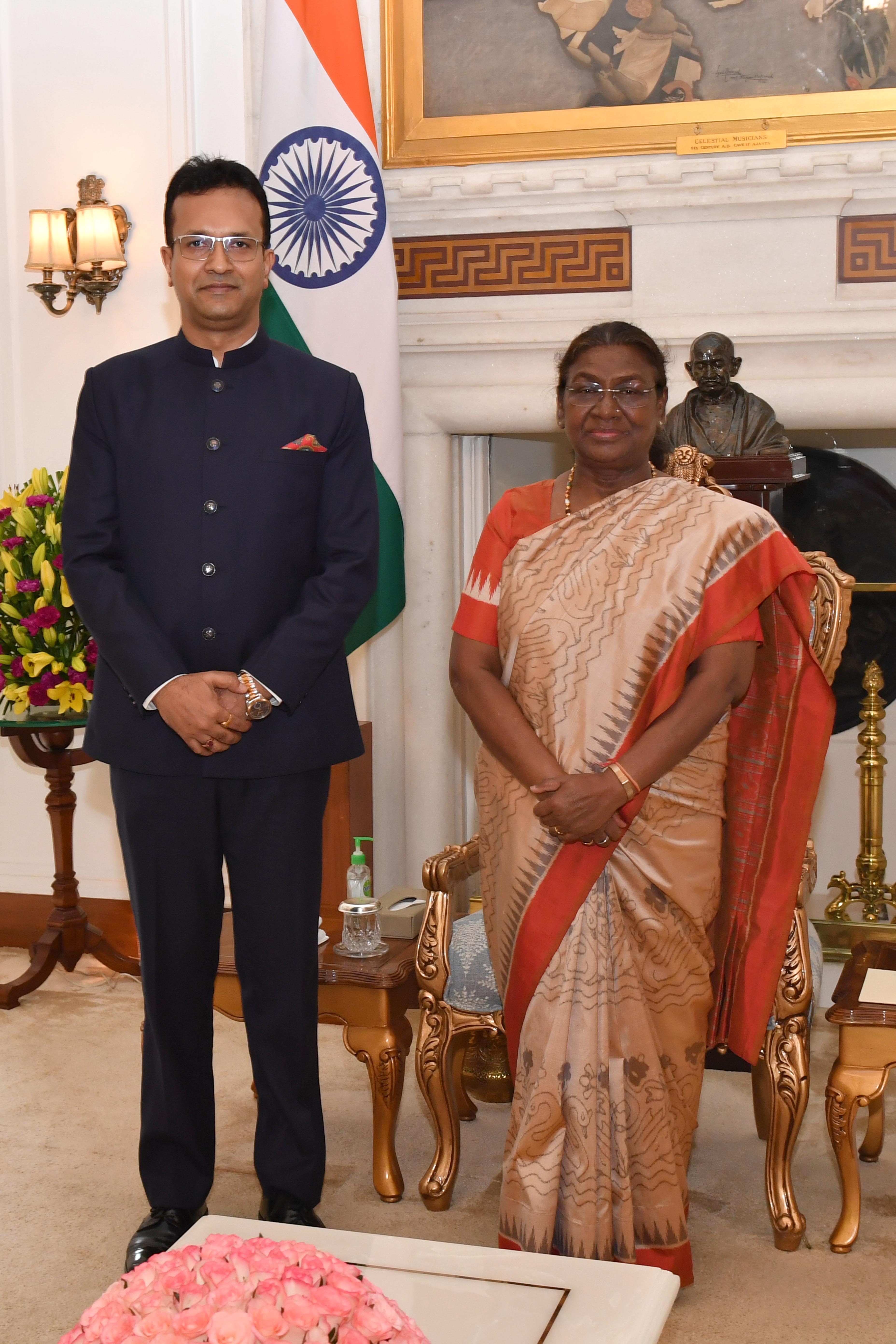 | Caption: | Shri Mridu Pawan Das, High Commissioner of India to the Republic of Rawanda meeting with the President of India Smt. Droupadi Murmu at Rashtrapati Bhavan on August 22, 2024. |
