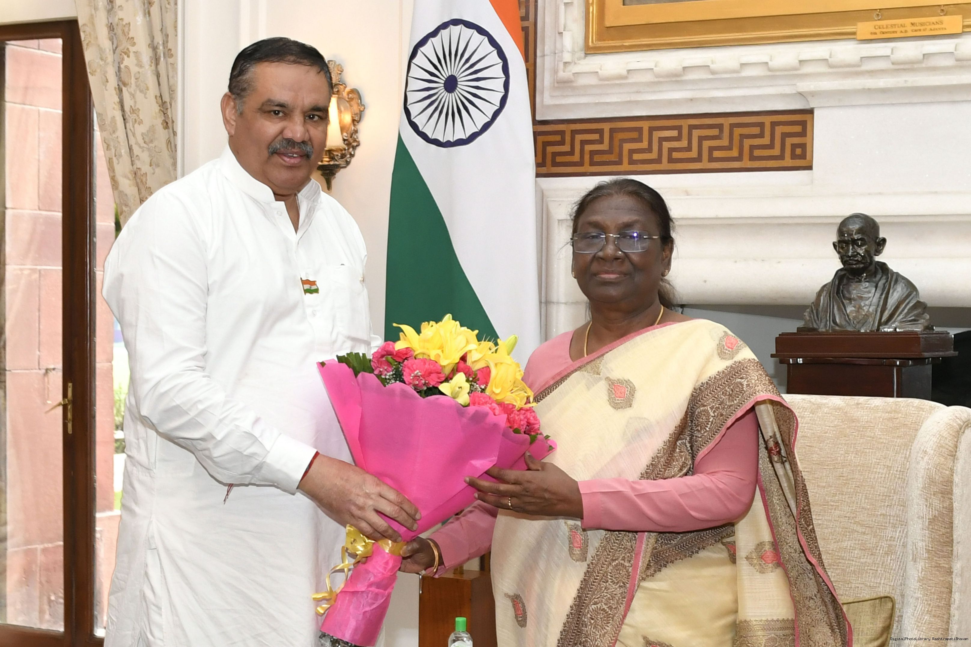 | Caption: | Shri Vijay Sampla, Chairman, National Commission for Scheduled Castes meeting with the President of India, Smt. Droupadi Murmu, at Rashtrapati Bhavan on Aug 22, 2022. |