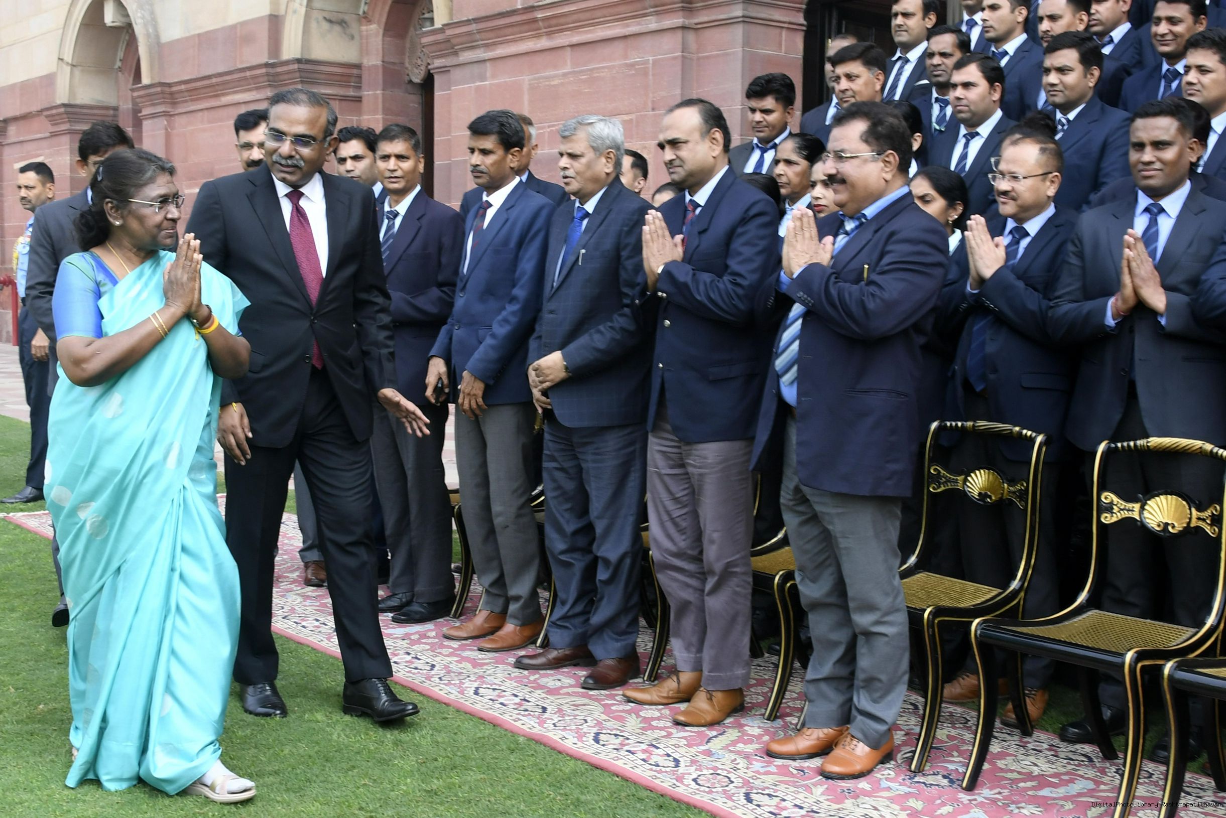 | Caption: | The President of India Smt. Droupadi Murmu posing a Group photograph with the Delhi Police personnel attached with the Rashtrapati Bhavan on the occasion of Raising Day of Delhi Police at Rashtrapati Bhavan on February 22, 2023. |