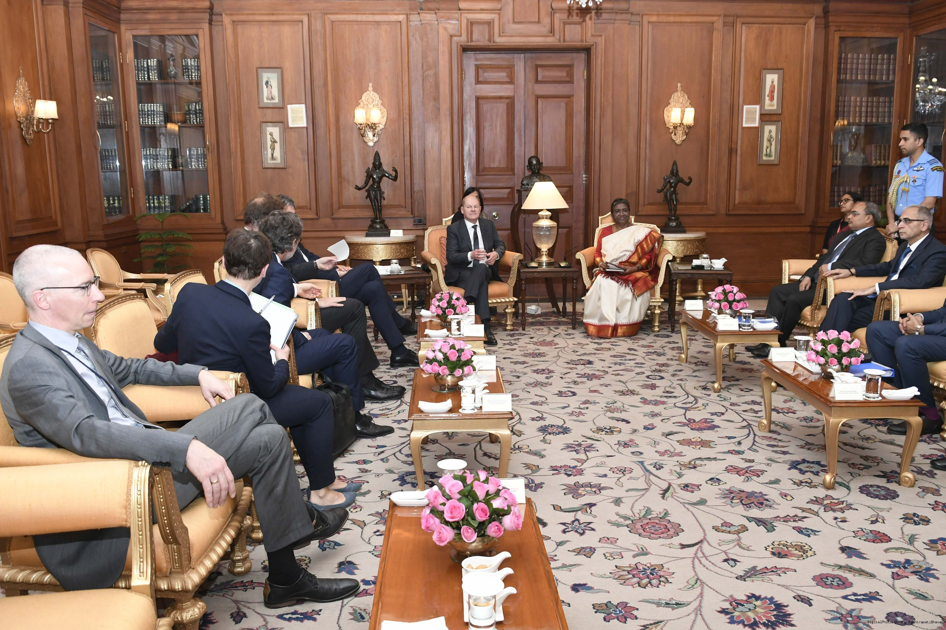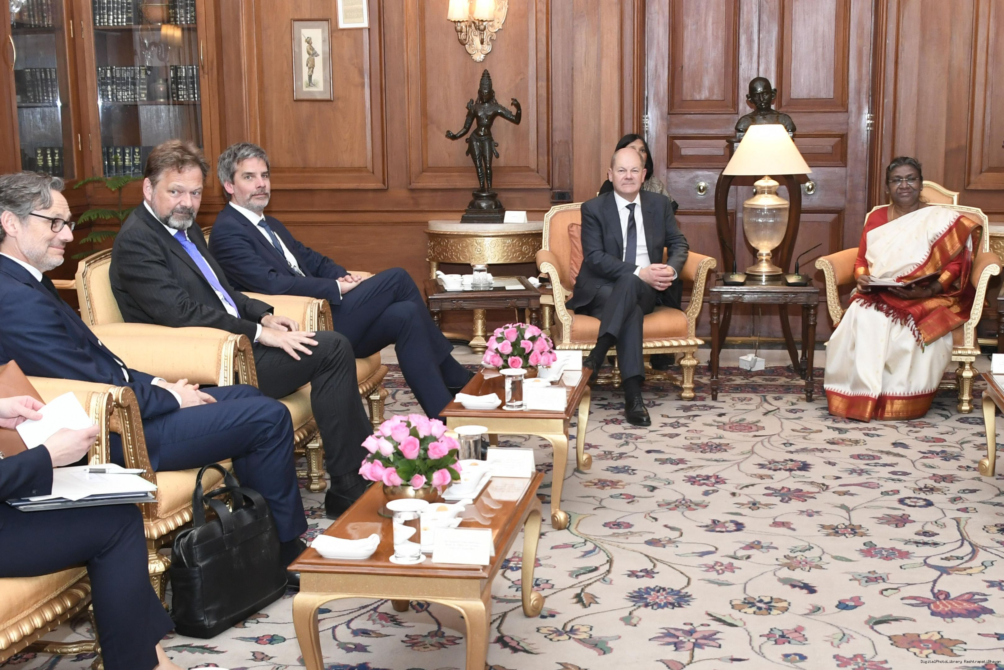 | Caption: | The Chancellor of the Federal Republic of Germany, H.E. Mr. Olaf Scholz called on the President of India, Smt. Droupadi Murmu, at Rashtrapati Bhavan on February 25, 2023. |