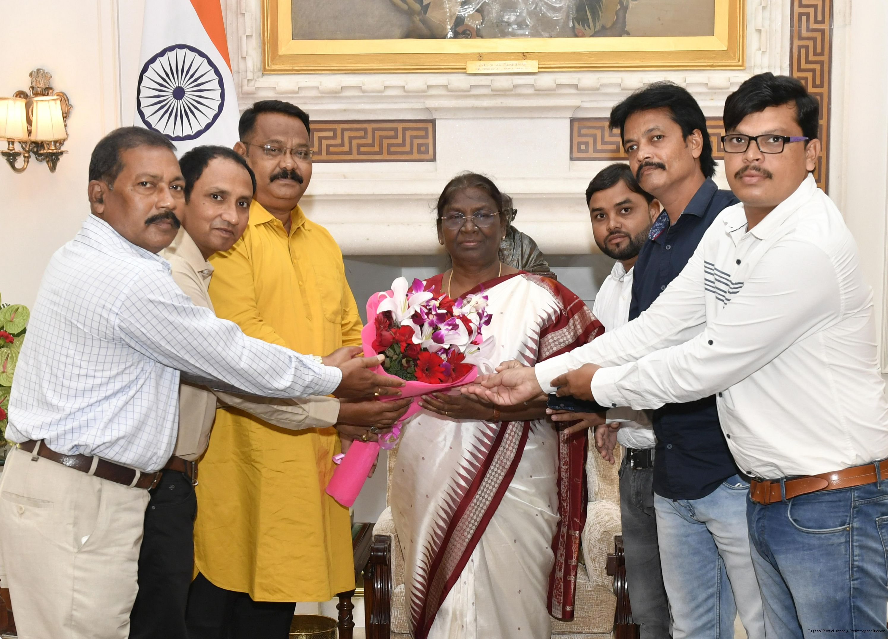 | Caption: | Shri Sujit Kumar Pattanaik, Shri Malay Kumar Das along with others from Rairangpur meeting with the President of India, Smt. Droupadi Murmu, at Rashtrapati Bhavan on Aug 27, 2022. |
