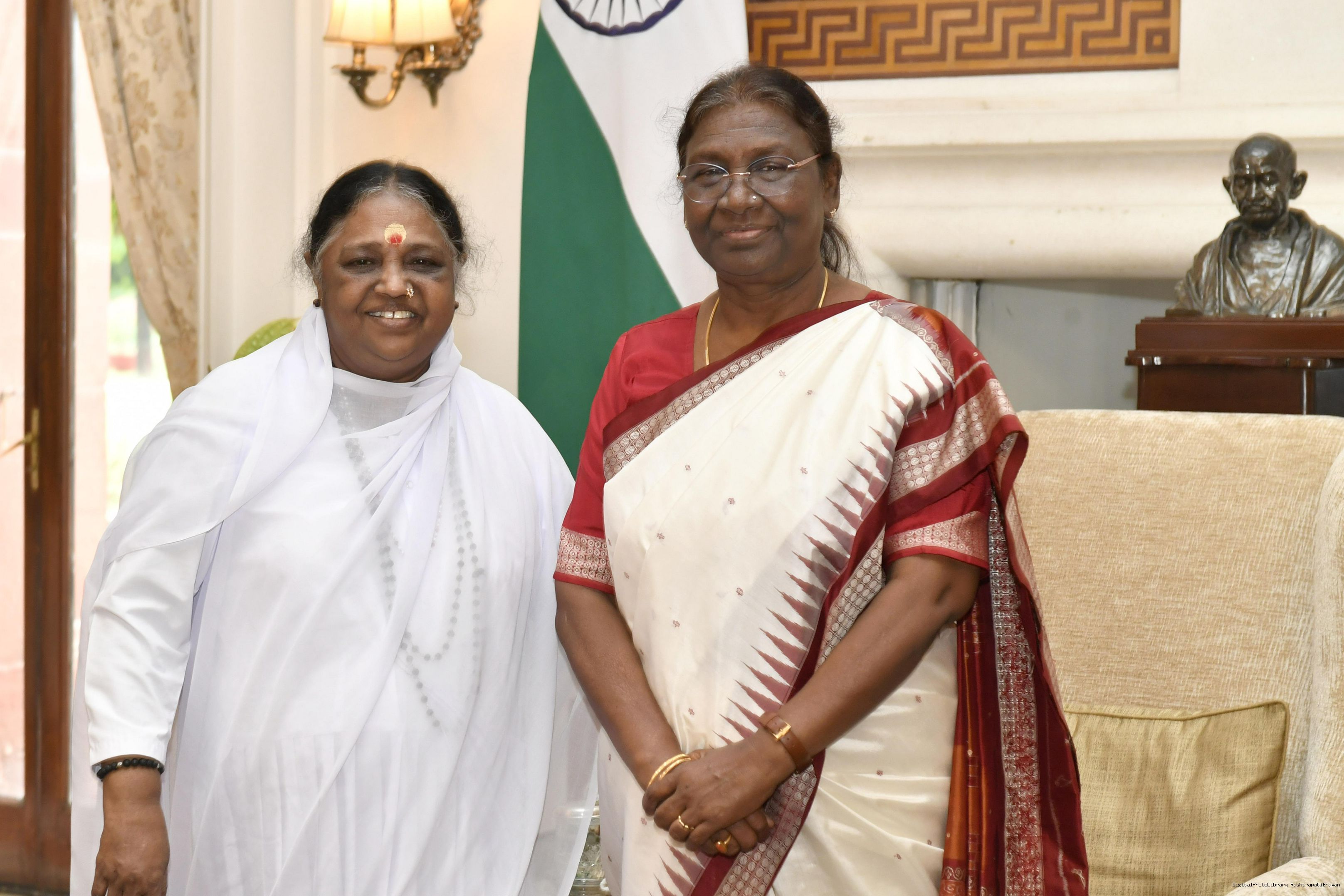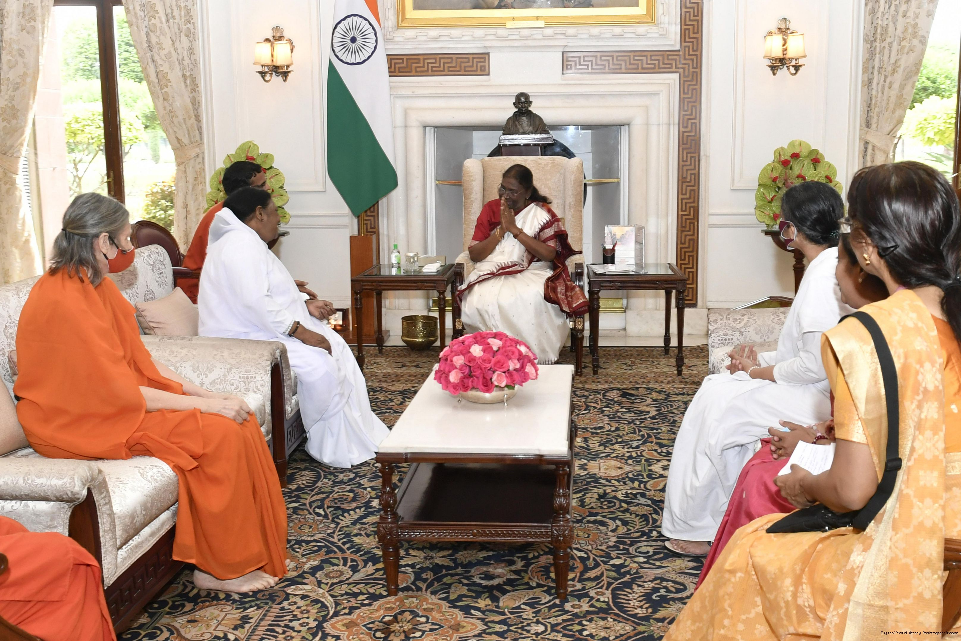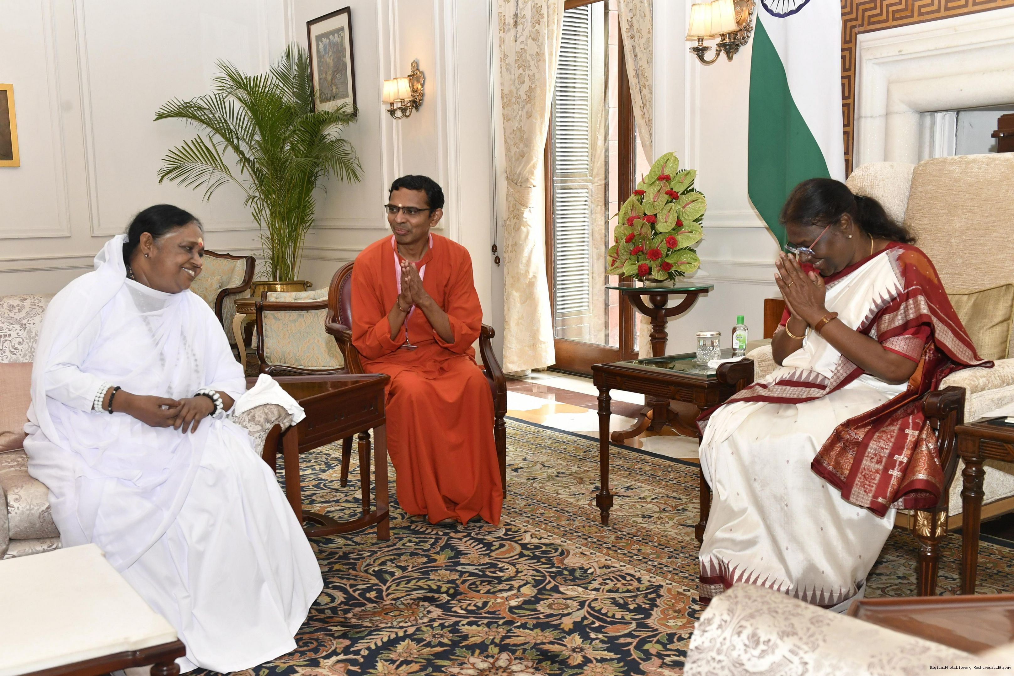 | Caption: | Sri Mata Amritanandamayi Devi (Amma) along with others meeting with the President of India, Smt. Droupadi Murmu, at Rashtrapati Bhavan on Aug 27, 2022. |
