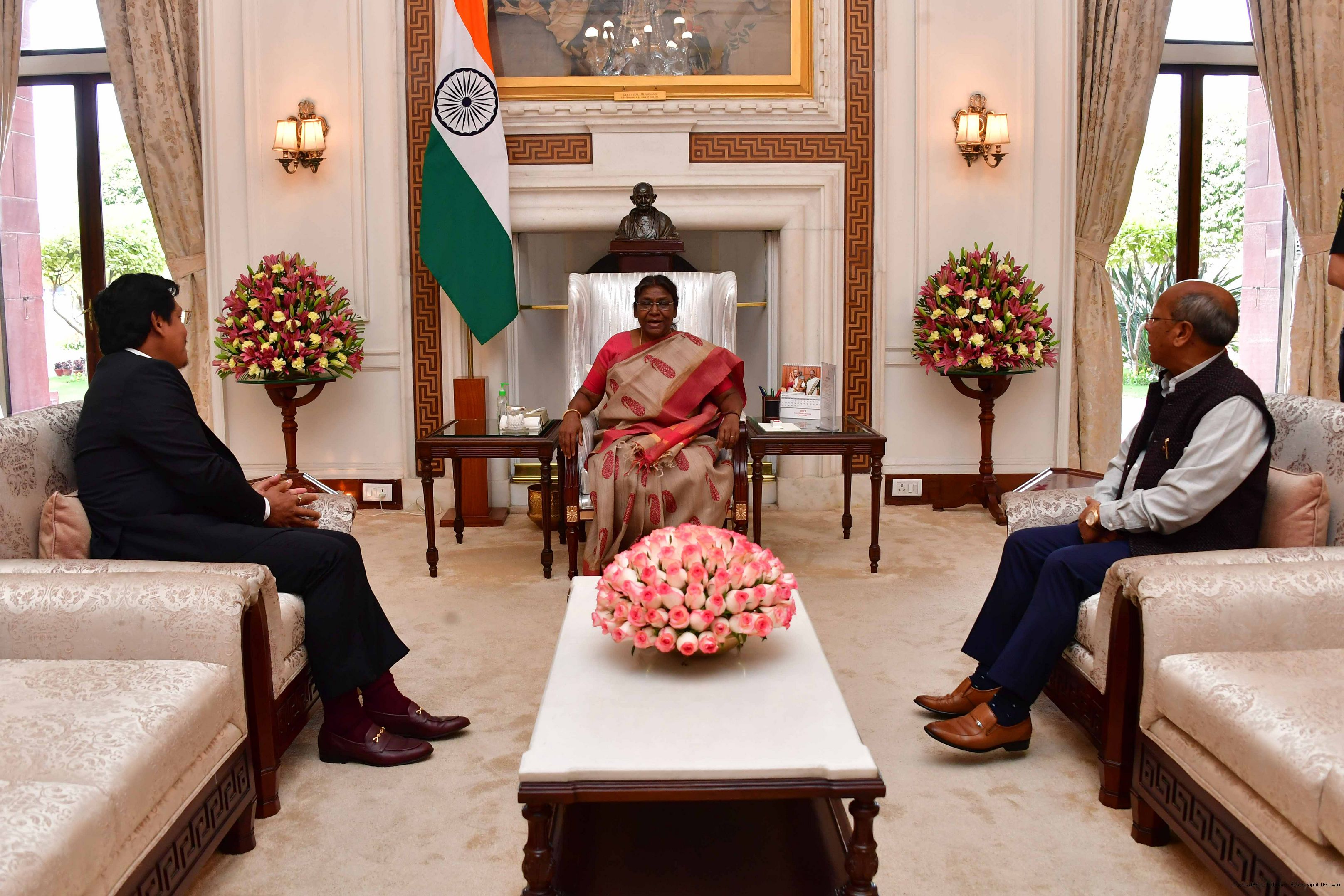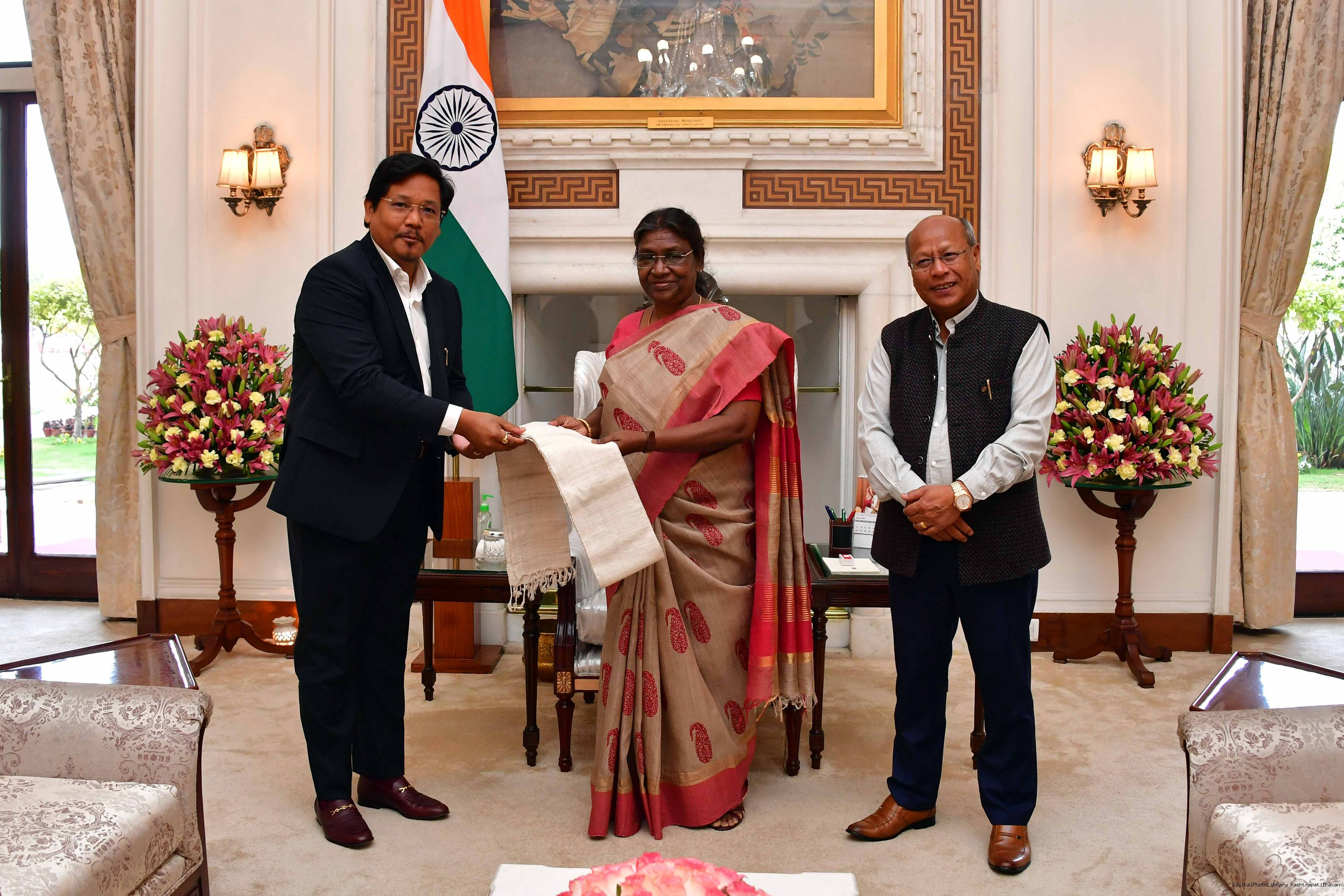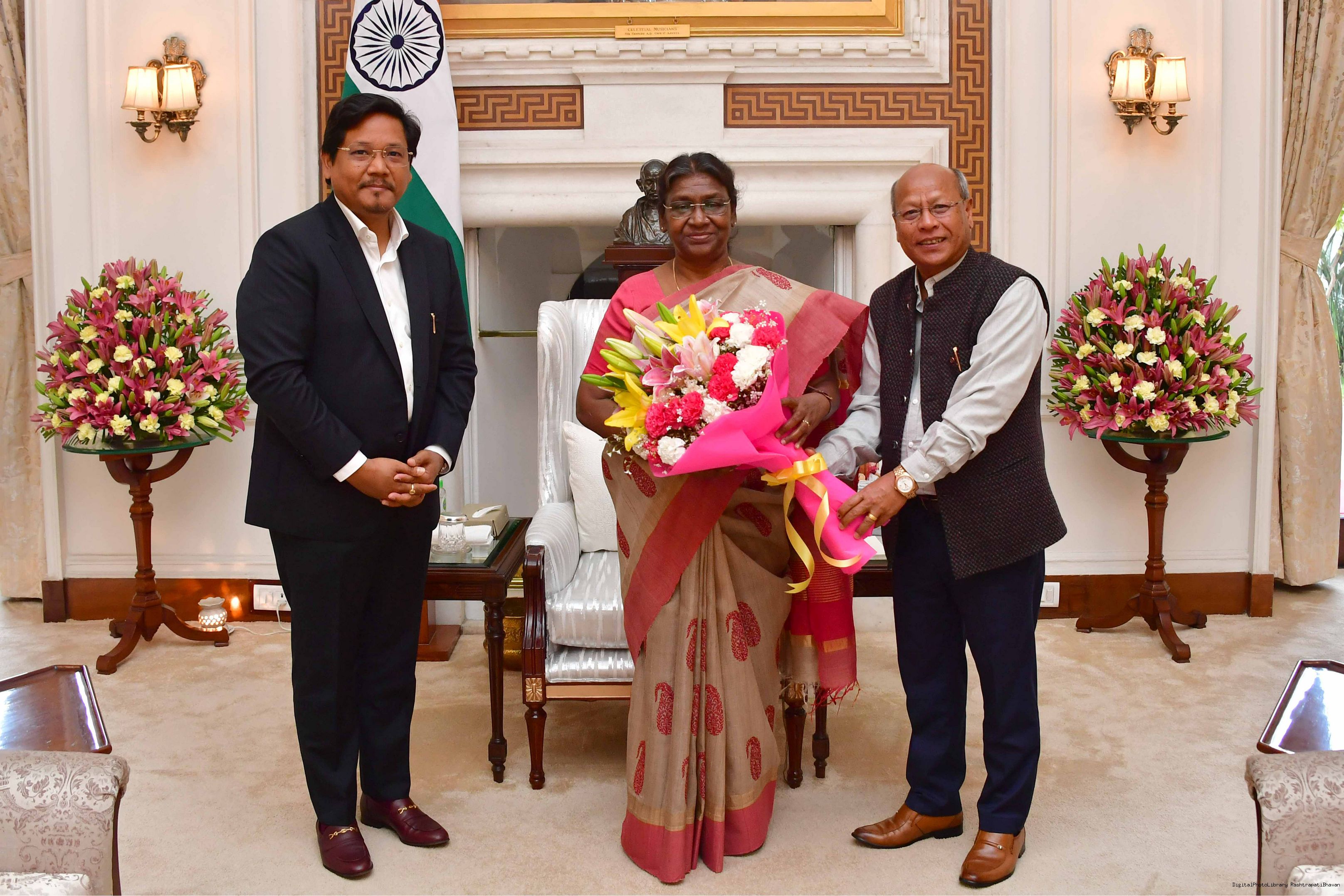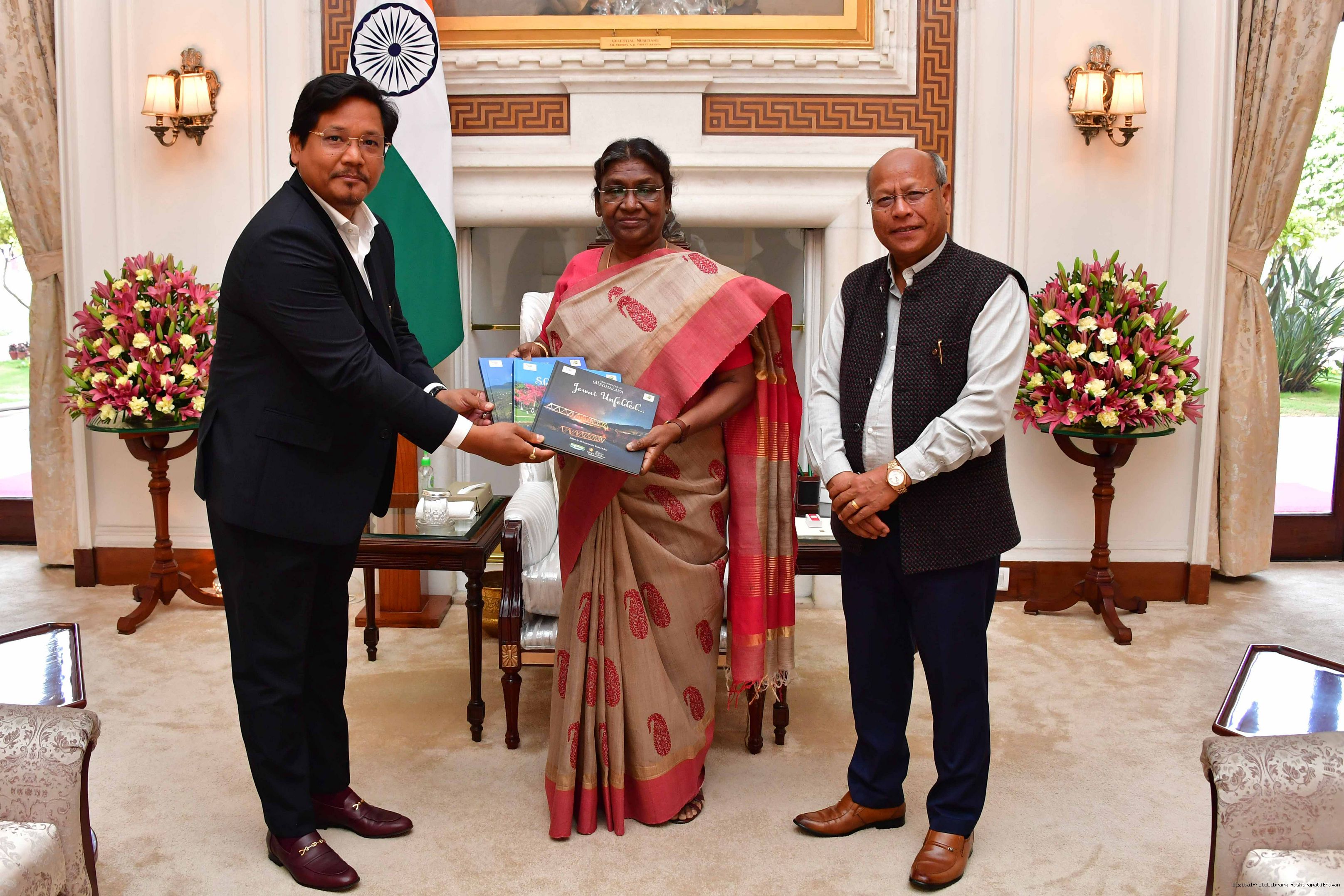 | Caption: | The Chief Minister of Meghalaya, Shri Conrad Kongkal Sangma and the Deputy Chief Minister, Shri Prestone Tynsong called on the President of India Smt. Droupadi Murmu at Rashtrapati Bhavan on March 11, 2023. |