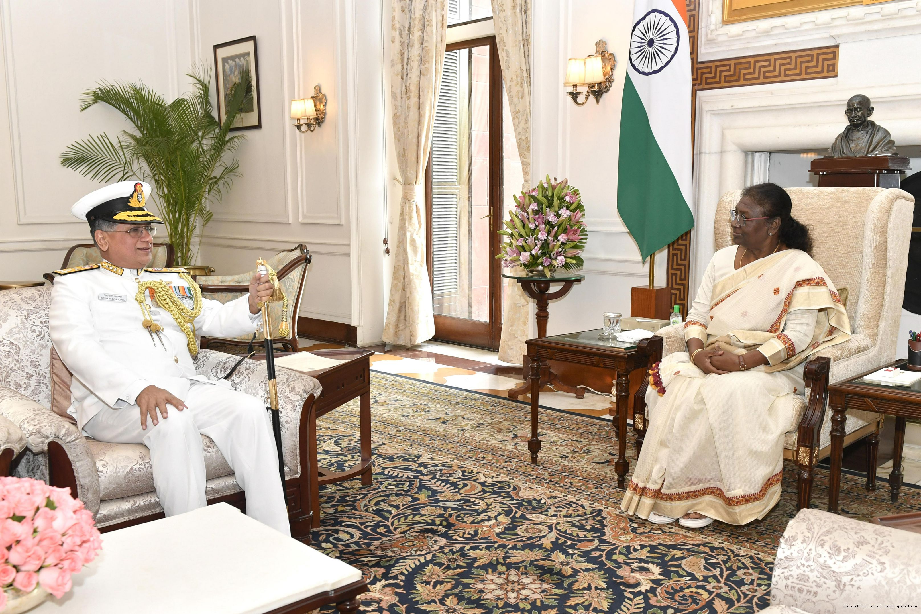 | Caption: | Vice Admiral Biswajit Dasgupata, AVSM, YSM, VSM, Flag Officer Commanding-in-Chief, Eastern Naval Command meeting with the President of India, Smt. Droupadi Murmu, at Rashtrapati Bhavan on Sep 08, 2022. |