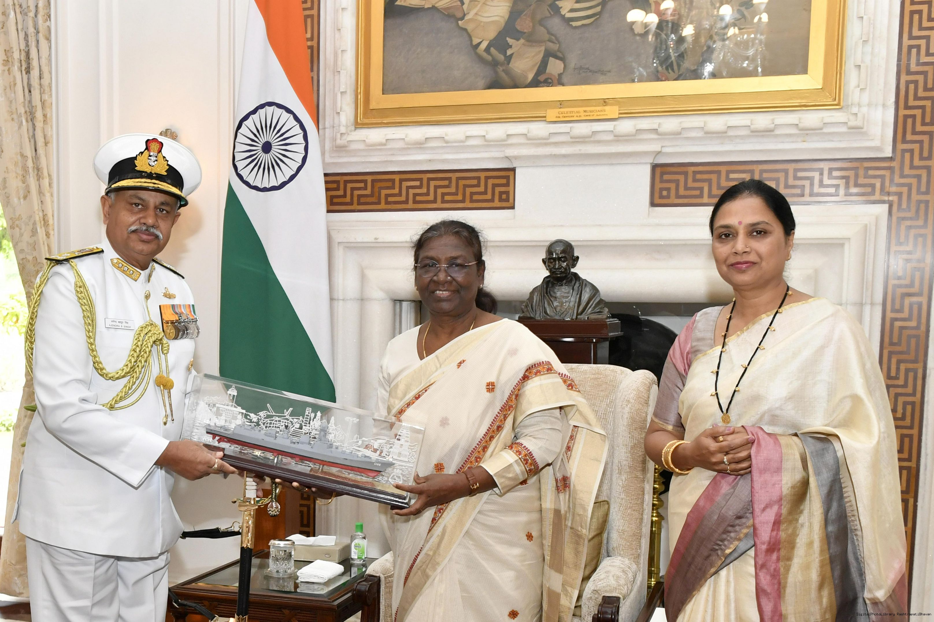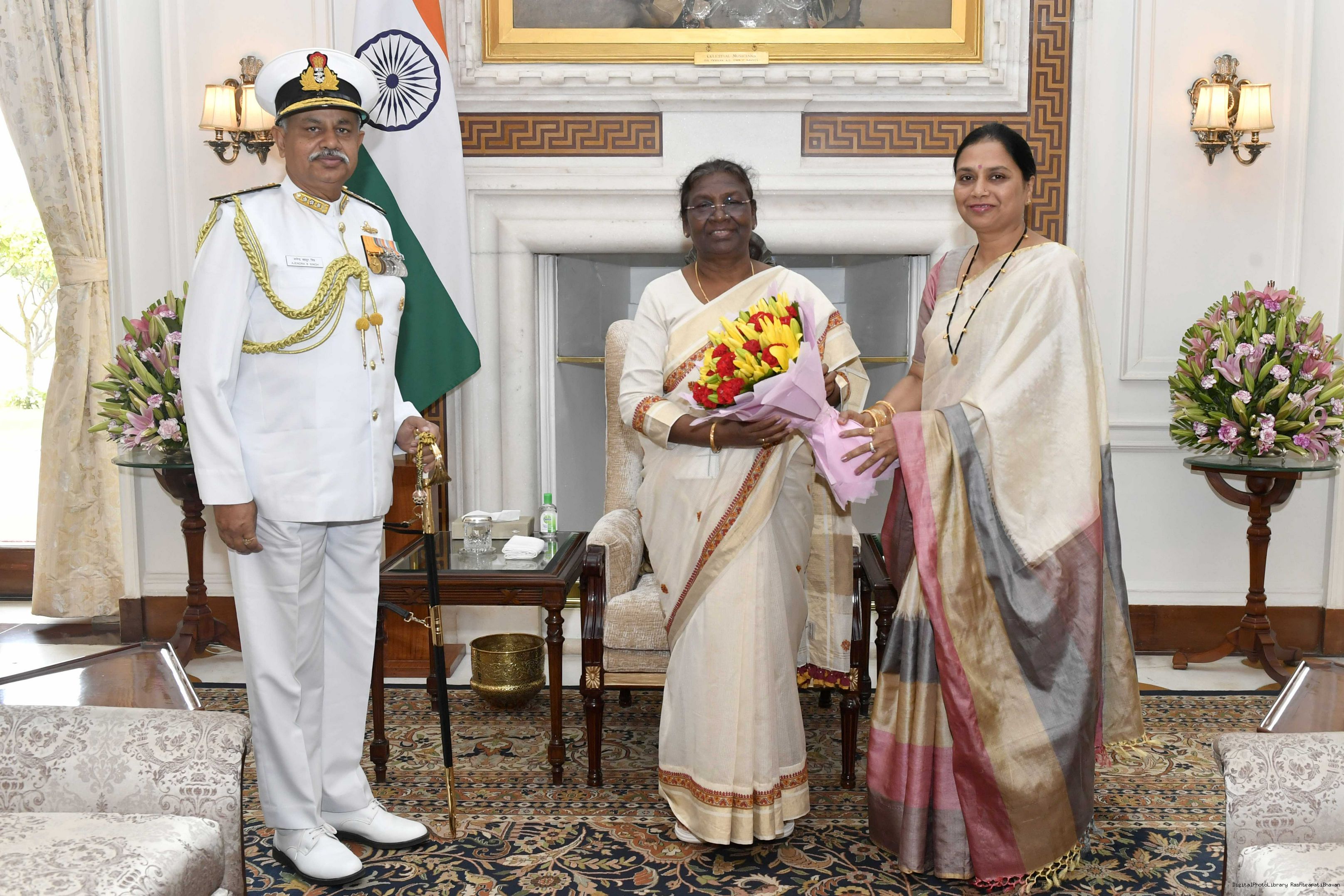 | Caption: | Vice Admiral Ajendra Bahadur Singh, PVSM, AVSM, VSM, ADC, Flag Officer Commanding-in-Chief, Western Naval Command along with his wife Smt. Charu Singh meeting with the President of India, Smt. Droupadi Murmu, at Rashtrapati Bhavan on Sep 08, 2022. |