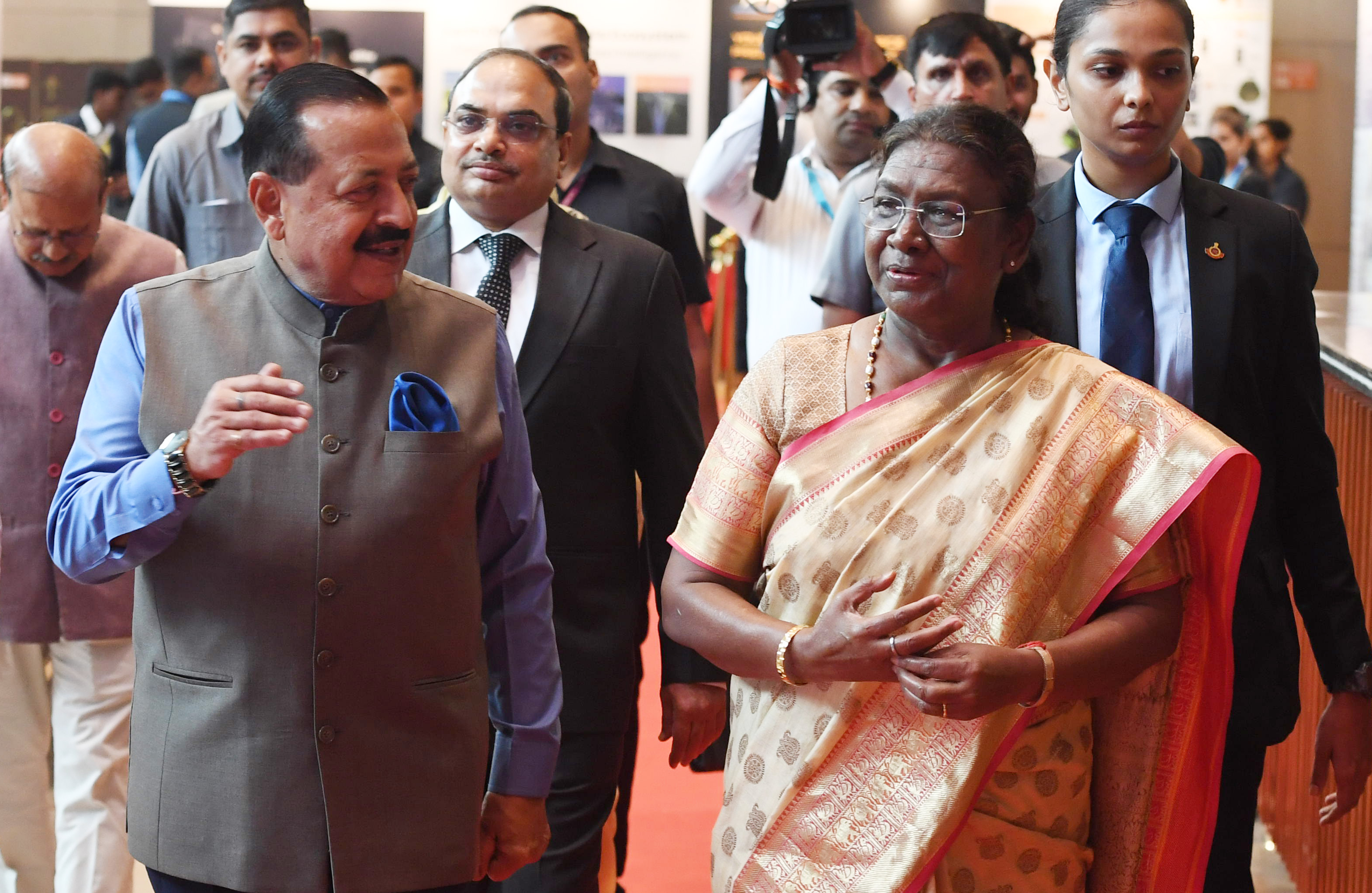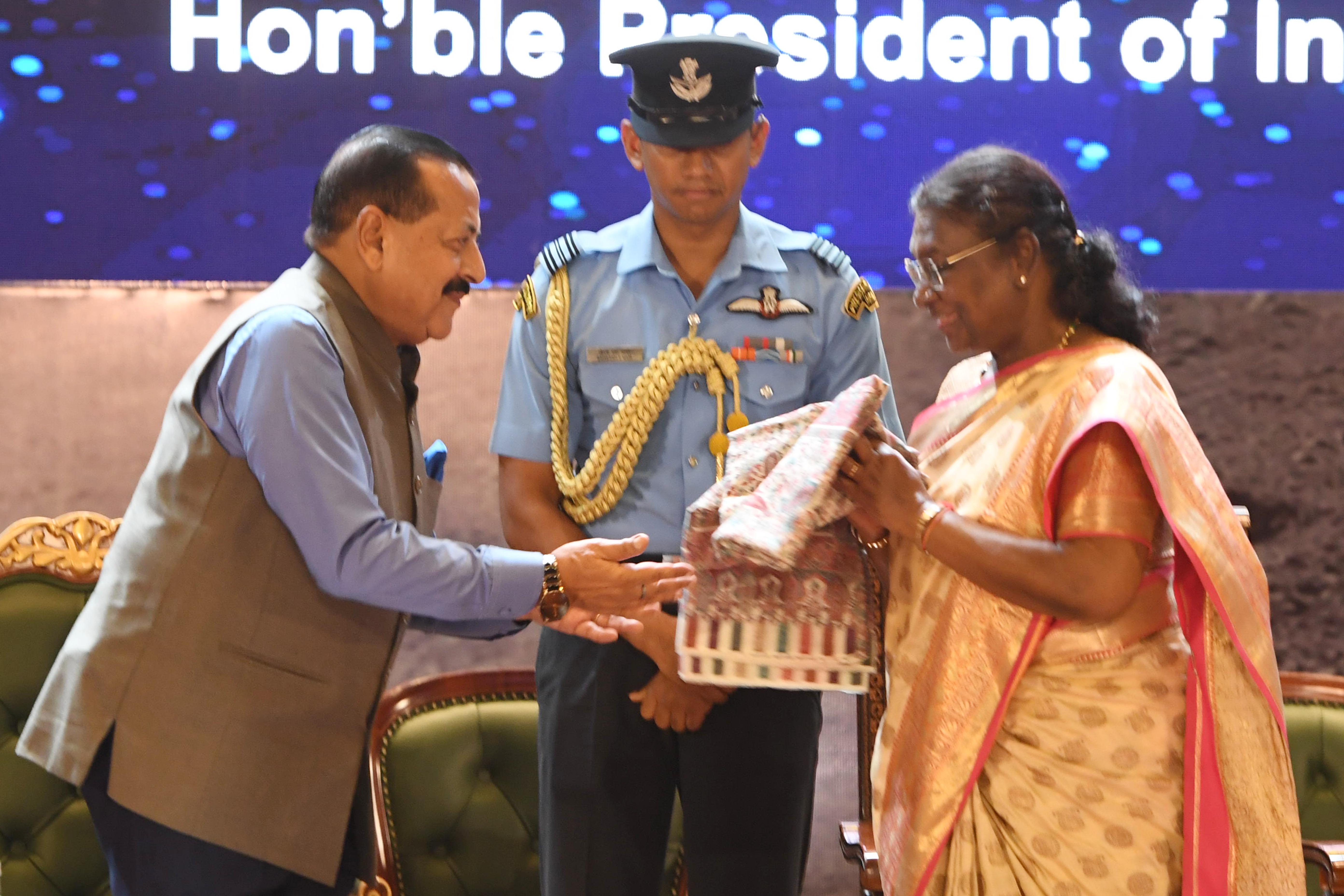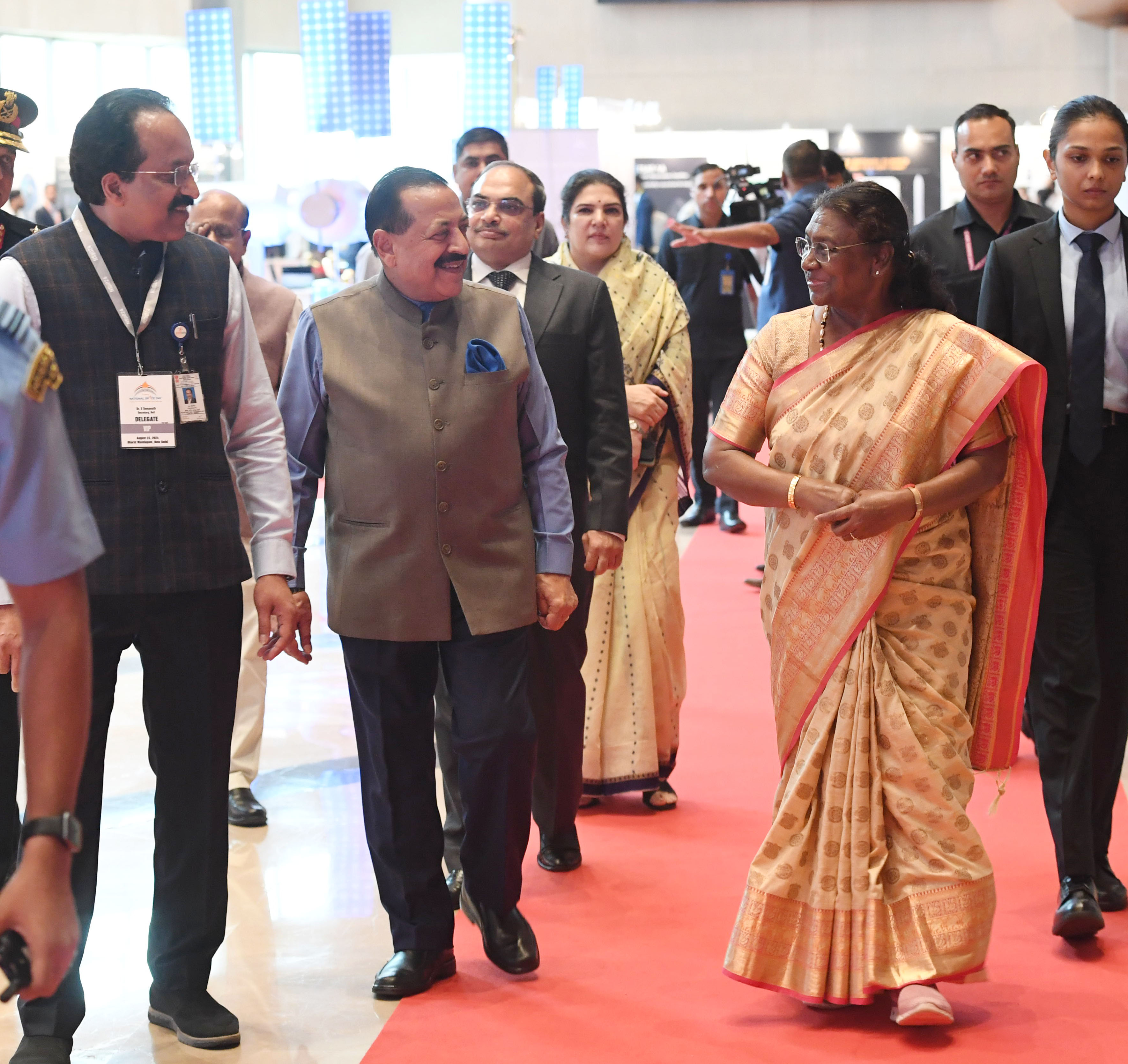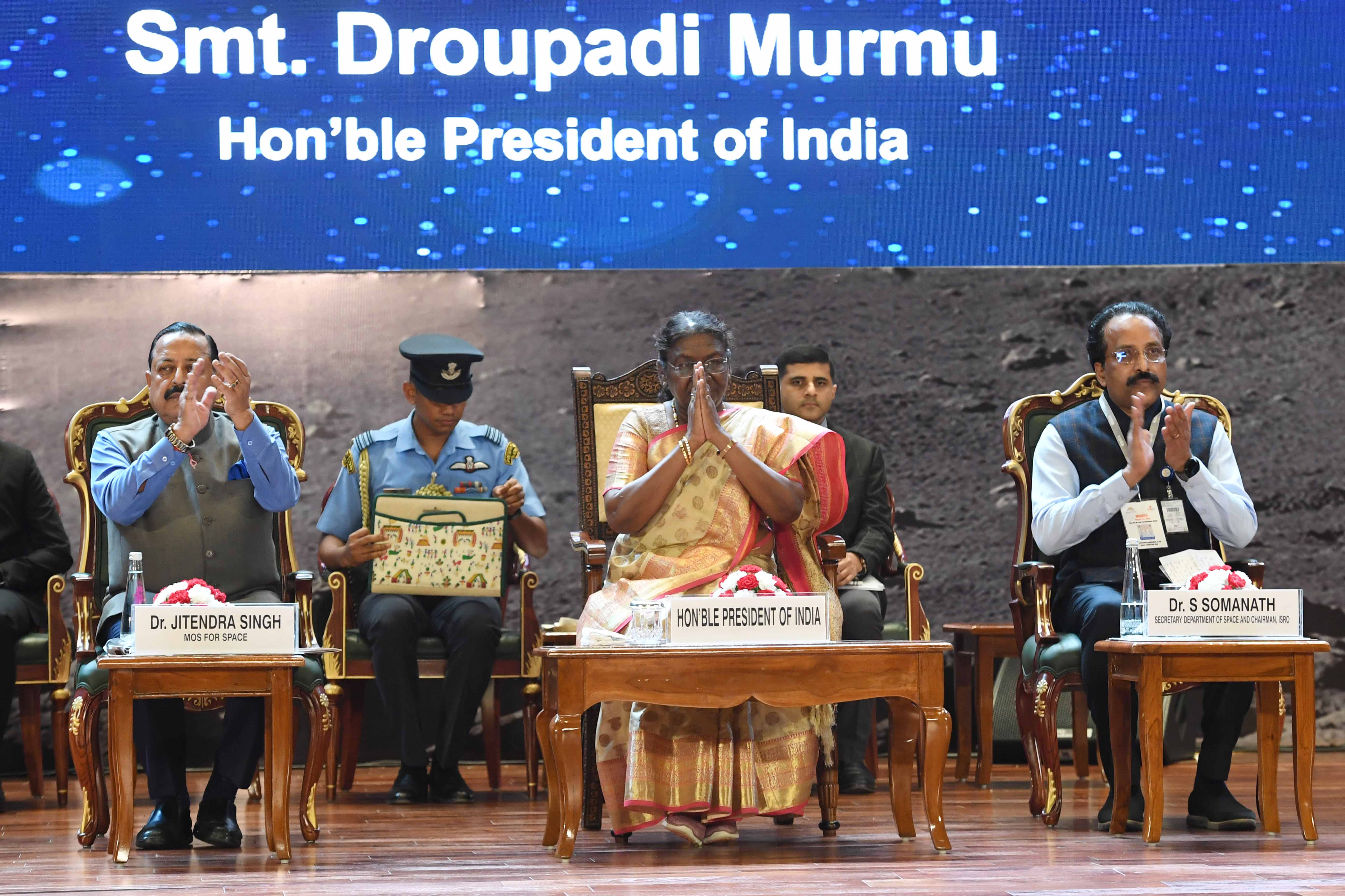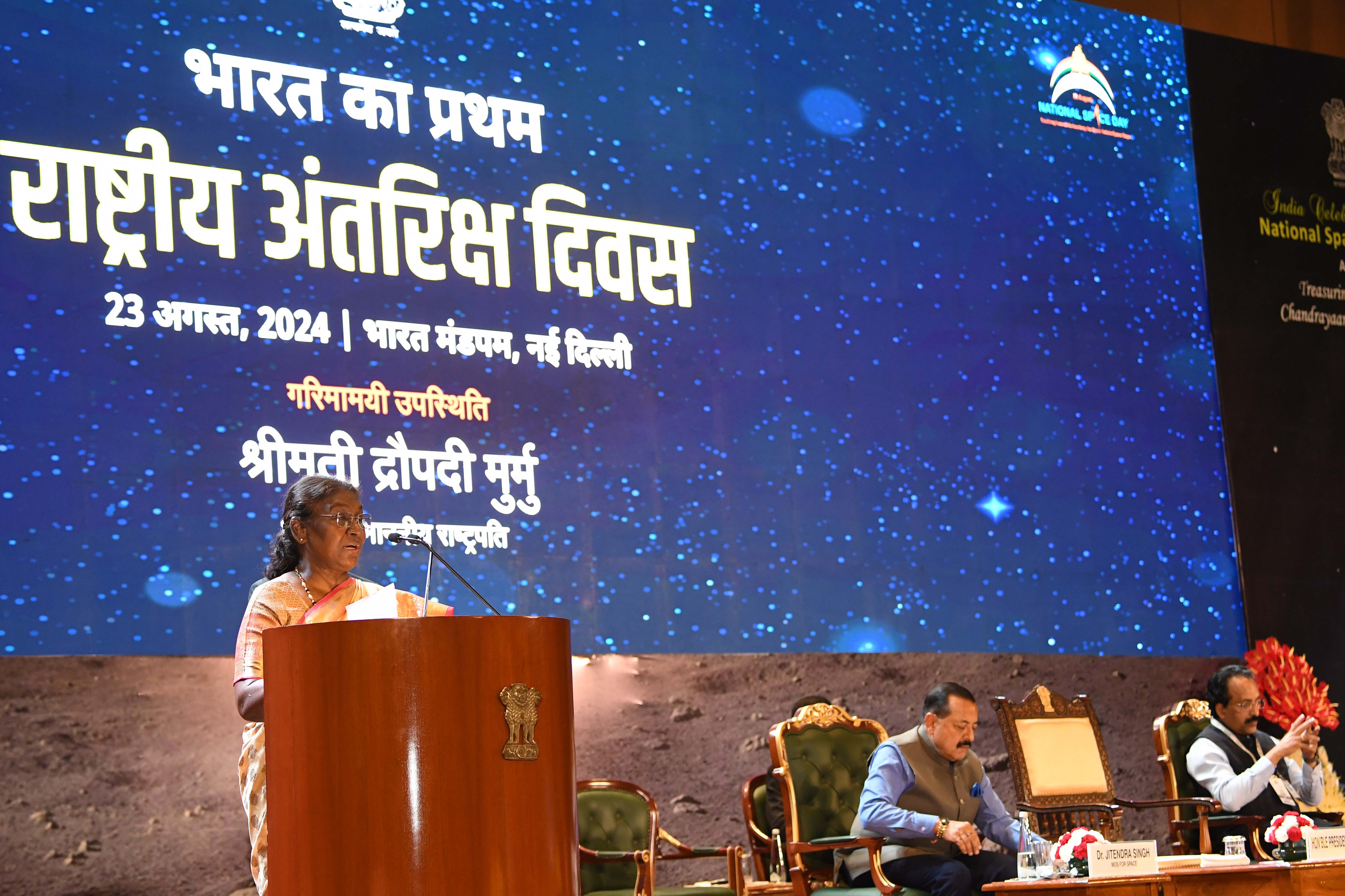 | Caption: | The President of India, Smt. Droupadi Murmu graced the first National Space Day Celebration at Bharat Mandapam in New Delhi on August 23, 2024. |