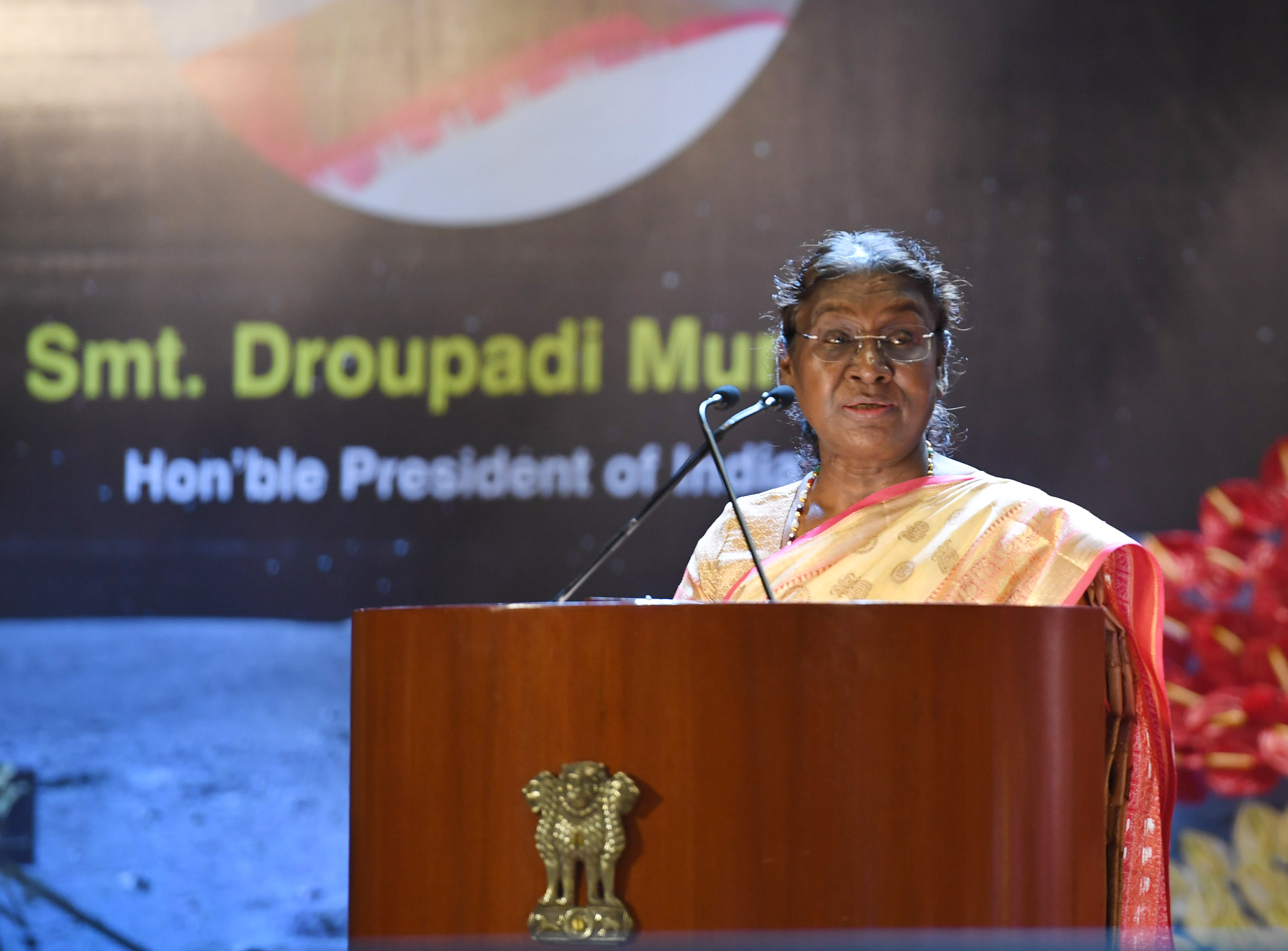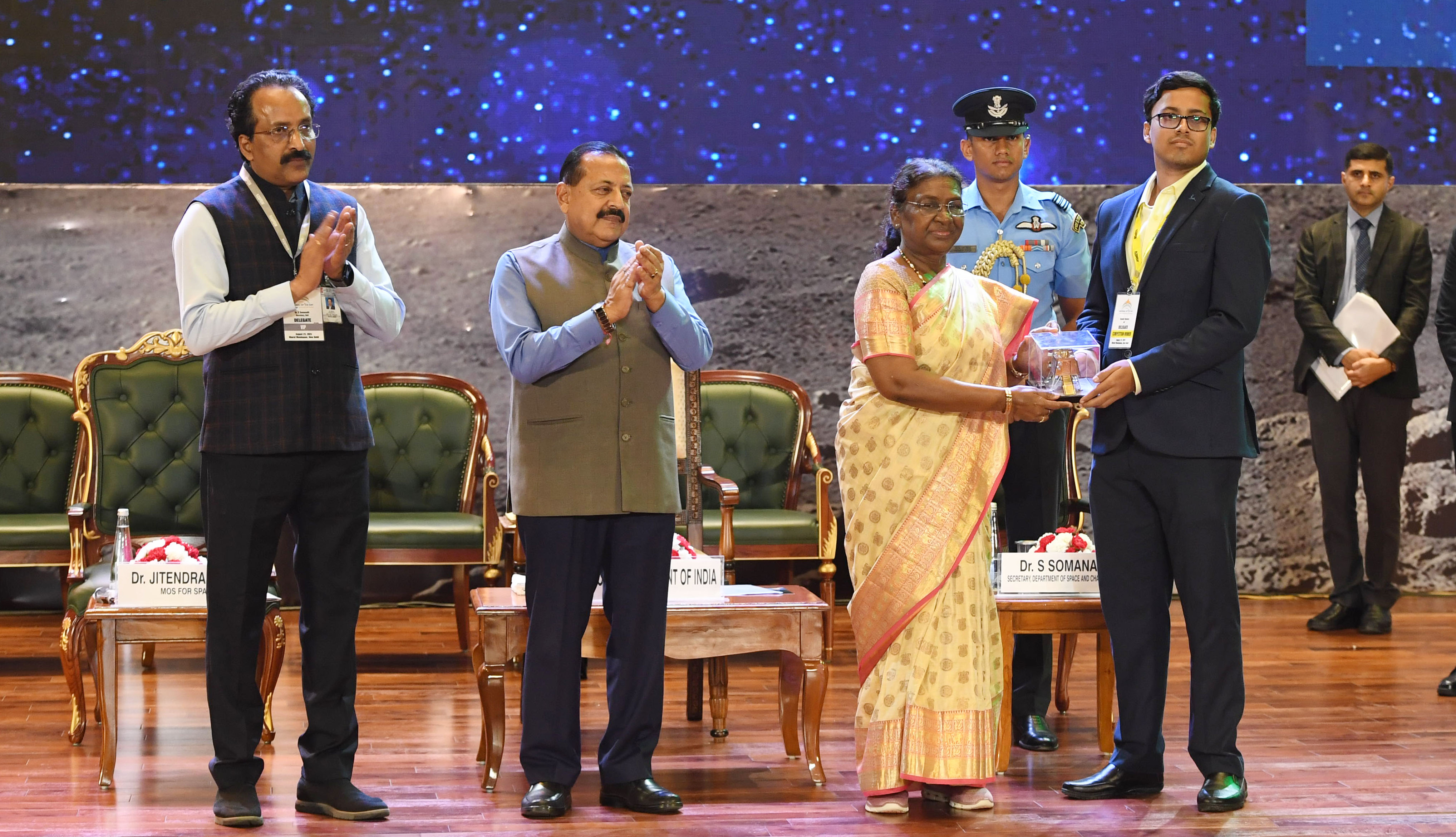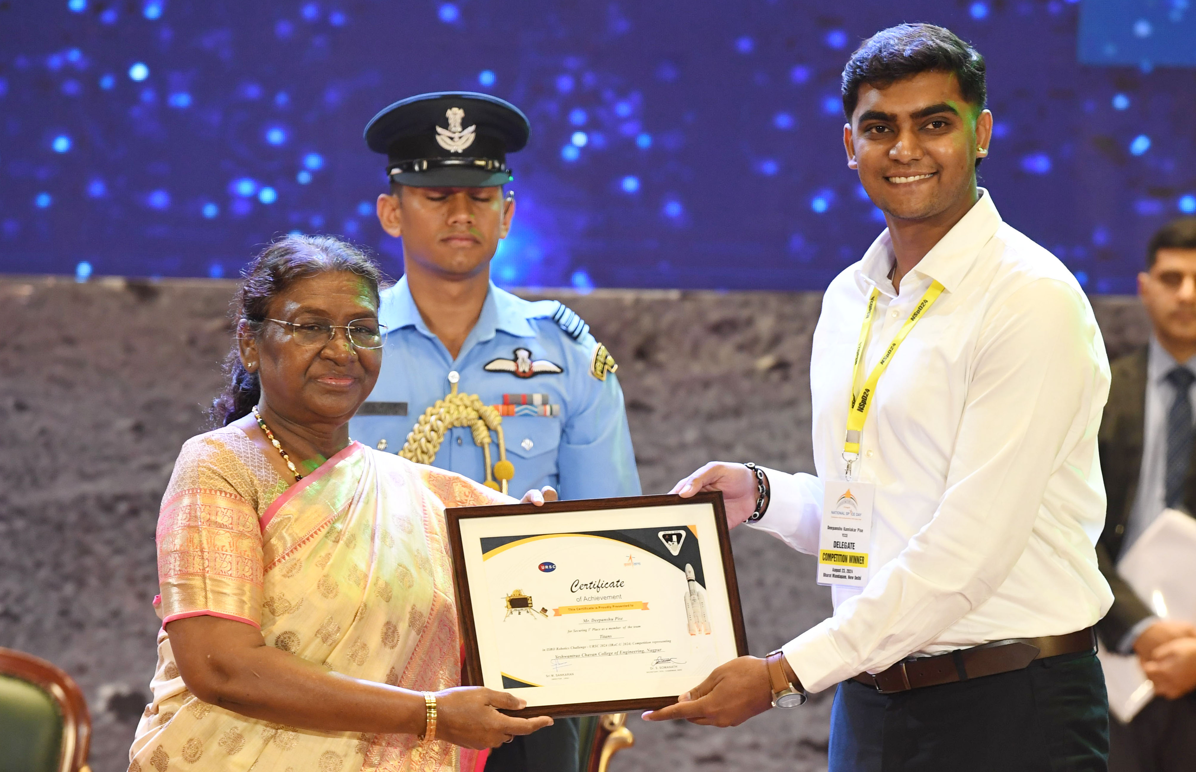 | Caption: | The President of India, Smt. Droupadi Murmu graced the first National Space Day Celebration at Bharat Mandapam in New Delhi on August 23, 2024. |