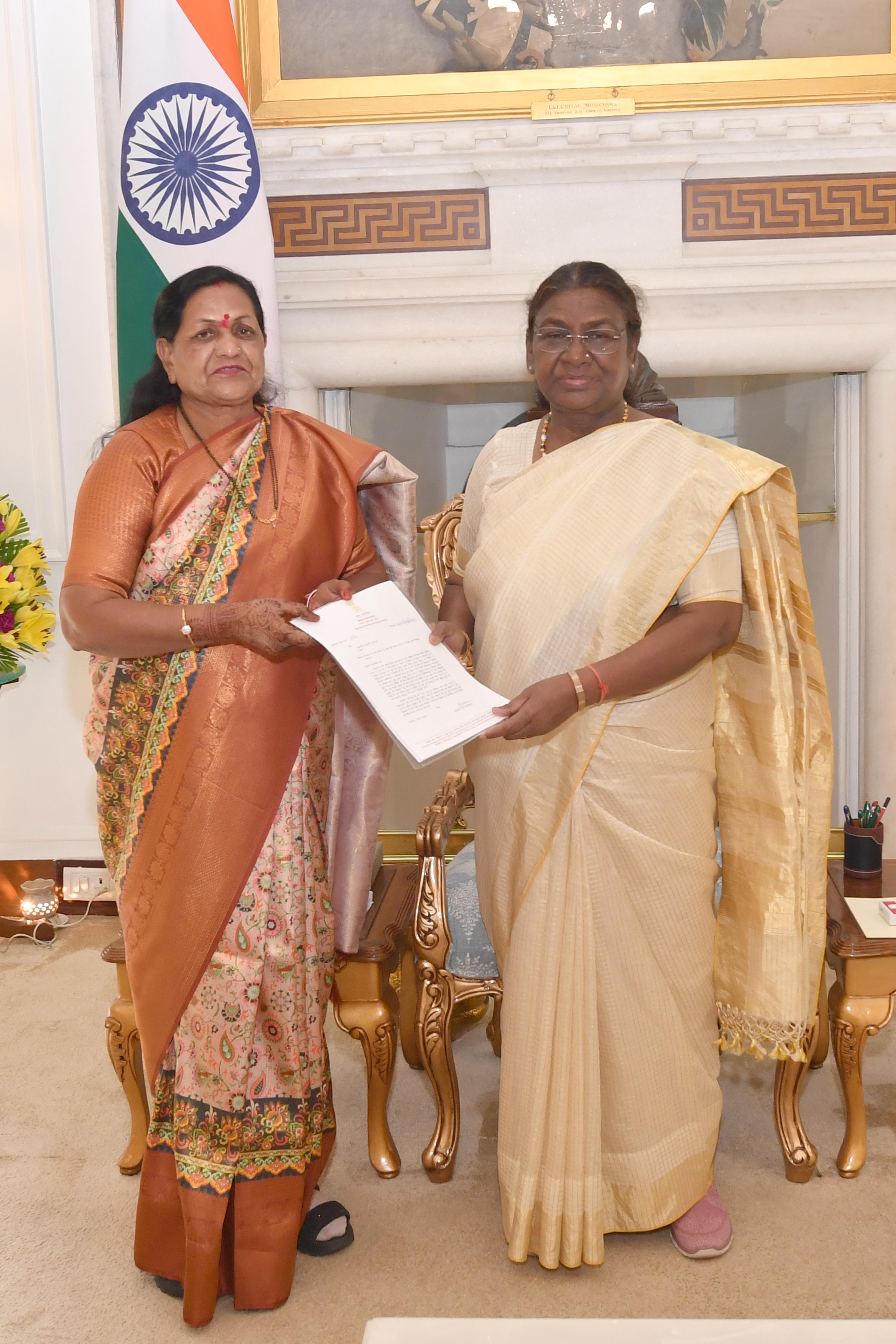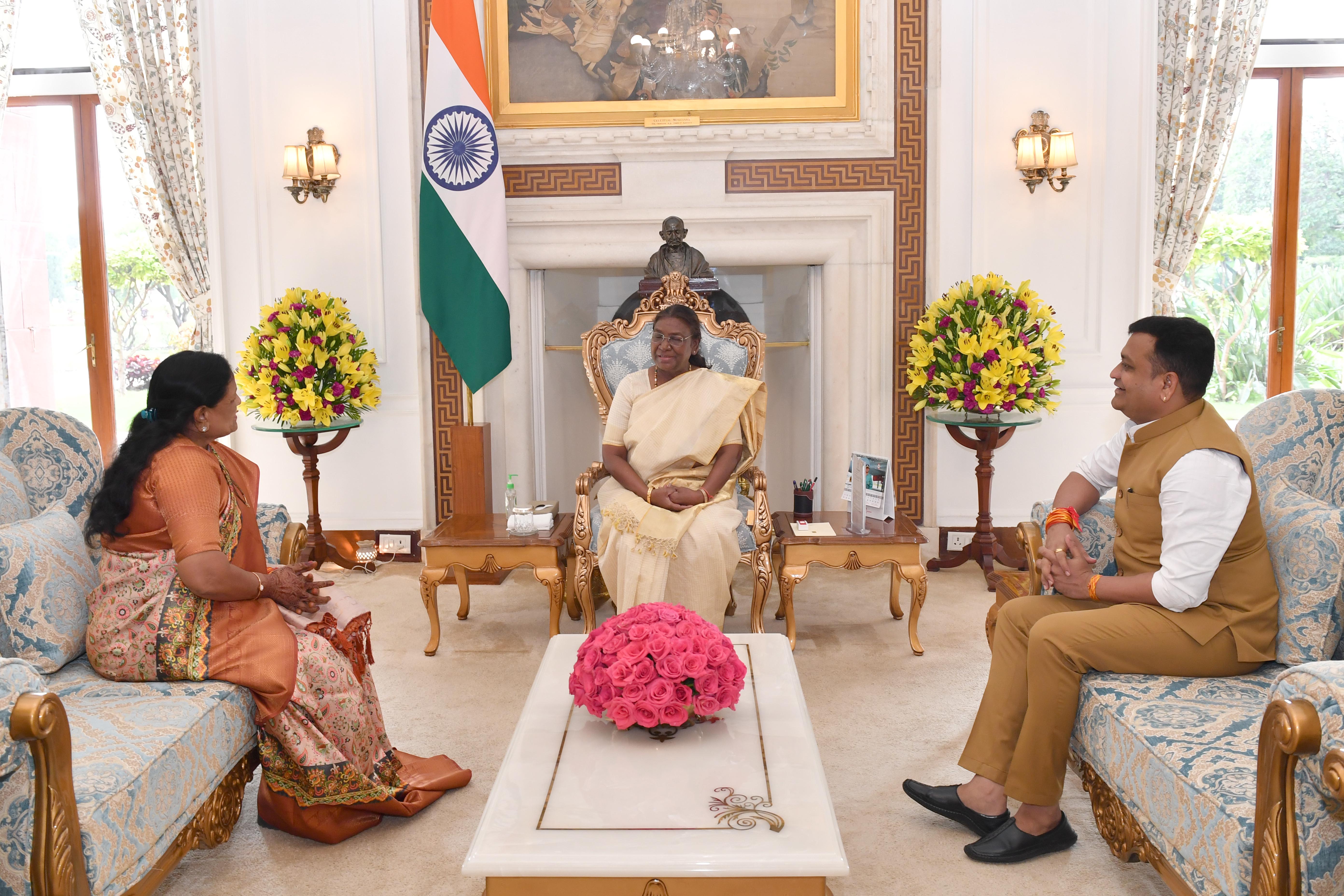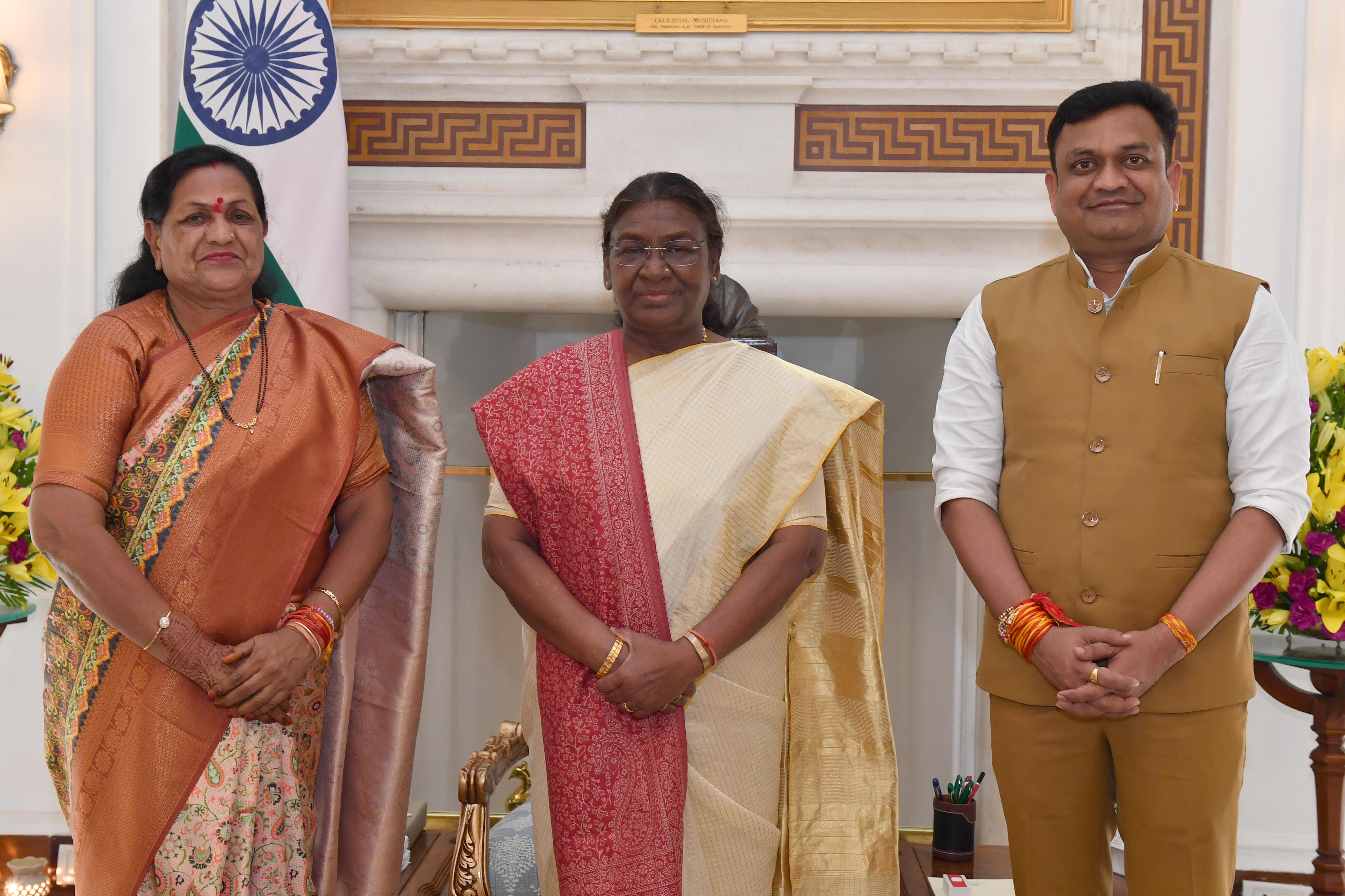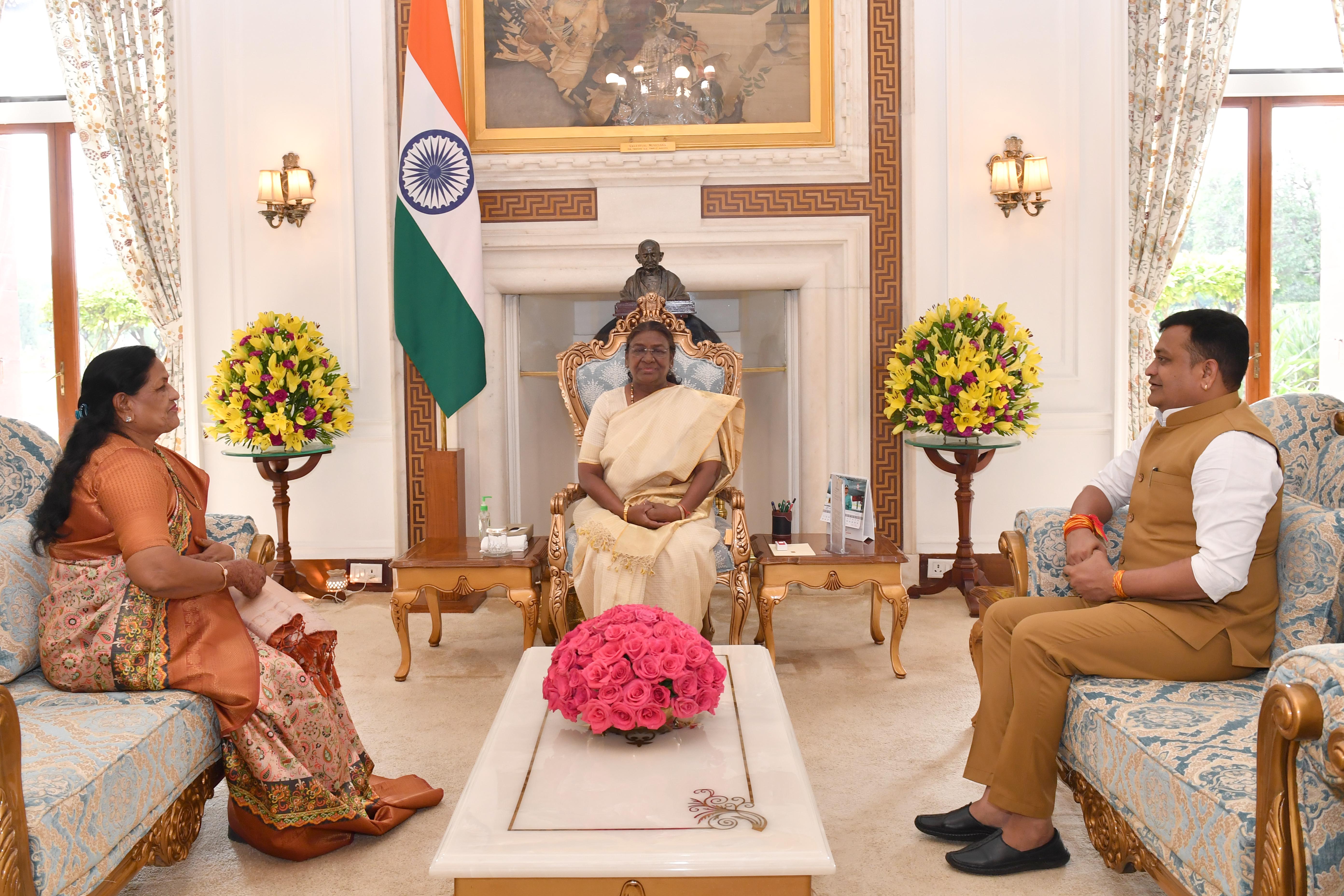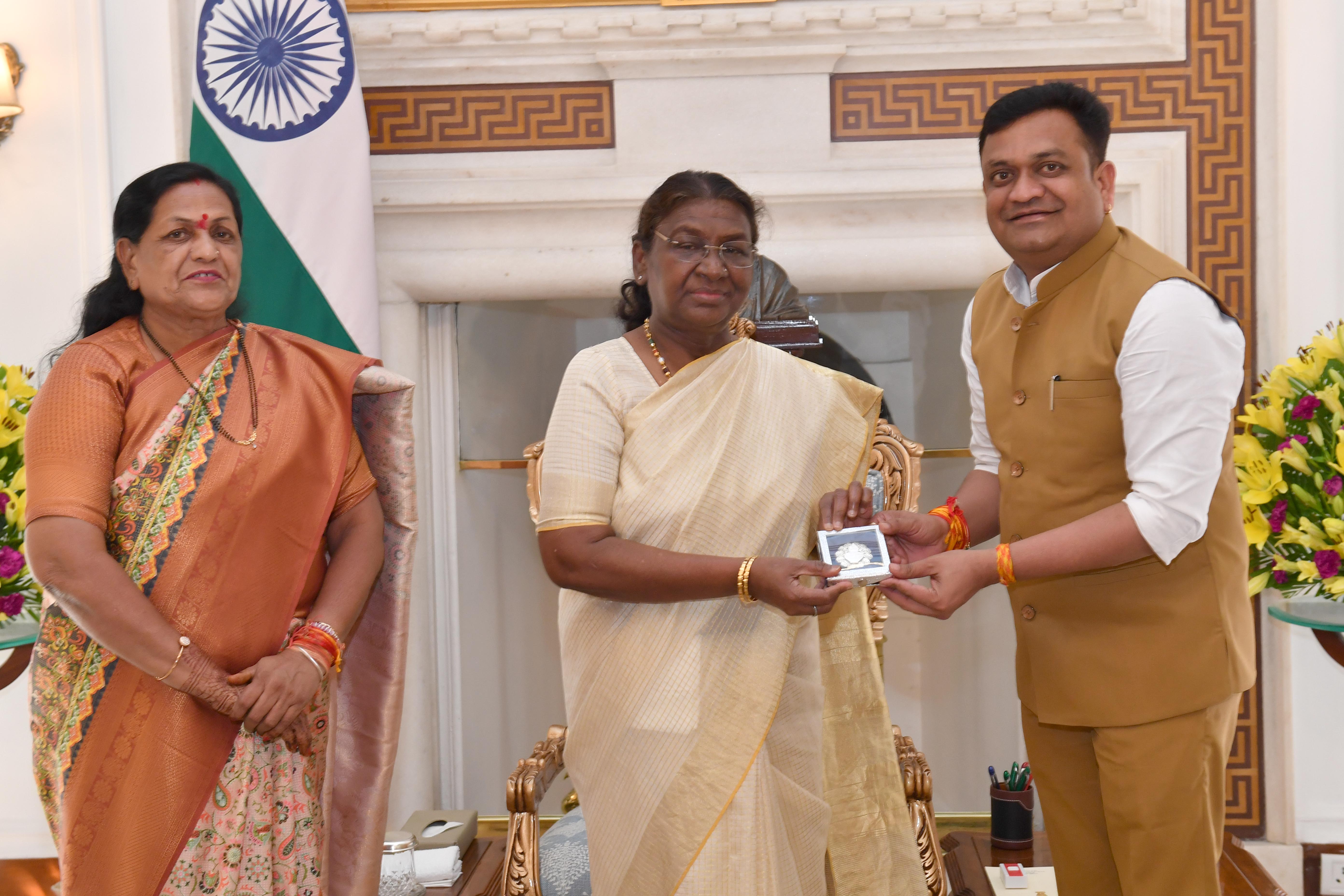 | Caption: | Smt. Maya Naroliya, Member of Parliament (Rajya Sabha) along with son Shri Vikash Naroliya meeting with the President of India Smt. Droupadi Murmu at Rashtrapati Bhavan on August 23, 2024. |
