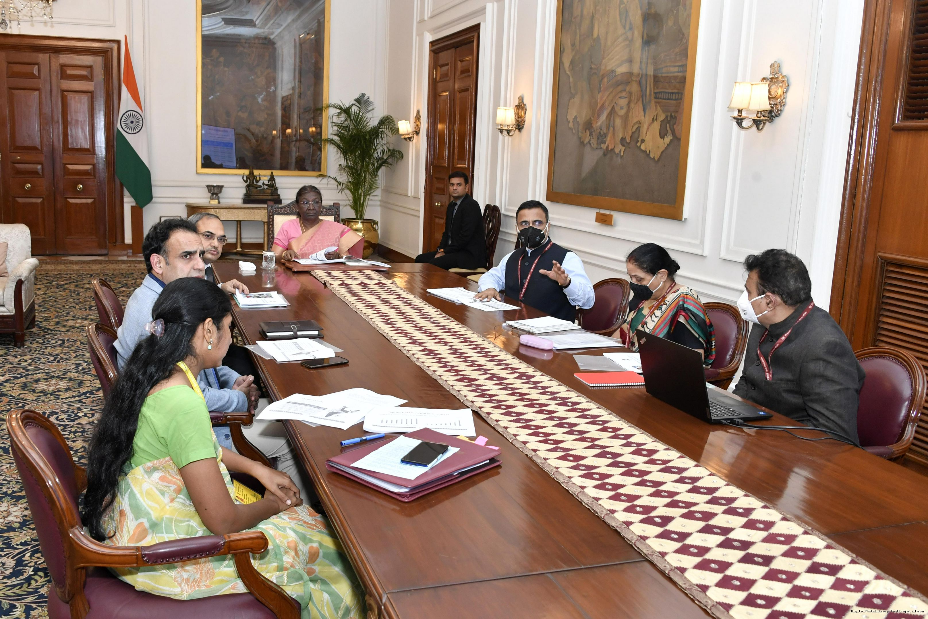 | Caption: | Shri Anil Kumar Jha, Secretary along with others from Ministry of Tribal Affairs meeting with the President of India, Smt. Droupadi Murmu, at Rashtrapati Bhavan on Sep 16, 2022. |