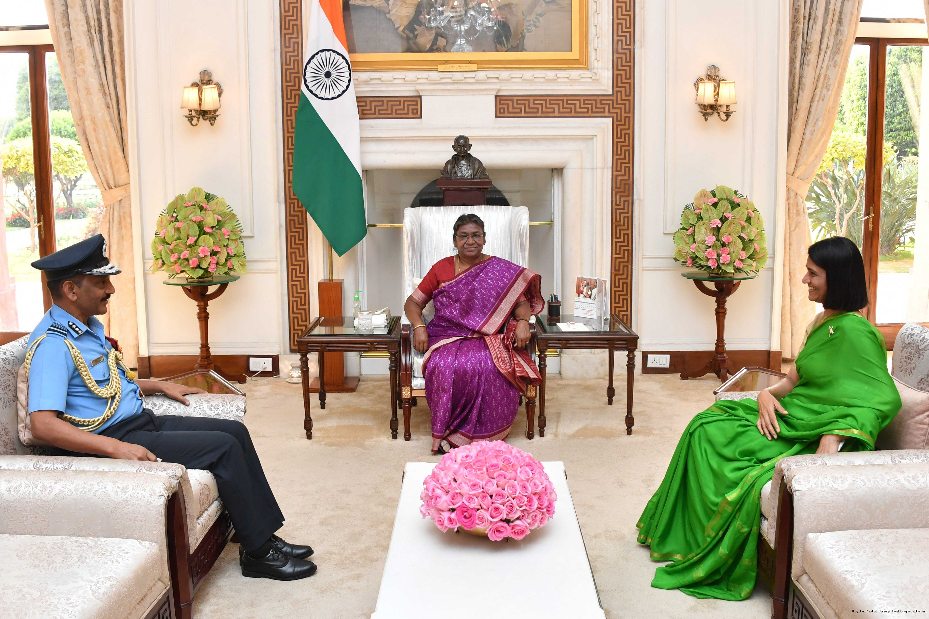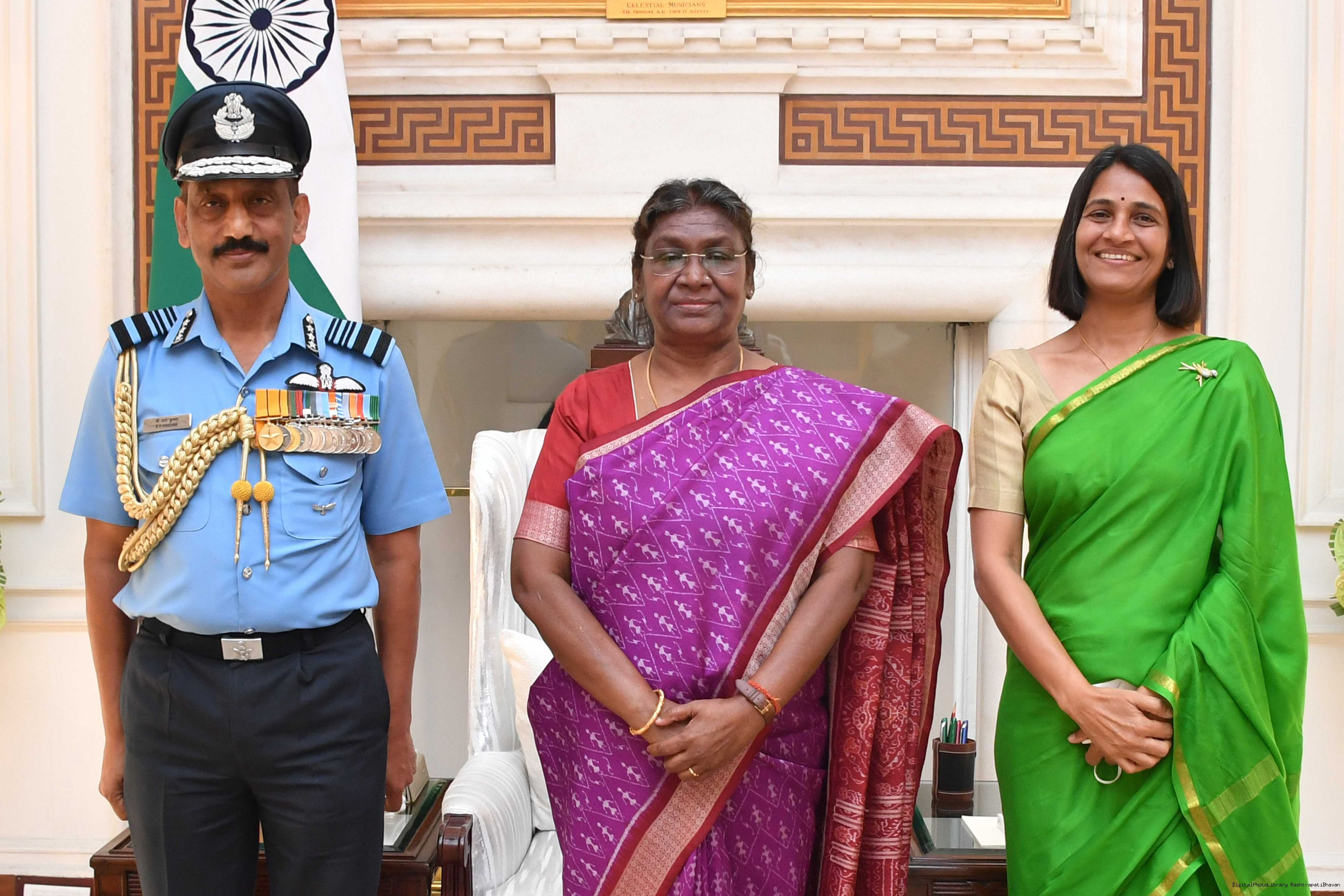 | Caption: | Air marshal BR Krishna PVSM AVSM SC ADC chief of integrated defence staff committe alongwith his wife smt sowrya maduri meeting with the President of India Smt. Droupadi Murmu at Rashtrapati Bhavan on March 25, 2023 |