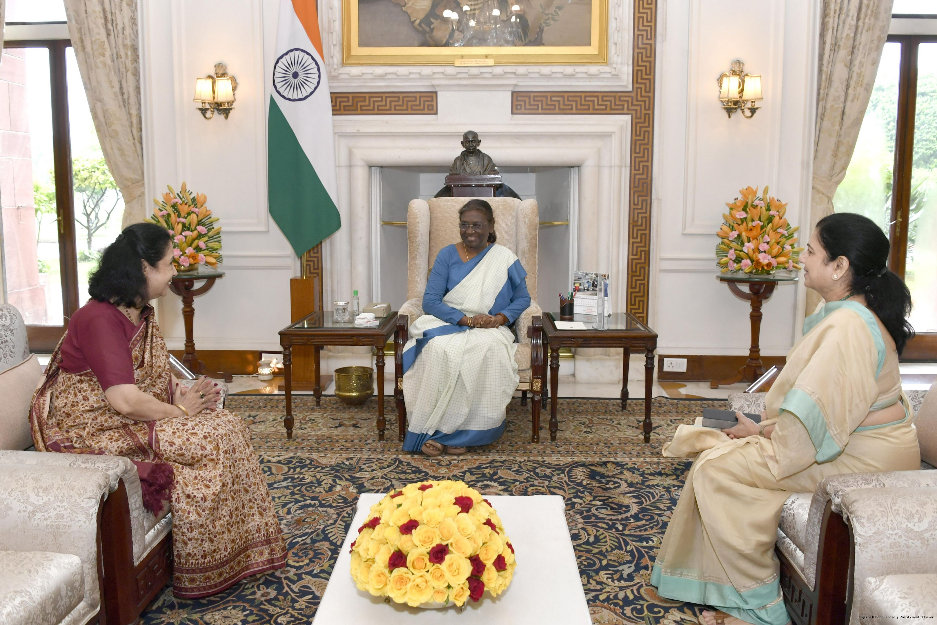 | Caption: | Smt. Justice Abhilasha Kumari, Judicial Member and Smt. Archana Ramasundaram, Member, Lokpal of India meeting with the President of India, Smt. Droupadi Murmu, at Rashtrapati Bhavan on Sep 23, 2022. |