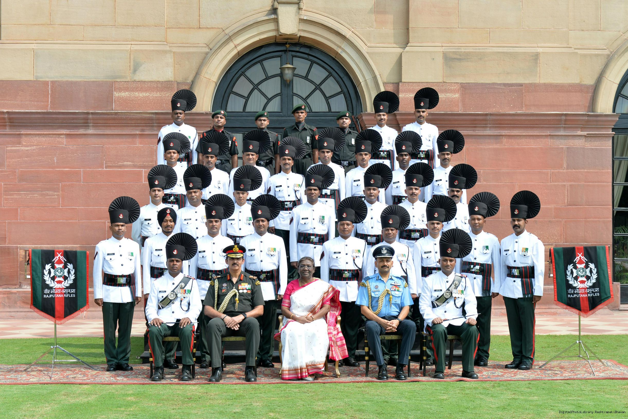 | Caption: | The President of India, Smt. Droupadi Murmu posing a Group Photograph with Military Band of the Raj Rif Regt Centre at Rashtrapati Bhavan on Sep 30, 2022. |