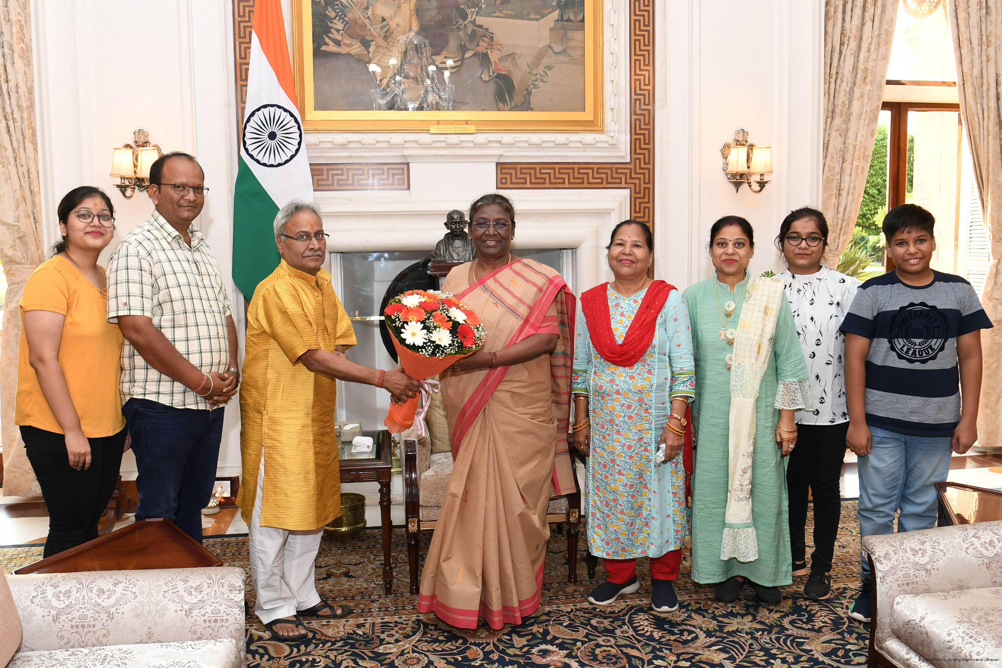 | Caption: | Shri Mahavir Prasad Agarwal from Rairangpur with Others meeting with the President of India, Smt. Droupadi Murmu, at Rashtrapati Bhavan on Oct 06, 2022. |