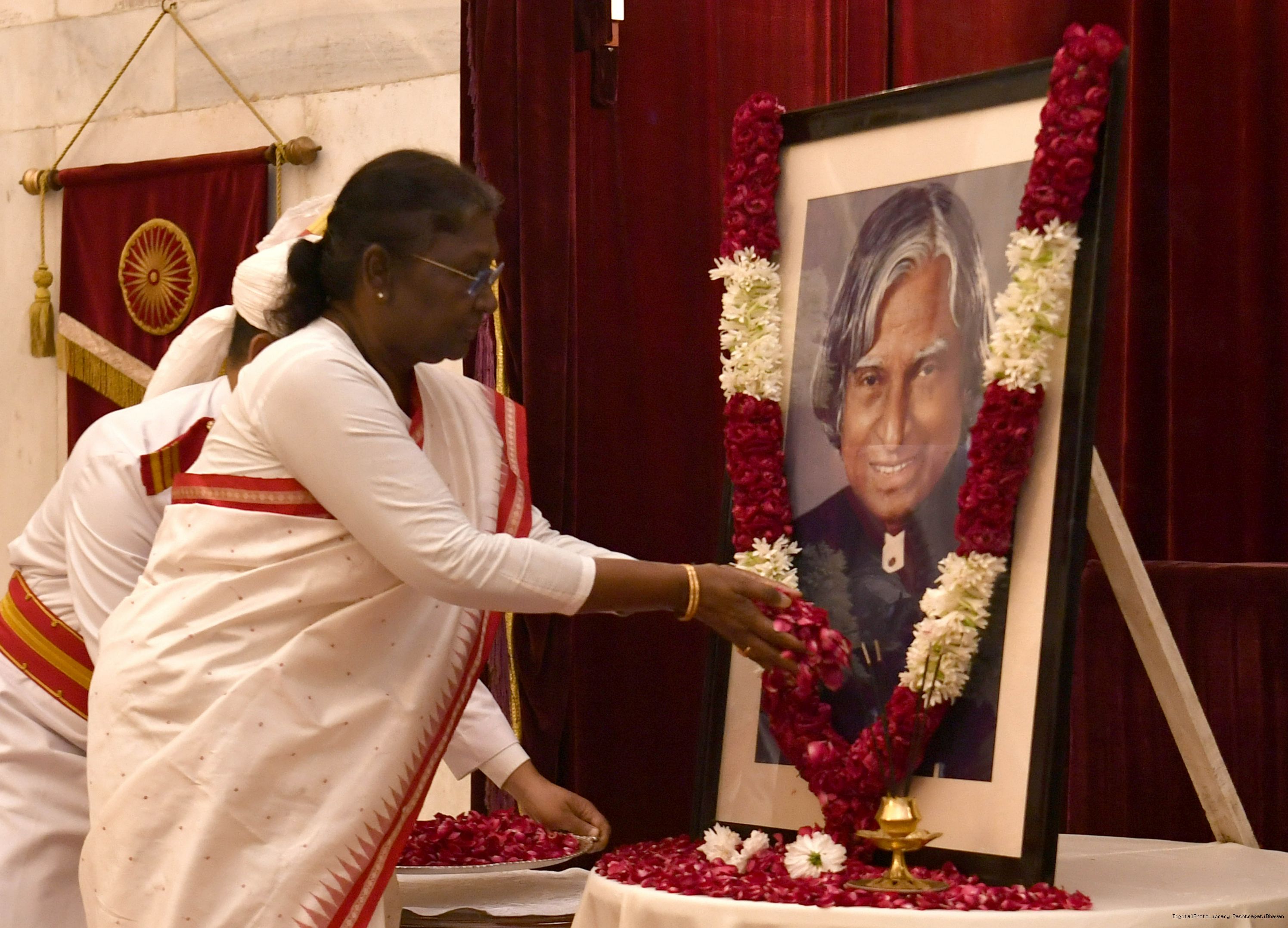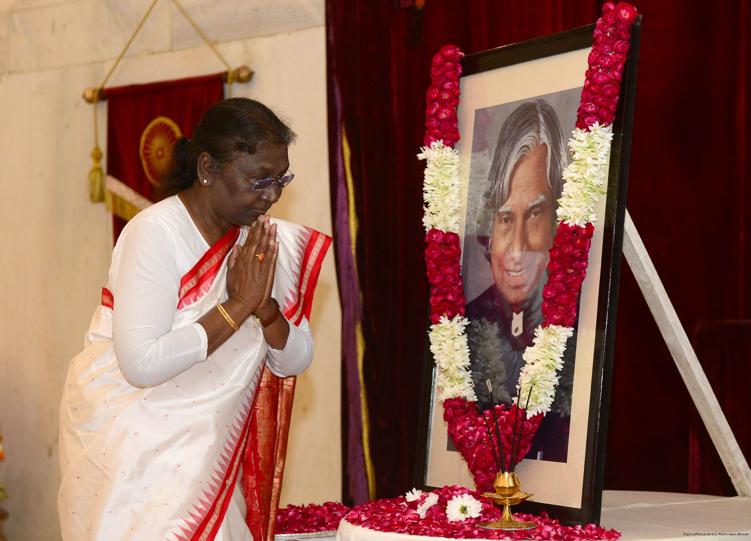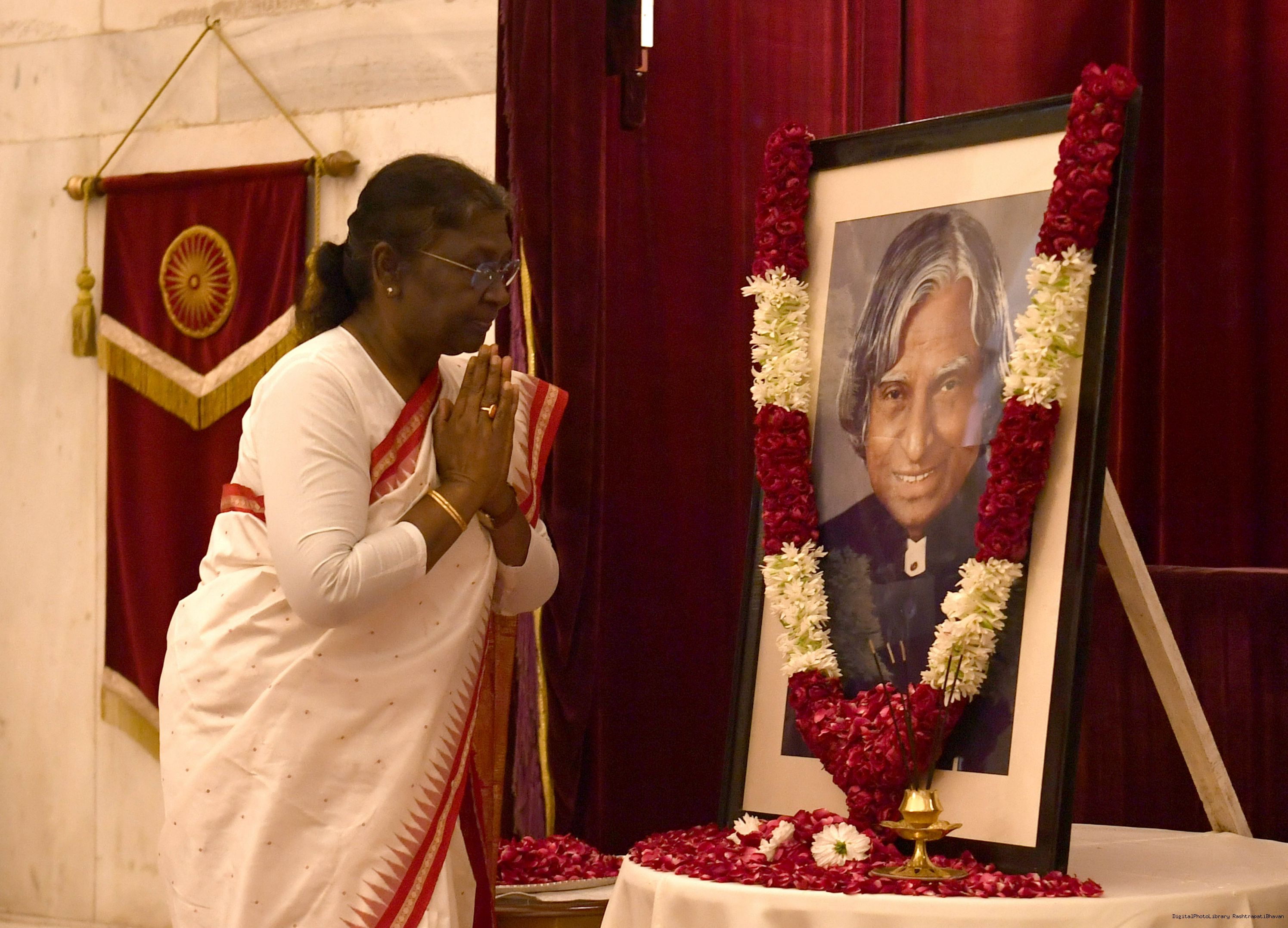 | Caption: | The President of India, Smt. Droupadi Murmu paid floral tributes to Dr. A.P.J. Abdul Kalam, former President of India, on his birth anniversary, at Rashtrapati Bhavan on October 15, 2022. |