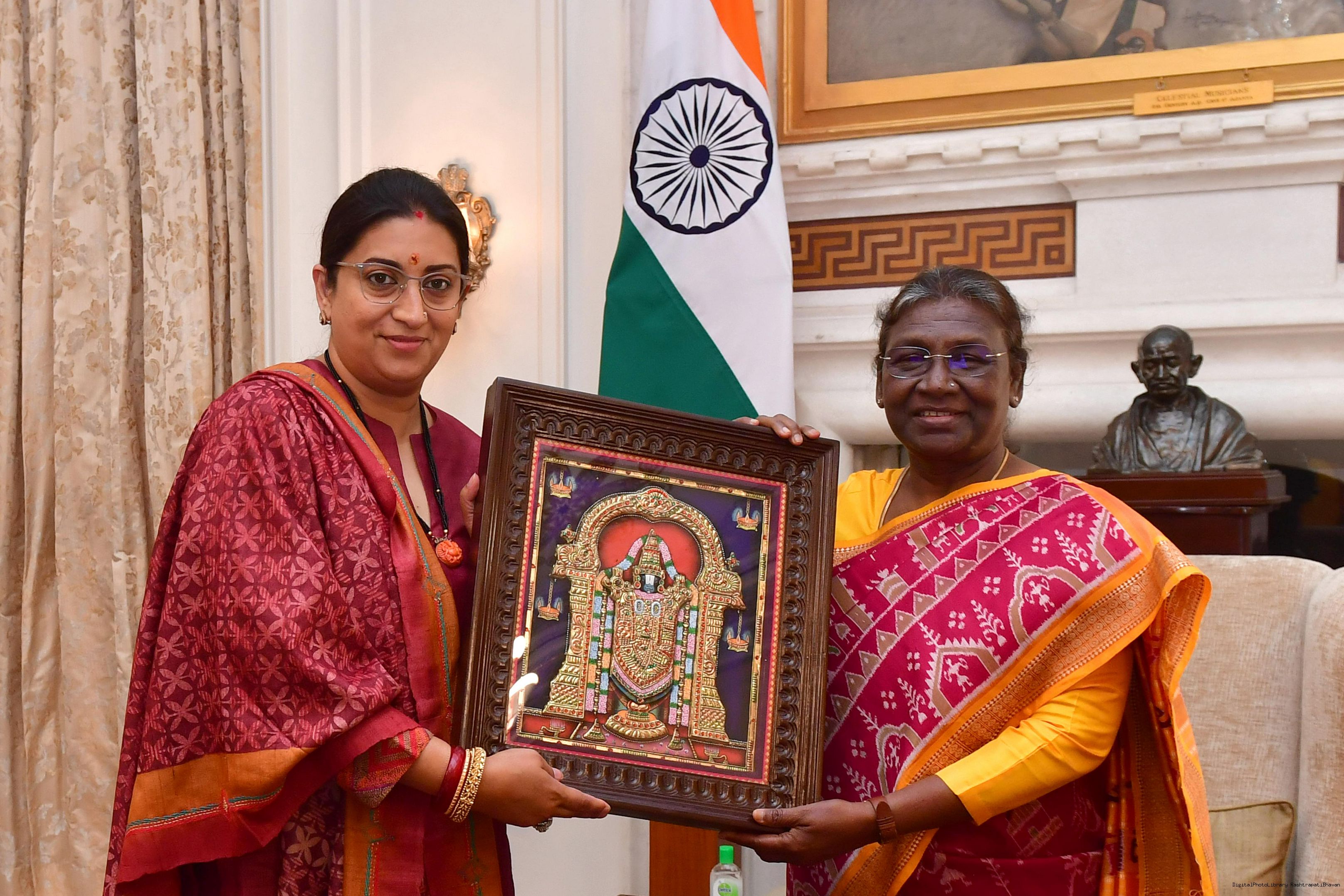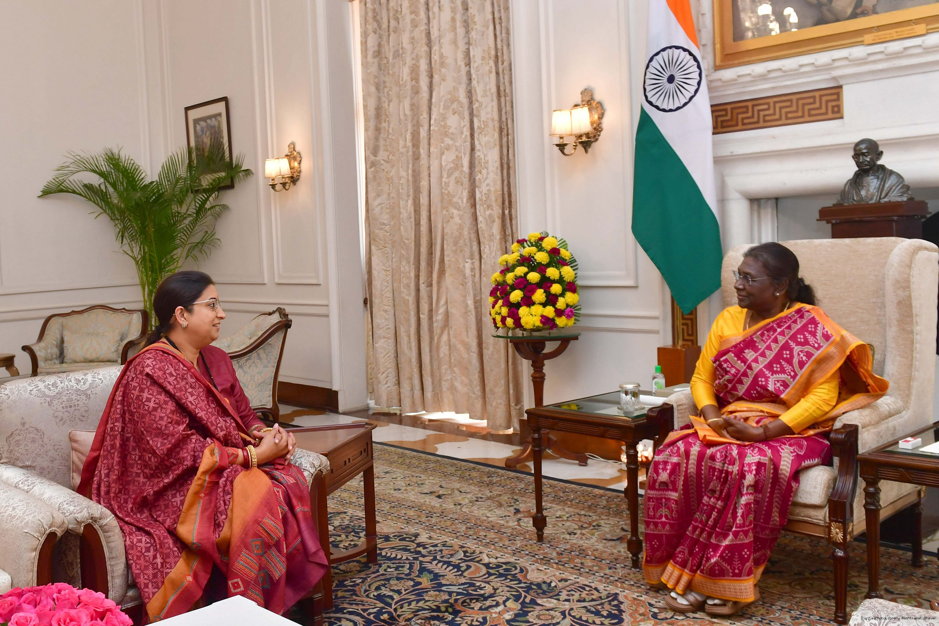 | Caption: | Smt. Smriti Zubin Irani, Minister of Women Child Development and Minority Affairs meeting with the President of India, Smt. Droupadi Murmu, at Rashtrapati Bhavan on Oct 24, 2022. |