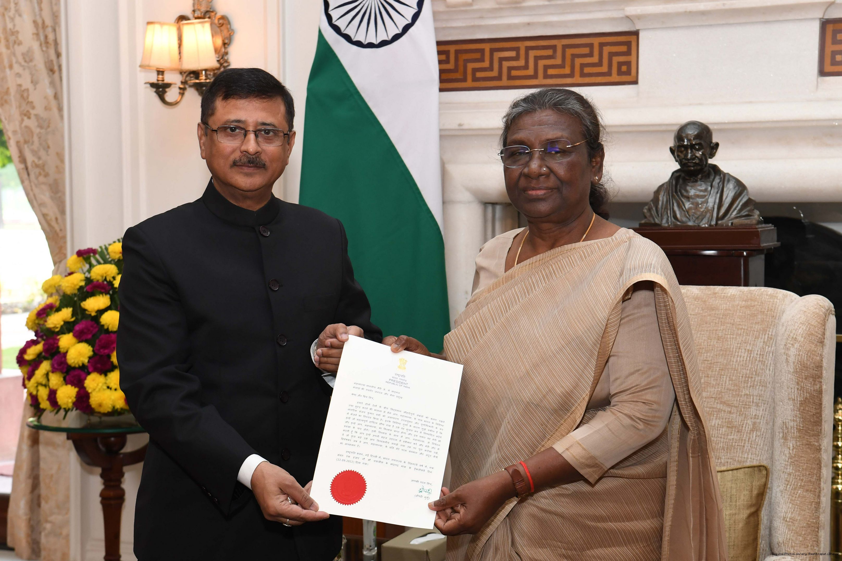 | Caption: | Shri Sanjay Kumar Verma, High Commissioner-designate of India to Canada meeting with the President of India, Smt. Droupadi Murmu, at Rashtrapati Bhavan on Oct 25, 2022. |