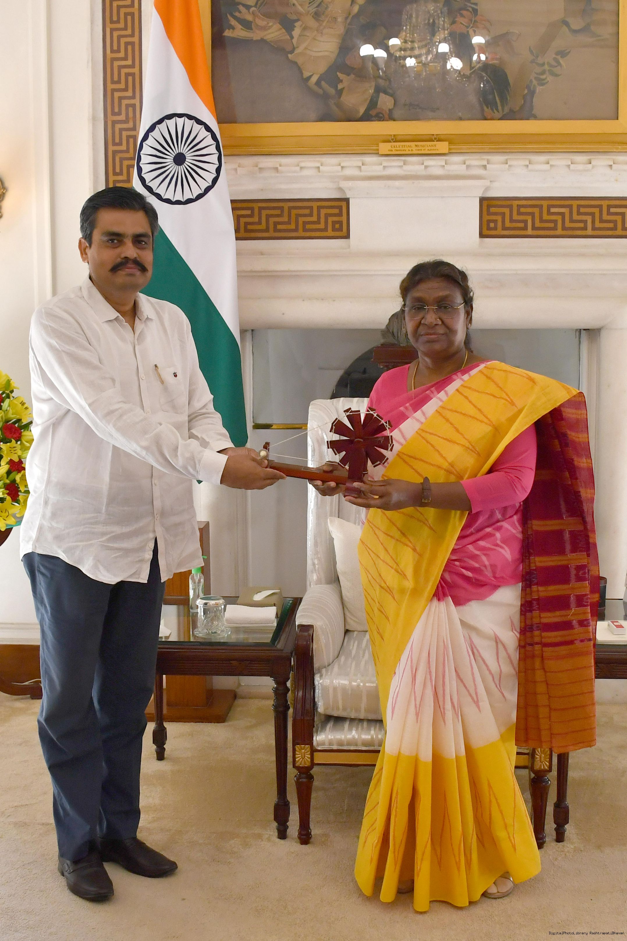 | Caption: | Shri Birupakshya Tripathy, Executive Editor, 'PRAGATIVADI', an Odia Daily meeting with the President of India Smt. Droupadi Murmu at Rashtrapati Bhavan on April 13, 2023. |