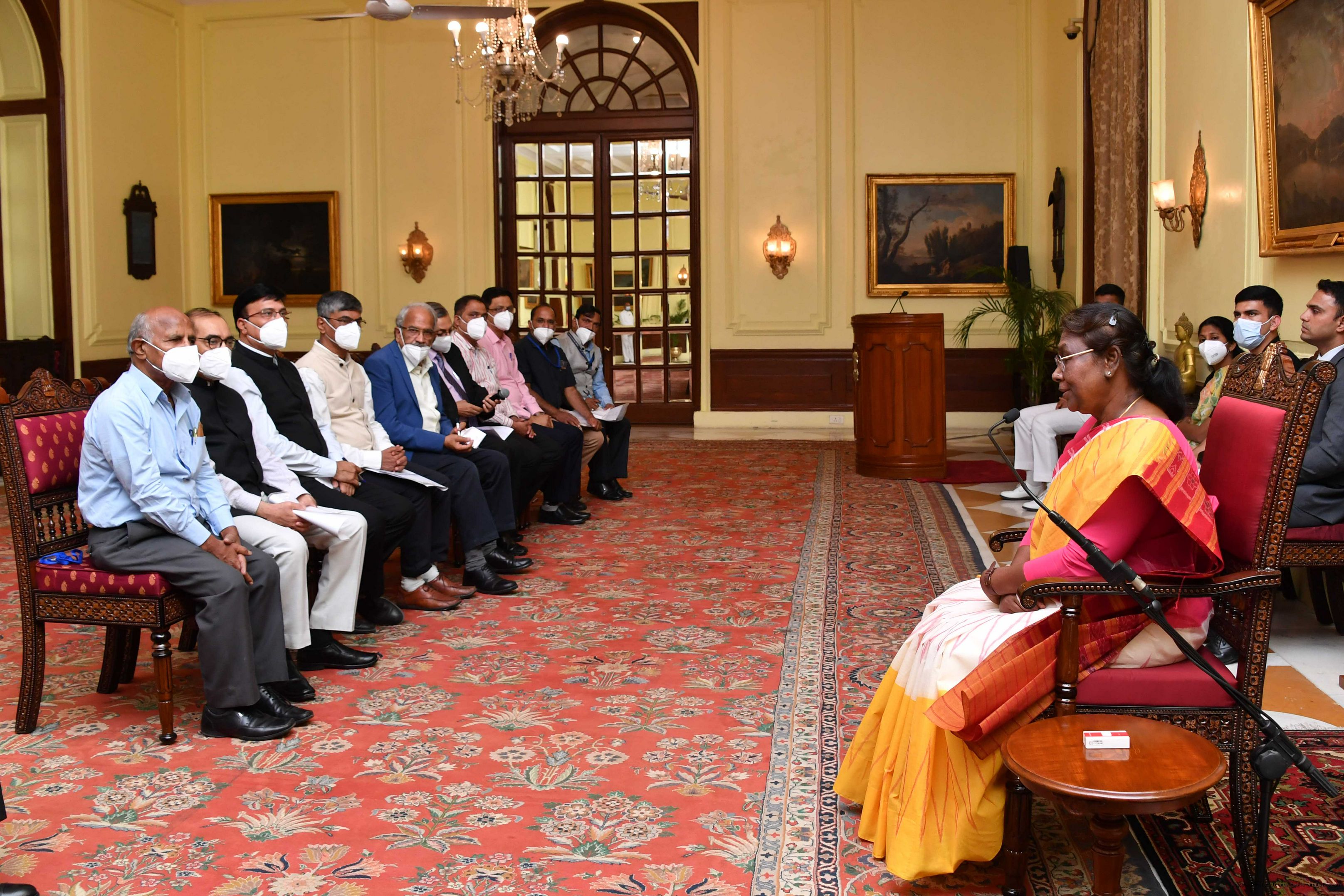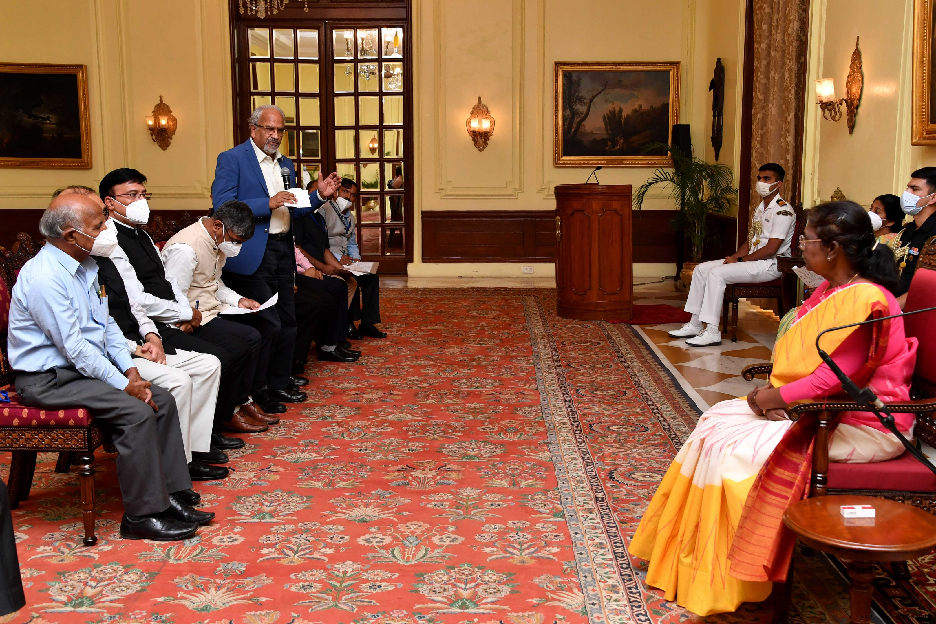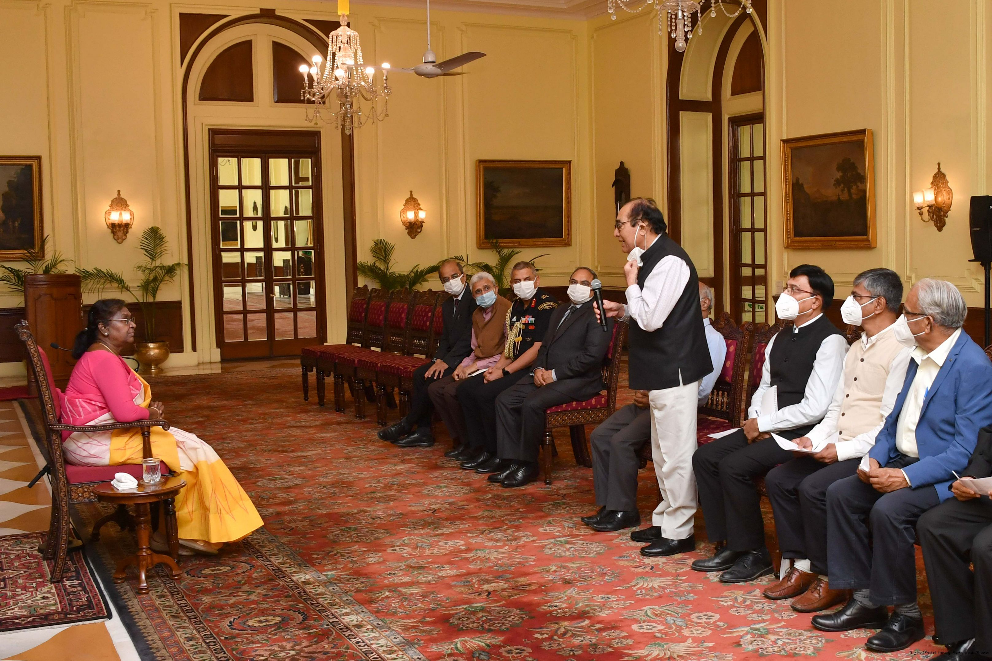 | Caption: | The President of India, Smt Droupadi Murmu presentation of Rapportization Summary of the outcome of the five round table (FINE-2023)[Secretary, ASP, Press Secretary, MSP, Addl. Press Secretary, PSP} at Rashtrapati Bhavan on April 13, 2023 |