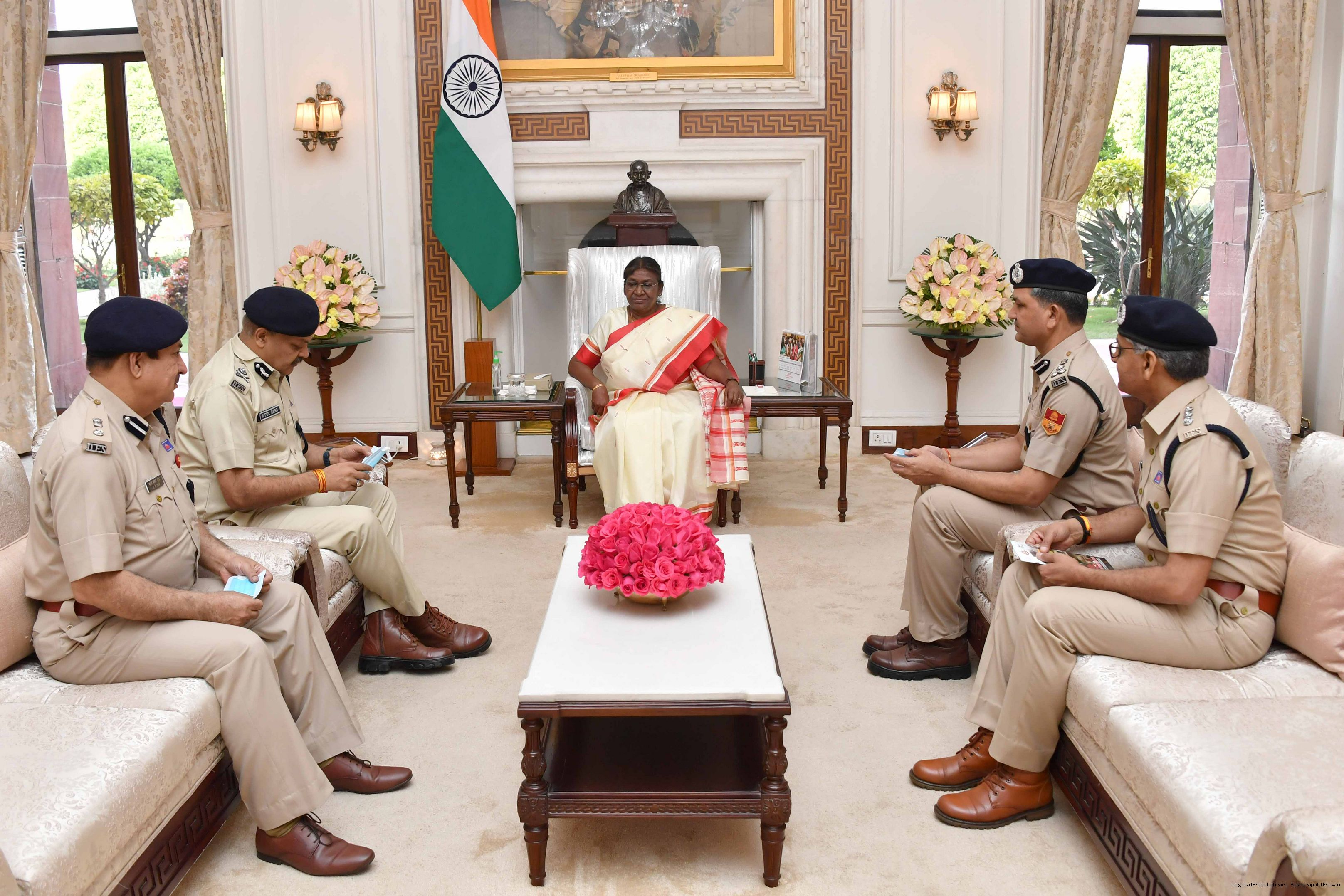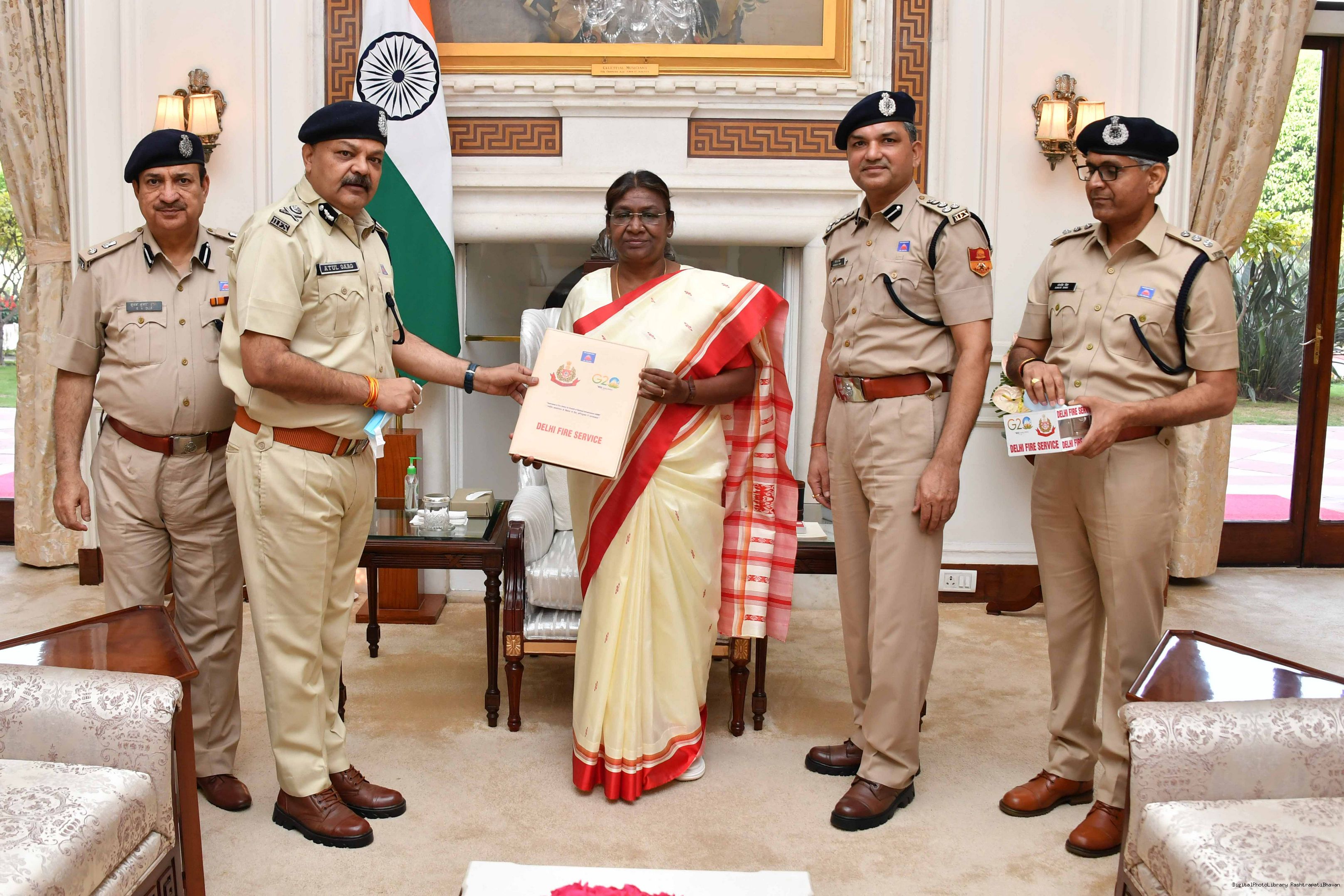 | Caption: | Shri Atul Garg, Director along with others from Delhi Fire Service meeting with the President of India Smt. Droupadi Murmu at Rashtrapati Bhavan on April 14, 2023. |