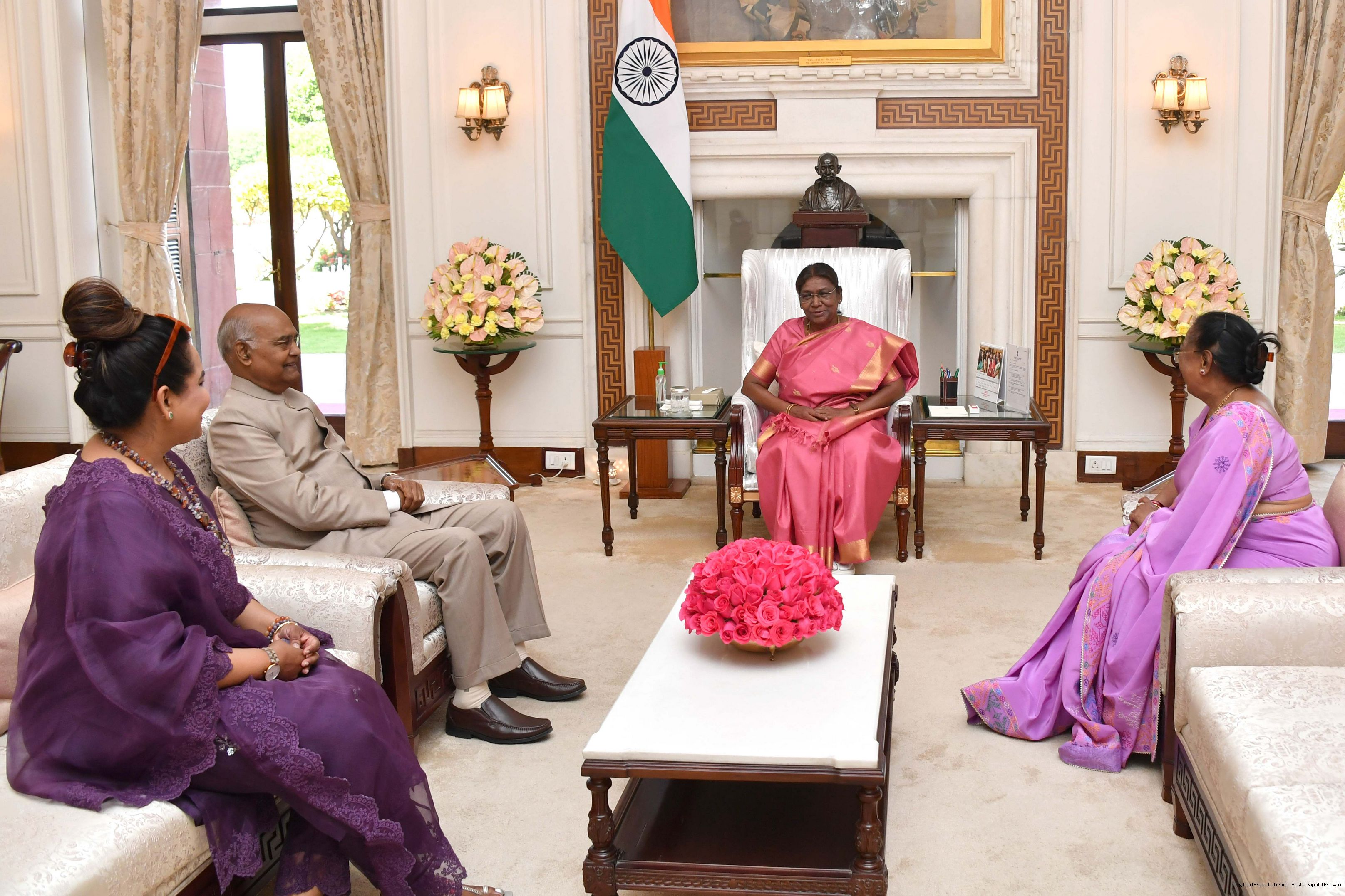 | Caption: | Shri Ram Nath Kovind, Former President of India along with his wife Smt. Savita Kovind and daughter Ms.Swati called on the President of India Smt. Droupadi Murmu at Rashtrapati Bhavan on April 14, 2023. |